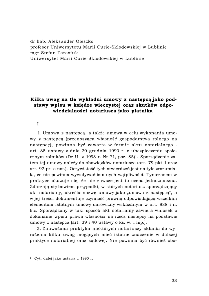 dr hab. Aleksander Oleszko profesor Uniwersytetu Marii Curie-Sklodowskiej w Lublinie mgr Stefan Tarasiuk Uniwersytet Marii Curie-Sklodowskiej w Lublinie Kilka uwag na tle wykładni umowy z następcą jako podstawy wpisu w księdze wieczystej oraz skutków odpowiedzialności notariusza jako płatnika I 1. Umowa z następcą, a także umowa w celu wykonania umowy z następcą (przenosząca własność gospodarstwa rolnego na następcę), powinna być zawarta w formie aktu notarialnego art. 85 ustawy z dnia 20 grudnia 1990 r. o ubezpieczeniu społecznym rolników (Dz.U. z 1993 r. Nr 71, poz. 85)1. Sporządzenie zatem tej umowy należy do obowiązków notariusza (art. 79 pkt 1 oraz art. 92 pr. o not.). Oczywistość tych stwierdzeń jest na tyle zrozumiała, że nie powinna wywoływać istotnych wątpliwości. Tymczasem w praktyce okazuje się, że nie zawsze jest to ocena jednoznaczna. Zdarzają się bowiem przypadki, w których notariusz sporządzający akt notarialny, określa nazwę umowy jako „umowa z następcą", a w jej treści dokumentuje czynność prawną odpowiadającą wszelkim elementom istotnym umowy darowizny wskazanym w art. 888 i n. k.c. Sporządzony w taki sposób akt notarialny zawiera wniosek o dokonanie wpisu prawa własności na rzecz następcy na podstawie umowy z następcą (art. 39 i 40 ustawy o ks. w. i hip.). 2. Zauważona praktyka niektórych notariuszy skłania do wyrażenia kilku uwag mogących mieć istotne znaczenie w dalszej praktyce notarialnej oraz sądowej. Nie powinna być również obo- 1 Cyt. dalej jako ustawa z 1990 r. 33 REJENT Nr 4 - kwiecień 1995 r. jętna dla ston zawierających umowę, a to względem zbywcy, który zawiera umowę przeniesienia własności nieruchomości w celu otrzymania świadczeń emerytalnych oraz nabywcy, któremu nie jest obojętny rodzaj czynności prawnej skutkującej nabycie własności przedmiotu umowy. Wreszcie właściwa kwalifikacja prawna umowy, na podstawie której następuje przeniesienie własności nieruchomości, ma istotne znaczenie dla pobierania przez notariusza podatku od dokonanej czynności notarialnej (art. 7 pr. o not.) i jego ewentualnej z tego tytułu odpowiedzialności. Wypada również rozważyć zakres „związania" sądu wieczystoksięgowego wnioskiem sporządzonym przez notariusza o wpis prawa w księdze wieczystej. Problemy te będą przedmiotem dalszych rozważań. II 1. N a z w a umowy a treść udokumentowanej przez notariusza czynności prawnej. Obowiązki notariusza wynikające z art. 80 pr. o not. Ilekroć dochodzi do rozbieżności między nazwą umowy a j e j treścią, powszechnie przyjmuje się, iż mają w tym wypadku zastosowanie reguły wynikające z art. 65 k.c. Decydujące o zawarciu u m o w y zgodne oświadczenia woli stron (konsensus) zostają złożone wtedy, gdy da się stwierdzić, że oświadczenia mają ten s a m sens, ustalony według właściwych w tym względzie reguł interpretacyjnych, ujętych w szczególności w art. 65 k.c.2 Podzielając w pełni przytoczone stanowisko należy podkreślić, iż z punktu widzenia unormowań wynikających z prawa o notariacie, notariusz dokumentujący w akcie notarialnym daną czynność prawną, akt ten powinien sporządzić w sposób zrozumiały i przejrzysty (art. 80 § 1 pr. o not.). Z drugiej jednak strony wyznaczony przepisem art. 80 pr. o not. obowiązek bezstronności oraz obowiązek wyjaśniająco-doradczy sprawiają, iż ścisłe wyznaczenie granic ingerencji notariusza w kształtowanie treści dokumentowanego stosunku prawnego nie jest praktycznie możliwe, a z pewnością trudno jest tu 2 Por. np. Z. Radwański, [w:] System prawa cywilnego, t. III, cz. 1, Ossolineum 1981, s. 375; tenże, Prawo cywilne - część ogólna, Warszawa 1993, s. 190. 34 Kilka uwag na tle wykładni umowy.. udzielić jednoznacznej, syntetycznej odpowiedzi. Dlatego zawsze aktualny pozostaje problem, w jakim stopniu notariusz pełni funkcję sekretarza rejestrującego oświadczenia stron, nadając tym przejawom woli określoną formę notarialną, w jakim zaś - osoby kształtującej treść stosunku prawnego, czyli „dobrowolnego sędziego" stron3. Notariusz powinien przede wszystkim rozpoznać oczekiwania stron związane z dokonywaną czynnością notarialną. Pozwoli mu to ustalić rzeczywisty zamiar stron i osiągnięcie przez nich określonego rezultatu. Jest to o tyle istotne, że zamiary stron mających dokonać czynności notarialnej mogą być niekiedy realizowane za pomocą różnych czynności, które w różnym stopniu zadośćuczynią rozpoznanemu interesowi stron. Zadaniem notariusza jest wskazanie na te możliwości, z wyjaśnieniem skutków każdej z nich i ustalenie, która z propozycji odpowiada najbardziej słusznemu interesowi stron. Typowym tego przykładem jest możliwość zawarcia umowy na gruncie omawianej ustawy emerytalnej z 1990 r. Z punktu widzenia zbywcy, celem zawarcia umowy jest uzyskanie świadczenia emerytalnego. Zamiarem nabywcy jest „otrzymanie" gospodarstwa rolnego. Jednakże dojście do konsensusu może nastąpić w różny sposób: w drodze zawarcia umowy z następcą, a następnie - w jej wykonaniu - umowy przeniesienia własności (udziału we współwłasności) i posiadania gospodarstwa rolnego na następcę (art. 84 i 85 ustawy z 1990 r.), ale również umowy darowizny lub dożywocia zawieranej w związku z zaprzestaniem prowadzenia działalności rolniczej przez rolnika - zbywcę, który ma ustalone prawo do emerytury lub renty inwalidzkiej 4 . Wydaje się, że jeżeli konsensusem stron nie jest uzyskanie własności gospodarstwa rolnego przez nabywcę, notariusz, rozpoznając t e n zamiar stron, powinien pouczyć zainteresowanych, iż zbywca otrzyma świadczenia emerytalne, jeżeli spełnia przesłanki wskazane w art. 19 ust. 2 pkt 1-3 ustawy emerytalnej z 1990 r. Wystarczy 3 4 Z. Basak, Z zagadnień odpowiedzialności cywilnej notariuszy, „Rejent" 1992, nr 7-8, s. 45; Cz. Salagierski, Prawa i obow