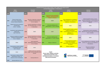 PROGRAM DRUGIEJ EDYCJI SZKOŁY LETNIEJ Z CYKLU "MAMY TYLKO JEDNĄ PLANETĘ" sala Rady Wydziału Biologii, ul. I. Miecznikowa 1 ŚRODA 16.X.2013 godz. CZWARTEK 17.X.2013 godz. PIĄTEK 18.X.2013 godz. 08.00 10.00 Otwarcie Szkoły Letniej. Prof. dr hab. A.Mostowska Dziekan Wydziału Biologii UW 10.00 Warsztaty Audytorskie z Systemów Zarządzania Środowiskowego, dr inż.K. Stephens 10.15 Modernizacja procesu kształcenia przyrodniczego, dr hab. L. Tuszyńska 11.30 Sytuacja środowiskowa na Ukrainie: stan i dynamika zmian, cz I, dr hab. 15.30 N. Demeshkant 11.45 Przydzielenie zadań dydaktycznych doktorantom, mgr B. Gawrońska 13.00 12.15 Praktyczne podejście do Systemów zarządzania środowiskowego, dr inż. K. Stephens 14.00 Sytuacja środowiskowa na Ukrainie: stan i dynamika zmian, cz. II, dr hab. 17.15 N. Demeshkant System gospodarki odpadamikomunalnymi w Wiedniu, 18.45 dr inż.I. Kosińska 13.45 OBIAD 15.30 14.45 Zrównoważony rozwój w praktyce na przykładzie Francji, prof. K. Potyrała 17.00 16.15 KAWA 16.30 Stan prawny w zakresie ochrony ekosystemów w Polsce i na Ukrainie, dr hab. N. Demeshkant 18.00 Dyskusja-doktoranci II rok OBIAD 14.30 17.00 SOBOTA 19.X.2013 godz. OBIAD Warsztaty dydaktyczne dla doktorantów,cz. 1, prof. K. Potyrała Ocena oddziaływania na środowisko 10.00 aktorzy procesu, cz.1, mgr inż. arch. krajobrazu J. Tomaszkiewicz Dyskusja-doktoranci 10.30 Polityka Republiki Czeskiej w zakresie zasobów odnawialnych i nieodnawialnych w zakresie energii jądrowej, cz. 2, prof. M. Švecová 12.15 KAWA 12.00 KAWA KAWA 12.30 Polityka Republiki Czeskiej w zakresie zasobów odnawialnych i nieodnawialnych w zakresie energii jądrowej, cz. 1, prof. M. Švecová 12.15 Zrównoważony rozwój w gospodarce odpadami komunalnymi (część warsztatowa), dr inż. I. Kosińska Warsztaty dydaktyczne dla doktorantów, cz. 2, prof.K. Potyrała 14.45 OBIAD 14.30 OBIAD 15.45 Jak Czesi wypełniają dyrektywy unijne? Jakie są poglądy społeczeństwa w tym zakresie? prof. M. Švecová 15.30 Ocena oddziaływania na środowisko - aktorzy procesu, cz.2., mgr inż. arch. krajobrazu J. Tomaszkiewicz 17.45 Wręczenie certyfikatów Zakończenie szkoły Dyskusja - doktoranci 16.30 18.45 godz. Nowoczesny system gospodarki odpadami - Wycieczka do firmy "Radkom" w Radomiu KAWA Modele uczenia się i nauczania 17.15 biologii i ochrony środowiska, prof.K. Potyrała NIEDZIELA 20.X.2013 Projekt Chemia, fizyka i biologia na potrzeby społeczeństwa XXI wieku; nowe makrokierunki studiów I, II i III stopnia POKL.04.01.01.00-100/10 Dyskusja - doktoranci
