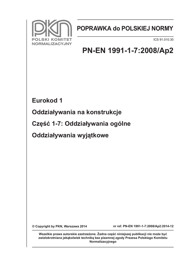 POPRAWKA do POLSKIEJ NORMY ICS 91.010.30 PN-EN 1991-1-7:2008/Ap2 Eurokod 1 Oddziaływania na konstrukcje Część 1-7: Oddziaływania ogólne Oddziaływania wyjątkowe © Copyright by PKN, Warszawa 2014 nr ref. PN-EN 1991-1-7:2008/Ap2:2014-12 Wszelkie prawa autorskie zastrzeżone. Żadna część niniejszej publikacji nie może być zwielokrotniana jakąkolwiek techniką bez pisemnej zgody Prezesa Polskiego Komitetu Normalizacyjnego PN-EN 1991-1-7:2008/Ap2:2014-12 Przedmowa Niniejsza poprawka została opracowana przez KT nr 102 ds. Podstaw Projektowania Konstrukcji Budowlanych i zatwierdzona przez Prezesa PKN dnia 22 grudnia 2014 r. W sprawach merytorycznych dotyczących treści normy można zwracać się do właściwego Komitetu Technicznego lub właściwej Rady Sektorowej PKN, kontakt: www.pkn.pl Treść poprawki 1 Zmienia się Załącznik krajowy NA na poniższy Załącznik krajowy NA (informacyjny) Postanowienia krajowe w zakresie przedmiotowym EN 1991-1-7:2006 NA.1 Postanowienia dotyczące 3.4(1) Przy ustalaniu klas konsekwencji dla budynków zaleca się brać pod uwagę kryteria ogólne podane w Tablicy NA.1 Tablica NA.1 – Minimalne wymagane klasy konsekwencji zniszczenia dla budynków Wielkość obiektu d = max (h lub s) a m Minimalna klasa konsekwencji zniszczenia d ≤ 12 m CC1 (CC2) b 12 m < d ≤ 25 m CC2 25 m < d ≤ 55 m CC2 (CC3) c 55 m < d CC3 a h – wysokość; s – rozpiętość w osiach podpór (lub podwójny wysięg wspornika) b Dla budynków użyteczności publicznej o wyróżniku d ≤ 12 m zaleca się przyjmować klasę CC2. c Dla budynków halowych (przekryć) użyteczności publicznej o rozpiętości s > 25 m zaleca się przyjmować klasę CC3. NA.2 Postanowienia dotyczące pozostałych punktów W odniesieniu do pozostałych punktów wymienionych w Przedmowie – Załącznik krajowy do EN 1991-1-7:2006 przyjmuje się bez zmian postanowienia i wartości zalecane w niniejszym Eurokodzie. 2 PN-EN 1991-1-7:2008/Ap2:2014-12 2 Zmienia się treść Tablicy A.1 oraz UWAGĘ 1 na poniższą: Tablica A.1 – Przyporządkowanie klas konsekwencji Klasa konsekwencji 1 Przykłady przyporządkowania rodzaju budynku i sposobu użytkowania Budynki mające jednego użytkownika, nieprzekraczające 4 kondygnacji. Budynki rolne. Budynki, w których ludzie przebywają rzadko – pod warunkiem, że żadna część budynku, ani strefa gdzie mogą przebywać ludzie, nie znajduje się w odległości mniejszej niż 1½-krotna wysokość danego budynku. 2a Grupa niższego ryzyka Budynki 5-kondygnacyjne mające jednego użytkownika. Hotele nieprzekraczające 4 kondygnacji. Mieszkania, apartamenty i inne budynki mieszkalne nieprzekraczające 4 kondygnacji. Biura nieprzekraczające 4 kondygnacji. Budynki przemysłowe nieprzekraczające 3 kondygnacji. Obiekty handlu detalicznego nieprzekraczające 3 kondygnacji o powierzchni podłogi do 1 000 m2 na każdej kondygnacji. Jednokondygnacyjne budynki szkolne. Wszystkie budynki użyteczności publicznej, nieprzekraczające dwóch kondygnacji, które mają powierzchnię podłogi do 2 000 m2 na każdej kondygnacji. 2b Grupa wyższego ryzyka Hotele, mieszkania, apartamenty i inne budynki mieszkalne wyższe niż 4-kondygnacyjne, ale nieprzekraczające 15 kondygnacji. Budynki szkolne wielokondygnacyjne, ale nieprzekraczające 15 kondygnacji. Obiekty handlu detalicznego wyższe niż 3-kondygnacyjne, ale nieprzekraczające 15 kondygnacji. Szpitale, nieprzekraczające 3 kondygnacji. Biura wyższe niż 4-kondygnacyjne, ale nieprzekraczające 15 kondygnacji. Wszystkie budynki użyteczności publicznej, które mają powierzchnię podłogi przekraczającą 2 000 m2, ale nie większą niż 5 000 m2 na każdej kondygnacji. Parkingi samochodowe nieprzekraczające 6 kondygnacji. 3 Wszystkie budynki nie spełniające kryteriów określonych dla obiektów klasy konsekwencji 2a i 2b, które przekraczają ograniczenia dotyczące powierzchni i liczby kondygnacji. Wszystkie budynki użyteczności publicznej, w których może się gromadzić znaczna liczba ludzi. Stadiony mieszczące więcej niż 5 000 widzów. Budynki, w których przechowuje się niebezpieczne substancje lub prowadzi niebezpieczne procesy. UWAGA 1 Dla budynków przeznaczonych do więcej niż jednego sposobu użytkowania, o różnych klasach konsekwencji zniszczenia, przyjmuje się klasę wyższą. 3