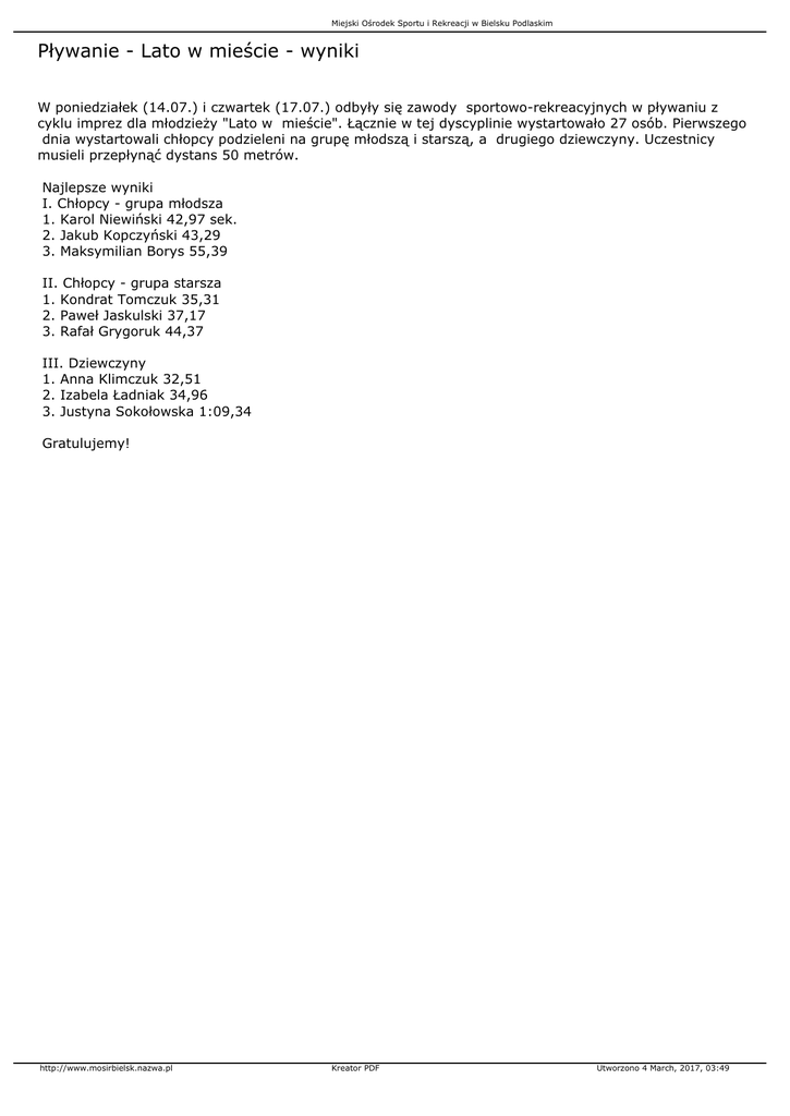 Miejski Ośrodek Sportu i Rekreacji w Bielsku Podlaskim Pływanie - Lato w mieście - wyniki W poniedziałek (14.07.) i czwartek (17.07.) odbyły się zawody sportowo-rekreacyjnych w pływaniu z cyklu imprez dla młodzieży "Lato w mieście". Łącznie w tej dyscyplinie wystartowało 27 osób. Pierwszego dnia wystartowali chłopcy podzieleni na grupę młodszą i starszą, a drugiego dziewczyny. Uczestnicy musieli przepłynąć dystans 50 metrów. Najlepsze wyniki I. Chłopcy - grupa młodsza 1. Karol Niewiński 42,97 sek. 2. Jakub Kopczyński 43,29 3. Maksymilian Borys 55,39 II. Chłopcy - grupa starsza 1. Kondrat Tomczuk 35,31 2. Paweł Jaskulski 37,17 3. Rafał Grygoruk 44,37 III. Dziewczyny 1. Anna Klimczuk 32,51 2. Izabela Ładniak 34,96 3. Justyna Sokołowska 1:09,34 Gratulujemy! http://www.mosirbielsk.nazwa.pl Kreator PDF Utworzono 4 March, 2017, 03:49