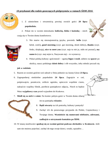 10 przykazań dla rodzin goszczących pielgrzymów w ramach ŚDM 2016 1. Z uśmiechem i otwartością powitaj swoich gości 20 lipca popołudniu. 2. Pokaż im w swoim mieszkaniu lodówkę, łóżko i łazienkę – niech czują się w Twoim domu komfortowo. 3. Nie martw się nieznajomością języka, powiedz: hello (czyt. heloł, cześć), good morning (czyt. gut morning, dzień dobry), thanks (czyt. fenks, dziękuję), nice to meet you (czyt. najs tu mit ju, miło mi poznać), my name is (czyt. maj nejm is, Nazywam się) – to wystarczy. 4. Pokaż polską kulturę i gościnność – ugotuj bigos i rosół, zabierz na spacer po okolicy, naucz polskiego dzień dobry i rób wszystko, żeby młodzi poczuli się jak w rodzinie. 5. Razem ze swoimi gośćmi weź udział w Dniu jedności na Jasnej Górze 23 lipca. 6. Zagospodaruj niedzielne popołudnie 24 lipca. Zagrajcie w coś, pośpiewajcie, potańczcie, zróbcie ognisko, upieczcie wspólnie ciasto, nakręćcie wspólny filmik, poróbcie pamiątkowe zdjęcia,. Niech to będzie Wasz wyjątkowy czas przed wyjazdem do Krakowa. 7. Módl się za nich i z nimi. Na koniec pobytu gości w Twoim domu ofiaruj im na pamiątkę różaniec. 8. Bądź otwarty na ich potrzeby, kulturę i pomysły! 9. Zachęć ich do ponownego przyjazdu do Polski, Częstochowy i Twojego domu. Wymieńcie się numerami telefonów, adresami, zadbajcie o utrzymanie kontaktu po ŚDM. 10. W miarę możliwości spotkaj się ze swoimi gośćmi podczas obchodów w Krakowie. Jeśli sam nie możesz pojechać, zachęć do tego swoje dzieci, wnuki, sąsiadów…