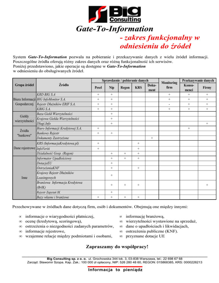Gate-To-Information - zakres funkcjonalny w odniesieniu do źródeł System Gate-To-Information pozwala na pobieranie i przekazywanie danych z wielu źródeł informacji. Poszczególne źródła oferują różny zakres danych oraz różną funkcjonalność ich serwisów. Poniżej przedstawiono, jakie operacje są dostępne w Gate-To-Information w odniesieniu do obsługiwanych źródeł. Grupa źródeł Źródło KRD BIG S.A Biura Informacji BIG InfoMonitor S.A. Gospodarczej Rejestr Dłużników ERIF S.A. KBIG S.A. Baza Giełd Wierzytelności Giełdy Krajowa Giełda Wierzytelności wierzytelności Dlugi.Info Biuro Informacji Kredytowej S.A. Źródła Bankowy Rejestr "bankowe" Dokumenty Zastrzeżone KRS (InformacjaKredytowa.pl) Dane rejestrowe InfoVeriti Działalność Gosp. (Regon) Informator Upadłościowy DotacjeEU OstrzeżeniaKNF Krajowy Rejestr Dłużników Inne Leasingowych Branżowa Informacja Kredytowa (BrIK) Sprawdzenie / pobieranie danych DokuPesel Nip Regon KRS ment + + + + + + + + + + + + + + + + + + + + + + + + + + + + + + + Przekazywanie danych KonsuFirmy menci + + + + + + + + + + + Rejestr Zapytań IK Bazy własne i branżowe Monitoring firm + + + + + + + + + Przechowywane w źródłach dane dotyczą firm, osób i dokumentów. Obejmują one między innymi: • • • • • informacje o wiarygodności płatniczej, ocenę (kredytową, scoringową), ostrzeżenia o niezgodności zadanych parametrów, informacje rejestrowe, wzajemne relacje między podmiotami i osobami, • • • • • informację branżową, wierzytelności wystawione na sprzedaż, dane o upadłościach i likwidacjach, ostrzeżenia publiczne (KNF). przyznane dotacje UE Zapraszamy do współpracy! ____________________________________________________________________________________ Big Consulting sp. z o. o. ul. Grochowska 344 lok. 3, 03-838 Warszawa, tel.: 22 698 67 68 Zarząd: Sławomir Szopa. Kap. Zak.: 100 000 zł opłacony, NIP: 526 280 48 60, REGON: 015868385, KRS: 0000226213 Informacja to pieniądz