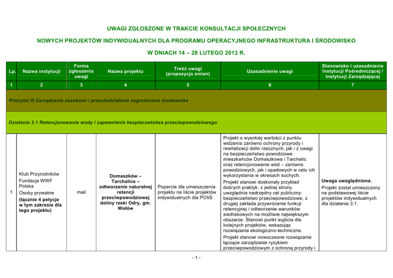 UWAGI ZGŁOSZONE W TRAKCIE KONSULTACJI SPOŁECZNYCH NOWYCH PROJEKTÓW INDYWIDUALNYCH DLA PROGRAMU OPERACYJNEGO INFRASTRUKTURA I ŚRODOWISKO W DNIACH 14 – 28 LUTEGO 2013 R. Lp. Nazwa instytucji Forma zgłoszenia uwagi Nazwa projektu Treść uwagi (propozycja zmian) Uzasadnienie uwagi Stanowisko i uzasadnienie Instytucji Pośredniczącej / Instytucji Zarządzającej 1 2 3 4 5 6 7 Priorytet III Zarządzanie zasobami i przeciwdziałanie zagrożeniom środowiska Działanie 3.1 Retencjonowanie wody i zapewnienie bezpieczeństwa przeciwpowodziowego 1 Klub Przyrodników Fundacja WWF Polska Osoby prywatne (łącznie 4 petycje w tym zakresie dla tego projektu) mail Domaszków – Tarchalice – odtworzenie naturalnej retencji przeciwpowodziowej doliny rzeki Odry, gm. Wołów Poparcie dla umieszczenia projektu na liście projektów indywidualnych dla POIiŚ -1- Projekt o wysokiej wartości z punktu widzenia zarówno ochrony przyrody i rewitalizacji dolin rzecznych, jak i z uwagi na bezpieczeństwo powodziowe mieszkańców Domaszkowa i Tarchalic oraz retencjonowanie wód – zarówno powodziowych, jak i opadowych w celu ich wykorzystania w okresach suchych. Projekt stanowi doskonały przykład dobrych praktyk, z jednej strony uwzględnia nadrzędny cel publiczny: bezpieczeństwo przeciwpowodziowe, z drugiej zakłada przywrócenie funkcji retencyjnej i odtworzenie warunków siedliskowych na możliwie największym obszarze. Stanowi punkt wyjścia dla kolejnych projektów, wskazując rozwiązania ekologiczno-techniczne. Projekt stanowi nowoczesne rozwiązanie łączące zarządzanie ryzykiem przeciwpowodziowym z ochroną przyrody i Uwaga uwzględniona. Projekt został umieszczony na podstawowej liście projektów indywidualnych dla działania 3.1. Lp. Nazwa instytucji Forma zgłoszenia uwagi Nazwa projektu Treść uwagi (propozycja zmian) 1 2 3 4 5 Uzasadnienie uwagi Stanowisko i uzasadnienie Instytucji Pośredniczącej / Instytucji Zarządzającej 6 7 odtwarzaniem naturalnych warunków zalewowych w lasach łęgowych. Realizacja projektu pozostaje w zgodności z: − osiągnięciem celów Ramowej Dyrektywy Wodnej; − Programem Działań Przeciwpowodziowych w Dorzeczu Odry opracowanym przez Międzynarodowa Komisję Ochrony Odry; − założeniami Programu dla Odry 2006. 2 3 Osoba prywatna Osoba prywatna mail Domaszków – Tarchalice – odtworzenie naturalnej retencji przeciwpowodziowej doliny rzeki Odry, gm. Wołów mail Domaszków – Tarchalice – odtworzenie naturalnej retencji przeciwpowodziowej doliny rzeki Odry, gm. Propozycja zmiany w treści uzasadnienia realizacji projektu zapisu z „...dobrego funkcjonowania obszaru Natura 2000 „Łęgi Odrzańskie”" na ”...projekt ma znaczenie dla właściwego stanu przedmiotów ochrony w dwóch obszarach Natura 2000 Łęgi Odrzańskie PLH020018 i PLB020008 co zostało uwzględnione w projektach planów zadań ochronnych dla obydwu obszarów opracowywanych przez RDOŚ we Wrocławiu" Realizacja projektu wskazana jest jako podstawowy element koncepcji realizacji programu odtwarzania dwóch typów siedlisk przyrodniczych -2- Projekt o dużym znaczeniu społecznym i ekologicznym z uwagi na realizację w miejscu katastrofy (pęknięcie wału przeciwpowodziowego), jak również ze względów ekologicznych – regeneracja siedlisk przyrodniczych (łęgowych) i siedlisk gatunków. Zmiana zapisu uwzględnia obecne znaczenie przedsięwzięcia i terminologię zgodną z używaną w służbach ochrony przyrody. Projekt przyczynia się do ochrony obszarów istotnych dla Unii Europejskiej. Realizacja projektu przyczyni się do: 1. znaczącej poprawy stanu ochrony siedlisk przyrodniczych chronionych w granicach obszarów Natura 2000 OSO i SOO „Łęgi Odrzańskie” (w szczególności lasów łęgowych – 91F0, Projekt przyczynia się do kompensacji zmian w środowisku spowodowanych zabudową hydrotechniczną rzeki. Lp. Nazwa instytucji Forma zgłoszenia uwagi 1 2 3 Nazwa projektu Treść uwagi (propozycja zmian) Uzasadnienie uwagi Stanowisko i uzasadnienie Instytucji Pośredniczącej / Instytucji Zarządzającej 7 4 5 6 Wołów zniszczonych w związku z budową stopnia wodnego Malczyce na rzece Odrze grądów –9170 i starorzeczy – 3150); 2. wdrożenia programu kompensacji przyrodniczej służącej odtworzeniu powierzchni siedlisk przyrodniczych (lasów łęgowych 91F0 i grądów 9170) zniszczonych w związku z budową stopnia wodnego Malczyce (zgodnie z warunkami określonymi w decyzji o środowiskowych uwarunkowaniach dla budowy stopnia wodnego Malczyce na rzece Odrze, wydanej przez Burmistrza Miasta i Gminy Wołów 22.01.2009 r., znak: WIR.ET.7625/20/7,08/06). Priorytet VII Transport przyjazny środowisku Działanie 7.1 Rozwój transportu kolejowego 4 5 6 Klub Przyrodników Klub Przyrodników Klub Przyrodników Pozytywna opinia Wsparcie dla transportu kolejowego jest względnie najkorzystniejsze dla środowiska. Uwaga uwzględniona. Projekt został umieszczony na podstawowej liście projektów indywidualnych dla działania 7.1. Uwaga uwzględniona. Projekt został umieszczony na podstawowej liście projektów indywidualnych dla działania 7.1. Uwaga uwzględniona. Projekt został umieszczony na podstawowej liście mail Odnowa taboru kolejowego do obsługi połączeń międzywojewódzkich mail Modernizacja 57 wagonów osobowych wraz z zakupem i modernizacją 6 używanych lokomotyw elektrycznych Pozytywna opinia Wsparcie dla transportu kolejowego jest względnie najkorzystniejsze dla środowiska. mail Wyposażenie zaplecza technicznego Spółki "Przewozy Regionalne" w Pozytywna opinia Wsparcie dla transportu kolejowego jest względnie najkorzystniejsze dla środowiska. -3- Lp. Nazwa instytucji Forma zgłoszenia uwagi 1 2 3 Nazwa projektu Treść uwagi (propozycja zmian) Uzasadnienie uwagi 4 5 6 infrastrukturę służącą do utrzymania kolejowego taboru pasażerskiego 7 Samorząd Województwa Pomorskiego mail pismo Pomorska Kolej Metropolitalna Etap I – 