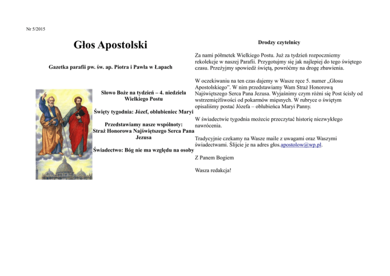 Nr 5/2015 Głos Apostolski Gazetka parafii pw. św. ap. Piotra i Pawła w Łapach Słowo Boże na tydzień – 4. niedziela Wielkiego Postu Święty tygodnia: Józef, oblubieniec Maryi Drodzy czytelnicy Za nami półmetek Wielkiego Postu. Już za tydzień rozpoczniemy rekolekcje w naszej Parafii. Przygotujmy się jak najlepiej do tego świętego czasu. Przeżyjmy spowiedź świętą, powróćmy na drogę zbawienia. W oczekiwaniu na ten czas dajemy w Wasze ręce 5. numer „Głosu Apostolskiego”. W nim przedstawiamy Wam Straż Honorową Najświętszego Serca Pana Jezusa. Wyjaśnimy czym różni się Post ścisły od wstrzemięźliwości od pokarmów mięsnych. W rubryce o świętym opisaliśmy postać Józefa – oblubieńca Maryi Panny. W świadectwie tygodnia możecie przeczytać historię niezwykłego Przedstawiamy nasze wspólnoty: nawrócenia. Straż Honorowa Najświętszego Serca Pana Jezusa Tradycyjnie czekamy na Wasze maile z uwagami oraz Waszymi świadectwami. Ślijcie je na adres gł[email protected]. Świadectwo: Bóg nie ma względu na osoby Z Panem Bogiem Wasza redakcja! Słowo boże na tydzień – 4. niedziela Wielkiego Postu rok B Jezus chciał te wszystkie błędy sprostować. To nie Prawo daje zbawienie, lecz Syn Człowieczy, wywyższony na krzyżu. Ale żeby to zbawienie Ewangelia wg św. Jana (J 3, 14-21) przyjąć, trzeba z wiarą spojrzeć na Krzyż, czyli zaufać Jezusowi Jezus powiedział do Nikodema: «Jak Mojżesz Chrystusowi, Zbawicielowi, Synowi Bożemu. Starotestamentalna figura wywyższył węża na pustyni, tak potrzeba, by miedzianego węża, którego widok ratował przed śmiercią od jadowitego wywyższono Syna Człowieczego, aby każdy, kto w ukąszenia, pozwala zrozumieć dobrze zadanie Jezusa i rolę wiary. Właśnie Niego wierzy, miał życie wieczne. Tak bowiem Bóg umiłował świat, że Syna wiara pozwala przyjąć ratunek przyniesiony przez Jezusa. Ratunek jest swego Jednorodzonego dał, aby każdy, kto w Niego wierzy, nie zginął, ale dany każdemu, ale nie każdy potrafi go przyjąć i zeń skorzystać, bo nie miał życie wieczne. Albowiem Bóg nie posłał swego Syna na świat po to, każdy ma wiarę. aby świat potępił, ale po to, by świat został przez Niego zbawiony. Kto wierzy w Niego, nie podlega potępieniu; a kto nie wierzy, już został Bóg chce zbawić każdego człowieka, bo każdego kocha. Jego miłość nie potępiony, bo nie uwierzył w imię Jednorodzonego Syna Bożego. jest teorią – przybrała ona konkretne kształty: Syna Bożego wywyższonego A sąd polega na tym, że światło przyszło na świat, lecz ludzie bardziej na krzyżu. Jest to miłość trudna, miłość przebaczająca i ofiarna. Ale trzeba umiłowali ciemność aniżeli światło: bo złe były ich uczynki. Każdy bowiem, tę miłość przyjąć i z zaufaniem odpowiedzieć na nią – i to się właśnie kto się dopuszcza nieprawości, nienawidzi światła i nie zbliża się do nazywa wiara. światła, aby nie potępiono jego uczynków. Kto spełnia wymagania prawdy, zbliża się do światła, aby się okazało, że jego uczynki są dokonane w A więc nie: wierzę, że Bóg istnieje, lecz: wierzę, że Bóg mnie kocha! A Bogu». skoro tak, to nie mogę wobec tej miłości pozostać obojętny, muszę na nią odpowiedzieć przez swoją miłość. Jeśli to zrozumiemy i zaakceptujemy, Komentarz, ks. Mariusz Pohl nie będziemy mieli problemów, czy można być „wierzącym” i nie Jest to chyba jeden z najbardziej brzemiennych treścią fragmentów praktykującym, czy aborcja jest dopuszczalna i wielu, wielu innych. Wtedy Ewangelii. Jezus bowiem wprost objawia na czym polega zbawienie, a na nasza wiara natychmiast znajdzie praktyczne potwierdzenie w naszych czym potępienie. Otóż decyduje o tym wiara, czyli nasza odpowiedź na uczynkach i życiu. Jest to wiara żywa, w przeciwieństwie do „wiary zbawczą inicjatywę Boga. martwej”, która z życiem i działaniem nie ma nic wspólnego, jest tylko pustą, teoretyczną spekulacją, służącą mydleniu oczu i pozornemu Nie przypadkiem Chrystus odsłonił to właśnie podczas dialogu z samouspokojeniu się. Nikodemem, który jako faryzeusz, reprezentował legalistyczne myślenie, wyrosłe z niepełnego odczytania i zrozumienia Starego Testamentu. Żydzi Otóż ta właśnie wiara decyduje o zbawieniu i potępieniu, i to aktualnie, a mocno przeakcentowali znaczenie Prawa Mojżeszowego; do tego stopnia, nie dopiero w przyszłości, po śmierci. Śmierć stanowi dla nas tak odległą i że zatracili jego sens: zamiast traktować je jako środek prowadzący do nierzeczywistą perspektywę, że nie robi na nas większego wrażenia. Boga, uczynili z niego cel sam dla siebie. W ten sposób wypełnienie prawa Dlatego powinniśmy sobie uświadomić, że to właśnie teraz rozstrzyga się stało się ważniejsze niż Bóg i Jego wola. Bóg stał się wręcz niepotrzebny, mój aktualny los: czy jestem z Bogiem czy przeciw Niemu, czy chcę żyć w gdyż do zbawienia wystarczyło samo Prawo! świetle, czy chować się w mroku. Przedstawiamy nasze wspólnoty – Straż Honorowa Najświętszego Serca Pana Jezusa Święty tygodnia – św. Józef, oblubieniec Maryi Panny W sprawie szczegółów życia św. Józefa musimy polegać Straż Honorowa Najświętszego Serca Pana Jezusa na tym, co przekazały o nim Ewangelie. Poświęcają mu zawitała do Polski dzięki staraniom sióstr Wizytek już one łącznie 26 wierszy, a jego imię wymieniają 14 razy. kilka lat po założeniu jej w Bourg-en-Bresse we Francji Józef pochodził z rodu króla Dawida. Wykazuje to św. (13 marca 1863 r.) i znalazła podatny grunt również na Mateusz w genealogii przodków. Mimo wysokiego ziemiach polskich. Do Bractwa powstałego w Krakowie w 1868 r. zapisały pochodzenia nie posiadał żadnego majątku. Na życie się na początku wszystkie zakonnice klasztoru Nawiedzenia oraz ich zarabiał stolarstwem i pracą jako cieśla. uczennice. Zar