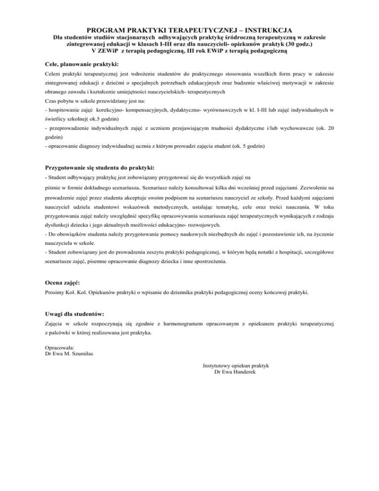 PROGRAM PRAKTYKI TERAPEUTYCZNEJ – INSTRUKCJA Dla studentów studiów stacjonarnych odbywających praktykę śródroczną terapeutyczną w zakresie zintegrowanej edukacji w klasach I-III oraz dla nauczycieli- opiekunów praktyk (30 godz.) V ZEWiP z terapią pedagogiczną, III rok EWiP z terapią pedagogiczną Cele, planowanie praktyki: Celem praktyki terapeutycznej jest wdroŜenie studentów do praktycznego stosowania wszelkich form pracy w zakresie zintegrowanej edukacji z dziećmi o specjalnych potrzebach edukacyjnych oraz budzenie właściwej motywacji w zakresie obranego zawodu i kształcenie umiejętności nauczycielskich- terapeutycznych Czas pobytu w szkole przewidziany jest na: - hospitowanie zajęć korekcyjno- kompensacyjnych, dydaktyczno- wyrównawczych w kl. I-III lub zajęć indywidualnych w świetlicy szkolnej( ok.5 godzin) - przeprowadzenie indywidualnych zajęć z uczniem przejawiającym trudności dydaktyczne i/lub wychowawcze (ok. 20 godzin) - opracowanie diagnozy indywidualnej ucznia z którym prowadzi zajęcia student (ok. 5 godzin) Przygotowanie się studenta do praktyki: - Student odbywający praktykę jest zobowiązany przygotować się do wszystkich zajęć na piśmie w formie dokładnego scenariusza. Scenariusz naleŜy konsultować kilka dni wcześniej przed zajęciami. Zezwolenie na prowadzenie zajęć przez studenta akceptuje swoim podpisem na scenariuszu nauczyciel ze szkoły. Przed kaŜdymi zajęciami nauczyciel udziela studentowi wskazówek metodycznych, ustalając tematykę, cele oraz treści nauczania. W toku przygotowania zajęć naleŜy uwzględnić specyfikę opracowywania scenariusza zajęć terapeutycznych wynikających z rodzaju dysfunkcji dziecka i jego aktualnych moŜliwości edukacyjno- rozwojowych. - Do obowiązków studenta naleŜy przygotowanie pomocy naukowych niezbędnych do zajęć i pozostawienie ich, na Ŝyczenie nauczyciela w szkole. - Student zobowiązany jest do prowadzenia zeszytu praktyki pedagogicznej, w którym będą notatki z hospitacji, szczegółowe scenariusze zajęć, pisemne opracowanie diagnozy dziecka i inne spostrzeŜenia. Ocena zajęć: Prosimy Kol. Kol. Opiekunów praktyki o wpisanie do dziennika praktyki pedagogicznej oceny końcowej praktyki. Uwagi dla studentów: Zajęcia w szkole rozpoczynają się zgodnie z harmonogramem opracowanym z opiekunem praktyki terapeutycznej z palcówki w której realizowana jest praktyka. Opracowała: Dr Ewa M. Szumilas Instytutowy opiekun praktyk Dr Ewa Handerek
