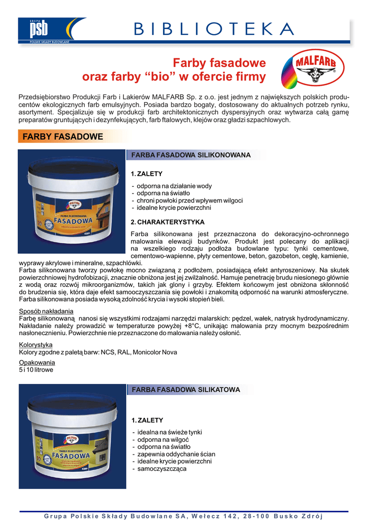 BIBLIOTEKA Farby fasadowe oraz farby “bio” w ofercie firmy Przedsiêbiorstwo Produkcji Farb i Lakierów MALFARB Sp. z o.o. jest jednym z najwiêkszych polskich producentów ekologicznych farb emulsyjnych. Posiada bardzo bogaty, dostosowany do aktualnych potrzeb rynku, asortyment. Specjalizuje siê w produkcji farb architektonicznych dyspersyjnych oraz wytwarza ca³¹ gamê preparatów gruntuj¹cych i dezynfekuj¹cych, farb ftalowych, klejów oraz g³adzi szpachlowych. FARBY FASADOWE FARBA FASADOWA SILIKONOWANA 1. ZALETY - odporna na dzia³anie wody odporna na œwiat³o chroni pow³oki przed wp³ywem wilgoci idealne krycie powierzchni 2. CHARAKTERYSTYKA Farba silikonowana jest przeznaczona do dekoracyjno-ochronnego malowania elewacji budynków. Produkt jest polecany do aplikacji na wszelkiego rodzaju pod³o¿a budowlane typu: tynki cementowe, cementowo-wapienne, p³yty cementowe, beton, gazobeton, ceg³ê, kamienie, wyprawy akrylowe i mineralne, szpachlówki. Farba silikonowana tworzy pow³okê mocno zwi¹zan¹ z pod³o¿em, posiadaj¹c¹ efekt antyroszeniowy. Na skutek powierzchniowej hydrofobizacji, znacznie obni¿ona jest jej zwil¿alnoœæ. Hamuje penetracjê brudu niesionego g³ównie z wod¹ oraz rozwój mikroorganizmów, takich jak glony i grzyby. Efektem koñcowym jest obni¿ona sk³onnoœæ do brudzenia siê, która daje efekt samooczyszczania siê pow³oki i znakomit¹ odpornoœæ na warunki atmosferyczne. Farba silikonowana posiada wysok¹ zdolnoœæ krycia i wysoki stopieñ bieli. Sposób nak³adania Farbê silikonowan¹ nanosi siê wszystkimi rodzajami narzêdzi malarskich: pêdzel, wa³ek, natrysk hydrodynamiczny. Nak³adanie nale¿y prowadziæ w temperaturze powy¿ej +8°C, unikaj¹c malowania przy mocnym bezpoœrednim nas³onecznieniu. Powierzchnie nie przeznaczone do malowania nale¿y os³oniæ. Kolorystyka Kolory zgodne z palet¹ barw: NCS, RAL, Monicolor Nova Opakowania 5 i 10 litrowe FARBA FASADOWA SILIKATOWA 1. ZALETY - idealna na œwie¿e tynki odporna na wilgoæ odporna na œwiat³o zapewnia oddychanie œcian idealne krycie powierzchni samoczyszcz¹ca G r up a Po l sk i e S k ³a d y B u do w la n e S A , W e ³ e c z 1 4 2 , 2 8 - 1 0 0 B u s k o Z d r ó j 2. CHARAKTERYSTYKA Farba silikatowa jest przeznaczona do dekoracyjno-ochronnego malowania elewacji budynków. Produkt jest polecany do aplikacji na wszelkiego rodzaju pod³o¿a budowlane typu: tynki cementowe, cementowo-wapienne, p³yty cementowe, beton, gazobeton, ceg³ê, kamienie, wyprawy mineralne, szpachlówki cementowe oraz na pod³o¿a pokryte mocno trzymaj¹cymi siê pow³okami mineralnymi. Farba silikatowa oparta jest na spoiwie mineralnym w postaci wodnego szk³a potasowego. Dziêki reakcji chemicznej z pod³o¿em mineralnym oraz dwutlenkiem wêgla z atmosfery, tworzy utwardzon¹ pow³okê mocno zwi¹zan¹ z pod³o¿em, posiadaj¹c¹ efekt antyroszeniowy. Na skutek powierzchniowej hydrofobizacji, znacznie obni¿ona jest jej zwil¿alnoœæ. Hamuje penetracjê brudu niesionego g³ównie z wod¹ oraz rozwój mikroorganizmów takich jak glony i grzyby. Efektem koñcowym jest obni¿ona sk³onnoœæ do brudzenia siê, która daje efekt samooczyszczania siê pow³oki i znakomit¹ odpornoœæ na warunki atmosferyczne. Farba silikatowa posiada wysok¹ zdolnoœæ krycia i wysoki stopieñ bieli. Sposób nak³adania Farbê silikatow¹ nanosi siê wszystkimi rodzajami narzêdzi malarskich: pêdzel, wa³ek, natrysk hydrodynamiczny, w zale¿noœci od ch³onnoœci i struktury pod³o¿a jednokrotnie lub dwukrotnie. Nak³adanie nale¿y prowadziæ w temperaturze powy¿ej +8°C, unikaj¹c malowania przy mocnym bezpoœrednim nas³onecznieniu. Powierzchnie nie przeznaczone do malowania, szczególnie: szk³o, kamieñ, ceg³ê klinkierow¹, drewno i aluminium nale¿y os³oniæ foli¹, poniewa¿ wodne szk³o potasowe zawarte w farbie, przed wyschniêciem, dzia³a trawi¹co na w/w materia³y. Kolorystyka Kolory zgodne z palet¹ barw: Malfarb silikat Opakowania 5 i 10 litrowe FARBA FASADOWA SILIKONOWA 1. ZALETY - odporna na wilgoæ odporna na œwiat³o zapewnia oddychanie œcian idealne krycie powierzchni samoczyszcz¹ca 2. CHARAKTERYSTYKA Farba silikonowa jest przeznaczona do dekoracyjno-ochronnego malowania elewacji budynków. Produkt jest polecany do aplikacji na wszelkiego rodzaju pod³o¿a budowlane typu: tynki cementowe, cementowo-wapienne, p³yty cementowe, beton, gazobeton, ceg³ê, kamienie, wyprawy akrylowe i mineralne, szpachlówki. Farba silikonowa oparta jest na spoiwie w postaci wodnej dyspersji silikonowej oraz akrylowo-styrenowej. Tworzy pow³okê mocno zwi¹zan¹ z pod³o¿em, posiadaj¹c¹ efekt antyroszeniowy. Na skutek powierzchniowej hydrofobizacji, znacznie obni¿ona jest jej zwil¿alnoœæ. Hamuje penetracjê brudu niesionego g³ównie z wod¹ oraz rozwój mikroorganizmów, takich jak glony i grzyby. Efektem koñcowym jest obni¿ona sk³onnoœæ do brudzenia siê, która daje efekt samooczyszczania siê pow³oki i znakomit¹ odpornoœæ na warunki atmosferyczne oraz wysok¹ paroprzepuszczalnoœæ. Farba silikonowa posiada wysok¹ zdolnoœæ krycia i wysoki stopieñ bieli. Sposób nak³adania Farbê silikonow¹ nanosi siê wszystkimi rodzajami narzêdzi malarskich: pêdzel, wa³ek, natrysk hydrodynamiczny, w zale¿noœci od ch³onnoœci i struktury pod³o¿a jednokrotnie lub dwukrotnie. Nak³adanie nale¿y prowadziæ w temperaturze powy¿ej +8°C, unikaj¹c malowania przy mocnym bezpoœrednim nas³onecznieniu. Powierzchnie nie przeznaczone do malowania, szczególnie: szk³o, kamieñ, ceg³ê klinkierow¹, drewno i aluminium, nale¿y os³oniæ. Kolorystyka Kolory zgodne z palet¹ barw: NCS, RAL, Monicolor Nova Opakowania 5 i 10 litrowe G r up a Po l sk i e S k ³a d y B u do w la n e S A , W e ³ e c z 1 4 2 , 2 8 - 1 0 0 B u s k o Z d r ó j FARBY “BIO” LATEX SATINE “BIO” 1. ZALETY - aktywna ochrona przed mikroorganizmami odporna na szorowanie chroni pow³oki przed wnikaniem wilgoci idealne kryc