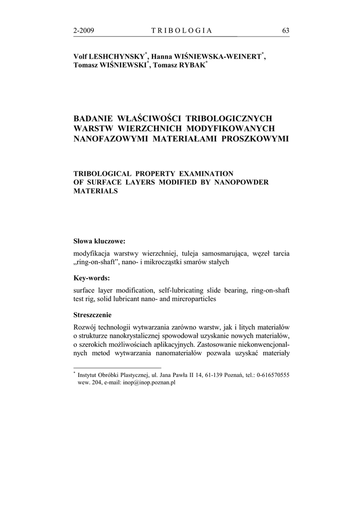 2-2009 TRIBOLOGIA 63 Volf LESHCHYNSKY*, Hanna WIŚNIEWSKA-WEINERT*, Tomasz WIŚNIEWSKI*, Tomasz RYBAK* BADANIE WŁAŚCIWOŚCI TRIBOLOGICZNYCH WARSTW WIERZCHNICH MODYFIKOWANYCH NANOFAZOWYMI MATERIAŁAMI PROSZKOWYMI TRIBOLOGICAL PROPERTY EXAMINATION OF SURFACE LAYERS MODIFIED BY NANOPOWDER MATERIALS Słowa kluczowe: modyfikacja warstwy wierzchniej, tuleja samosmarująca, węzeł tarcia „ring-on-shaft”, nano- i mikrocząstki smarów stałych Key-words: surface layer modification, self-lubricating slide bearing, ring-on-shaft test rig, solid lubricant nano- and mircroparticles Streszczenie Rozwój technologii wytwarzania zarówno warstw, jak i litych materiałów o strukturze nanokrystalicznej spowodował uzyskanie nowych materiałów, o szerokich możliwościach aplikacyjnych. Zastosowanie niekonwencjonalnych metod wytwarzania nanomateriałów pozwala uzyskać materiały * Instytut Obróbki Plastycznej, ul. Jana Pawła II 14, 61-139 Poznań, tel.: 0-616570555 wew. 204, e-mail: [email protected] 64 TRIBOLOGIA 2-2009 o składzie fazowym nieosiągalnym metodami tradycyjnymi. Okazuje się, że zmniejszając wymiary ziaren znanych materiałów, można uzyskać materiał o lepszych właściwościach fizykochemicznych, mechanicznych itp. W Instytucie Obróbki Plastycznej przeprowadzono badania warstw wierzchnich stosowanych dla wybranych części konstrukcyjnych pracujących w trudnych warunkach eksploatacyjnych. W referacie omówione zostały metody wytwarzania mikro- i nanocząstek proszków dwusiarczków oraz technologia nakładania warstw wierzchnich z nanofazowych materiałów proszkowych. Podane są wybrane wyniki badań tribologicznych omawianych części konstrukcyjnych. WPROWADZENIE W krajach wysoko uprzemysłowionych prowadzone są badania zmierzające do znalezienia nowych materiałów o podwyższonych własnościach tribologicznych, w tym odpornych na zużycie i zatarcia, szczególnie dla części pracujących w trudnych warunkach eksploatacyjnych. Współpracujące ze sobą części maszyn oraz elementów różnych urządzeń podlegają zużyciu, przyczyną którego jest przede wszystkim tarcie. Naturalną konsekwencją procesów tarcia jest zniszczenie struktury warstwy wierzchniej oraz ubytek masy. Powoduje to zmiany geometrii oraz właściwości eksploatowanych elementów. Niekorzystnych zjawisk wynikających z mechanicznej współpracy powierzchni podlegających tarciu nie można całkowicie uniknąć. Można je jednak znacznie zredukować poprzez właściwy dobór materiału warstwy wierzchniej oraz przez odpowiednie przygotowanie samej powierzchni. Powoduje to zainteresowanie wielu ośrodków naukowych prowadzeniem badań nad opracowaniem nowych sposobów formowania warstwy wierzchniej, która modyfikuje właściwości tribologiczne elementów współpracujących [L. 1]. METODYKA BADAŃ WŁAŚCIWOŚCI TRIBOLOGICZNYCH WARSTW WIERZCHNICH MODYFIKOWANYCH NANOFAZOWYMI MATERIAŁAMI PROSZKOWYMI Wytwarzanie nano- i mikrocząstek Nano- i mikrocząstki proszków metali otrzymano poprzez powierzchniową obróbkę plastyczną metodą wywierania nacisku na powierzchnię obrabianego materiału narzędziem o gładkiej powierzchni. 2-2009 TRIBOLOGIA 65 Techniki modyfikacji warstwy wierzchniej W przeprowadzonych w Instytucie Obróbki Plastycznej badaniach stosowano dwa rodzaje modyfikacji powierzchni mikro- i nanocząsteczkami MoS2 i WS2: poprzez modyfikację próżniową oraz modyfikację ciśnieniową. Parametry procesu technologicznego i mieszanek zastosowanych do modyfikacji warstw wierzchnich z nanofazowych materiałów proszkowych są obecnie przedmiotem opracowania patentowego. W procesie modyfikacji próżniowej wprowadzanie mikro- i nanocząstek smarów stałych odbywa się poprzez zastosowanie próżni w komorze modyfikacyjnej. Mieszanka smaru stałego i medium (nośnika) w wytworzonej próżni wypełnia porowatości materiału proszkowego. Po zakończeniu procesu modyfikowane mieszanką smaru stałego detale poddawane są suszeniu w celu usunięcia nośnika z porów materiału. W procesie modyfikacji ciśnieniowej technika wprowadzania smarów stałych jest inna niż w procesie modyfikacji próżniowej. Wysokie ciśnienie w komorze ciśnieniowej wytwarzane poprzez nacisk prasy na stempel powoduje wciskanie mieszanki smaru stałego wraz z nośnikiem w pory materiału proszkowego. Modyfikowany detal działa jak swoistego rodzaju filtr, zatrzymując cząstki smaru na powierzchni wewnętrznej oraz w porach nasycanego materiału [L. 2]. Na podstawie dotychczasowych wyników badań opracowano dwa warianty procesu technologicznego wytwarzania samosmarnych tulei łożyskowych. W pierwszym wariancie po procesie modyfikacji otrzymuje się powłoki jednowarstwowe. W drugim wariancie próbka w wyniku azotowania jarzeniowego otrzymuje powłokę kompozytową. Badania tarciowo-zużyciowe warstw wierzchnich Przeprowadzono badania tarciowo-zużyciowe wytworzonych warstw wierzchnich. Badania tarciowo-zużyciowe powłok prowadzono na tribometrze MBT-01, który pozwala na pomiar tarcia podczas testów typu: tuleja na wałku od temperatury otoczenia do 300oC. W trakcie testów wyznaczano temperaturę w węźle tarcia i współczynnik tarcia. Wykonano porównawcze badania tribologiczne powłok na bazie MoS2 i WS2 [L. 3]. WYNIKI BADAŃ Badane proszki smarów stałych poddano analizie strukturalnej na skaningowym mikroskopie elektronowym. Na Rys. 1 przedstawiono zdjęcie SEM proszku MoS2, natomiast na Rys. 2 proszku WS2. 66 TRIBOLOGIA Rys. 1. Obraz SEM cząstek proszku MoS2 Fig. 1. MoS2 powder particles – SEM image 2-2009 Rys. 2. Obraz SEM cząstek proszku WS2 Fig. 2. WS2 powder particles – SEM image Z otrzymanych danych wynika, iż obydwa typy proszków mają charakter płytkowy. Dla proszku MoS2 jeden z wymiarów mieści się w zakresie 150–350 nm, natomiast dla proszku WS2 200–900 nm. Ponadto wykonano dyfraktogramy rentgenowskie próbek proszkowych WS2 i MoS2. Pomiar wykonywano za pomocą dyfr