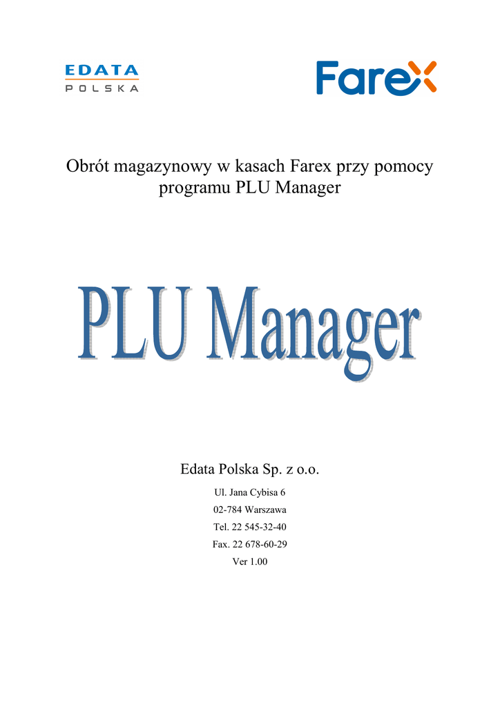 Obrót magazynowy w kasach Farex przy pomocy programu PLU Manager Edata Polska Sp. z o.o. Ul. Jana Cybisa 6 02-784 Warszawa Tel. 22 545-32-40 Fax. 22 678-60-29 Ver 1.00 Edata Polska Sp. z o.o. 22 545-32-40 Spis treści: 1 2 Wstęp .................................................................................................................................. 3 Programowanie bazy towarowej ......................................................................................... 4 2.1 Połączenie kasy do komputera. ........................................................................................ 4 2.2 Pobranie bazy PLU z kasy ............................................................................................... 5 2.3 Przypisanie stanów magazynowych ................................................................................. 6 2.4 Załadowanie bazy towarowej do kasy ............................................................................. 6 3 Odczyt stanów magazynowych i przyjmowanie towaru .................................................... 7 3.1 Odczyt stanów magazynowych ........................................................................................ 7 3.2 Przyjęcie towarów na stan magazynowy ......................................................................... 7 3.3 Zapisanie zaktualizowanych stanów magazynowych w kasie. ........................................ 8 Strona 2 Obrót magazynowy w kasach Farex przy pomocy programu PLU Manager Edata Polska Sp. z o.o. 22 545-32-40 1 Wstęp Aplikacja PLU Manager pozwala na kontrolę sprzedaży i obrotu magazynowego we wszystkich kasach marki Farex. Poprzez aplikację możliwe jest dodawanie towarów na stan magazynowy w trakcie przyjmowania nowego towaru oraz podgląd wielkości sprzedaży w określonych odstępach czasu. Warunkiem rozpoczęcia rejestracji obrotów towarów jest włączenie w kasie funkcji Magazynu. Aby to zrobić należy: 1. Wejść do trybu SET (programowania) kasy naciskając klawisz [PRAC] aż trójkątny znacznik w lewy, górnym rogu wyświetlacza znajdzie się pod napisem SET. 2. Nacisnąć przycisk [GOT] i wprowadzić hasło kierownika (domyślnie 0000). 3. Strzałkami odnaleźć w menu pozycję SYSTEM i zatwierdzić klawiszem [GOT]. 4. Na wyświetlaczu pojawi się komunikat „Wprowadź parametr”. 5. Należy wpisać 151 (ustawienie parametru 15 w pozycję 1) i zatwierdzić klawiszem [GOT]. Uwaga: Dodatkowe szczegółowe informacje dotyczące łączenia kasy z programem PLU Manager, odczytu i zapisu danych w kasie znajdują się w Instrukcji programowania kasy programem PLU Manager, do pobrania ze strony www.edatapolska.pl Strona 3 Obrót magazynowy w kasach Farex przy pomocy programu PLU Manager Edata Polska Sp. z o.o. 22 545-32-40 2 Programowanie bazy towarowej Pierwszym krokiem jest uruchomienie aplikacji PLU Manager. Uwaga: Każda kasa Farex ma oddzielny program PLU Manager, za pomocą, którego należy kasę programować. Proces programowania zostanie zaprezentowany na przykładzie aplikacji PLU Manager i kasy Farex Bursztyn. Kasę należy podłączyć do komputera a następnie ustawić odpowiednie parametry transmisji. W oknie głównym aplikacji w części „Baza Towarowa – PLU” należy wprowadzić informacje związane z posiadaną bazą towarową, ceną towarów i stawką. W kolumnie „Magazyn” proszę wprowadzić początkową ilość sprzedawanych towarów. Uwaga: Jeżeli baza towarowa jest już zapisana w kasie wystarczy ją załadować do programu przy pomocy przycisku „Pobierz”. Następnie do każdej sprzedawanej pozycji w polu „Magazyn” wpisać posiadaną ilość towarów. Poniżej przykład działania w przypadku, kiedy w kasie zapisane jest 10 towarów. Baza zostanie załadowana do programu i wprowadzony zostanie stan magazynowy. 2.1 Połączenie kasy do komputera. Kasę należy podłączyć przewodem RS-232 do komputera, w aplikacji nacisnąć przycisk „Ust. kom” , wybrać numer portu komunikacji, prędkość transmisji i zatwierdzić przyciskiem [OK]. Strona 4 Obrót magazynowy w kasach Farex przy pomocy programu PLU Manager Edata Polska Sp. z o.o. 22 545-32-40 2.2 Pobranie bazy PLU z kasy Na pasku głównym aplikacji należy nacisnąć przycisk „Pobierz” , zaznaczyć okienko z etykietą PLU, wybrać zakres PLU i zatwierdzić przyciskiem [OK]. Baza towarowa zostanie załadowana do aplikacji. Strona 5 Obrót magazynowy w kasach Farex przy pomocy programu PLU Manager Edata Polska Sp. z o.o. 22 545-32-40 2.3 Przypisanie stanów magazynowych Do każdego towaru należy przypisać jego ilość w magazynie, uzupełniając kolumnę opisaną, jako „Magazyn”. 2.4 Załadowanie bazy towarowej do kasy Uzupełnioną bazę towarową można załadować do kasy. Najpierw należy wykonać Raport Fiskalny Dobowy oraz Raport Fiskalny PLU. Uwaga: Konieczność wykonania Raportu Fiskalnego Dobowego w tym przypadku można wyłączyć ustawiając parametr systemowy 131 w sposób analogiczny jak włączenie funkcji magazynowej (patrz punkt 1). Z paska głównego w aplikacji należy wybrać ikonę „Wyślij” , zaznaczyć okienko z etykietą PLU, wybrać zakres PLU i zatwierdzić przyciskiem [OK]. Baza towarowa zostanie załadowana do kasy wraz z przypisaniem stanów magazynowych. Strona 6 Obrót magazynowy w kasach Farex przy pomocy programu PLU Manager Edata Polska Sp. z o.o. 22 545-32-40 3 Odczyt stanów magazynowych i przyjmowanie towaru 3.1 Odczyt stanów magazynowych W każdej chwili można odczytać ilość sprzedanych w kasie towarów oraz aktualne stany magazynowe podłączając urządzenie do komputera i uruchamiając aplikację PLU Manager. Po podłączeniu i skonfigurowaniu komunikacji należy pobrać bazę PLU jak opisano w punkcie 2.2. W kolumnie „Magazyn” wyświetlona jest aktualna ilość danego towaru w magazynie. Dodatkowo, jeżeli nie wykonano raportu Fiskalnego PLU w kolumnie „Ilość” pojawia się ilość towaru sprzedanego a
