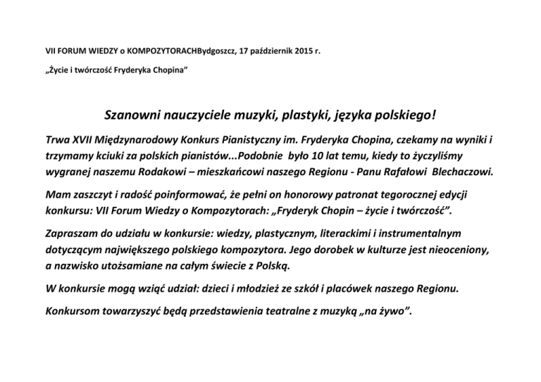 VII FORUM WIEDZY o KOMPOZYTORACHBydgoszcz, 17 październik 2015 r. „Życie i twórczość Fryderyka Chopina” Szanowni nauczyciele muzyki, plastyki, języka polskiego! Trwa XVII Międzynarodowy Konkurs Pianistyczny im. Fryderyka Chopina, czekamy na wyniki i trzymamy kciuki za polskich pianistów...Podobnie było 10 lat temu, kiedy to życzyliśmy wygranej naszemu Rodakowi – mieszkańcowi naszego Regionu - Panu Rafałowi Blechaczowi. Mam zaszczyt i radość poinformować, że pełni on honorowy patronat tegorocznej edycji konkursu: VII Forum Wiedzy o Kompozytorach: „Fryderyk Chopin – życie i twórczość”. Zapraszam do udziału w konkursie: wiedzy, plastycznym, literackimi i instrumentalnym dotyczącym największego polskiego kompozytora. Jego dorobek w kulturze jest nieoceniony, a nazwisko utożsamiane na całym świecie z Polską. W konkursie mogą wziąć udział: dzieci i młodzież ze szkół i placówek naszego Regionu. Konkursom towarzyszyć będą przedstawienia teatralne z muzyką „na żywo”. Szczegółowe informacje o konkursach i przedstawieniu znajdują się w załącznikach. Organizatorem jest: Młodzieżowy Dom Kultury NR 2 w Bydgoszczy Ul. Leszczyńskiego 42, tel/fax 52 373 17 95 e-mail www…………………….. Szczegółowych informacji udziela: Arleta Murawska Tel. 506099747 e-mail: [email protected] KONKURS WIEDZY – REGULAMIN: 1. Udział w konkursie polegać będzie na udzieleniu odpowiedzi na pytania w formie pisemnej oraz rozpoznaniu utworów kompozytora. 2.Celem konkursu jest szerzenie wiedzy o życiu i twórczości największego polskiego kompozytora, znajomość czasów, w których żył oraz jego twórczości z umiejętnością rozpoznawania utworów. 3. Uczestnikami mogą być uczniowie szkół podstawowych, gimnazjum, liceum, którzy opanują wskazany zakres materiału. 4.Materiały pomocnicze można otrzymać drogą mailową po uprzednim kontakcie z organizatorem konkursu: Arleta Murawska, tel. kom. 506099747 adres mailowy: [email protected] 5. Udział w konkursie należy zgłosić do 30 stycznia 2016 roku 6. Data, godzina i miejsce konkursu zostanie podana zgłoszonym do udziału Placówkom. 7.Honorowy patronat konkursu pełni: Zwycięzca XV Konkursu Chopinowskiego - Pan Rafał Blechacz Wojewoda Kujawsko Pomorski- Pani Ewa Mes KARTA ZGŁOSZENIA: Nazwa placówki, adres:…………………………………………………………………………………………………………………………………………………………. ……………………………………………………………………………………………………………………………………………………………………………………………… Tel:.............................................................................................................................................................................................. E-mail:……………………………………………………………………………………………………………………………………………………………………………………. Opiekun:………………………………………………………………………………………………………………………………………………………………………………… Tel:.............................................................................................................................................................................................. Uczestnicy: ……………………………………………………………………………………………………………………………………………………………………………………………….. ……………………………………………………………………………………………………………………………………………………………………………………………….. ……………………………………………………………………………………………………………………………………………………………………………………………….. Miejscowość I data:………………………………………………………………………………………………………………………………………………………………… Podpis nauczyciela-opiekuna Pieczęć i podpis dyrektora KONKURSPLASTYCZNY - REGULAMIN 1. Celem konkursu jest popularyzacja postaci największego polskiego kompozytora,rozwijanie wyobraźni twórczej dzieci i młodzieży. 2. Tematyka pracy do wyboru: Fryderyk Chopin –wizerunek kompozytora lub odzwierciedlenie przeżyć utworów Kompozytora. 3. Prace mogą być wykonane dowolną techniką, w formacie A- 4. 4. Prace oceniane będą w kategoriach: szkoła podstawowa: klasy I – III, IV – VI, gimnazjum i liceum. 5. Każdy uczestnik może nadesłać jedną pracę, a każda klasa maksymalnie 3 prace. 6. Nadesłane prace nie będą zwracane i przechodzą na własność organizatora. 7. Praca powinna zawierać: imię i nazwisko, adres szkoły lub placówki, nazwisko nauczyciela, numer kontaktowy. 8. Prace prosimy nadesłać lub dostarczyć do dnia 28 lutego 2016 roku na adres: MDK NR 2, ulica Leszczyńskiego 42, 85-137 Bydgoszcz 9. Jury dokona oceny prac, a o zwycięzcach powiadomi telefonicznie wraz z powiadomieniem daty i miejsca wręczenia nagród laureatom. 10. Patronat honorowy: Zwycięzca XV Konkursu Chopinowskiego – Pan Rafał Blechacz, Wojewoda Kujawsko Pomorski - Pani Ewa Mes KONKURS LITERACKI – REGULAMIN: 1. Udział w konkursie polega na napisaniu jednej pracy na dowolnie wybrany temat w dowolnej formie literackiej: wiersz lub proza (ta forma nie może przekroczyć 3 stron papieru kancelaryjnego) 2. Prace należy złożyć w formie wydruku komputerowego do dnia 30 marca 2016 roku na adres Placówki. 3. Prace będą oceniane 