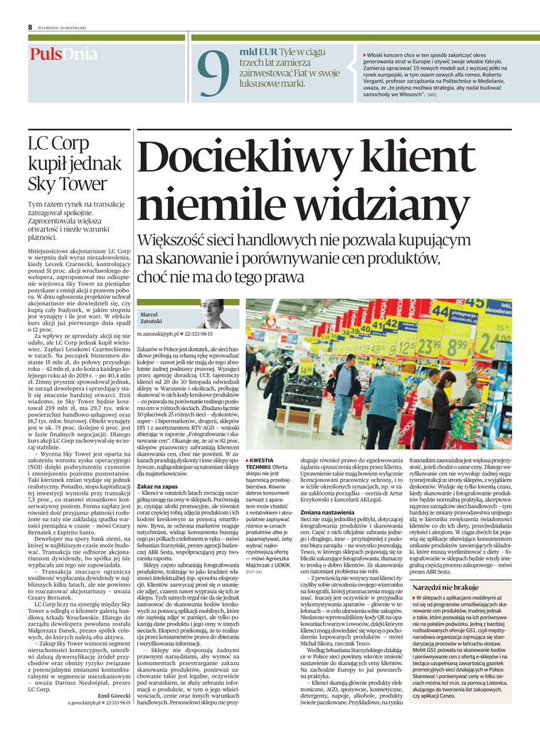 8 PULS BIZNESU, 10 GRUDNIA 2013 9 PulsDnia LC Corp kupił jednak Sky Tower Tym razem rynek na transakcję zareagował spokojnie. Zaprocentowała większa otwartość i niezłe warunki płatności. Mniejszościowi akcjonariusze LC Corp w sierpniu dali wyraz niezadowoleniu, kiedy Leszek Czarnecki, kontrolujący ponad 51 proc. akcji wrocławskiego dewelopera, zaproponował mu odkupienie wieżowca Sky Tower za pieniądze pozyskane z emisji akcji z prawem poboru. W dniu ogłoszenia projektów uchwał akcjonariusze nie dowiedzieli się, czy kupią cały budynek, w jakim stopniu jest wynajęty i ile jest wart. W efekcie kurs akcji już pierwszego dnia spadł o 12 proc. Za wpływy ze sprzedaży akcji się nie udało, ale LC Corp jednak kupił wieżowiec. Zapłaci Leszkowi Czarneckiemu w ratach. Na początek biznesmen dostanie 15 mln zł, do połowy przyszłego roku — 42 mln zł, a do końca każdego kolejnego roku aż do 2019 r. — po 40,4 mln zł. Zimny prysznic spowodował jednak, że zarząd dewelopera i sprzedający stali się znacznie bardziej otwarci. Dziś wiadomo, że Sky Tower będzie kosztował 259 mln zł, ma 29,7 tys. mkw. powierzchni handlowo-usługowej oraz 18,7 tys. mkw. biurowej. Obiekt wynajęty jest w ok. 75 proc. (kolejne 6 proc. jest w fazie finalnych negocjacji). Dlatego kurs akcji LC Corp zachowywał się wczoraj stabilnie. — Wycena Sky Tower jest oparta na założeniu wzrostu zysku operacyjnego (NOI) dzięki podwyższeniu czynszów i zmniejszeniu poziomu pustostanów. Taki kierunek zmian wydaje się jednak realistyczny. Ponadto, stopa kapitalizacji tej inwestycji wyniosła przy transakcji 7,5 proc., co stanowi stosunkowo konserwatywny poziom. Forma zapłaty jest również dość przyjazna: płatności rozłożone na raty nie zakładają spadku wartości pieniądza w czasie — mówi Cezary Bernatek z Espirito Santo. Deweloper ma spory bank ziemi, na której w najbliższym czasie może budować. Transakcja nie odbierze akcjonariuszom dywidendy, bo spółka jej nie wypłacała ani tego nie zapowiadała. — Transakcja znacząco ogranicza możliwość wypłacania dywidendy w najbliższych kilku latach, ale nie powinno to rozczarować akcjonariuszy — uważa Cezary Bernatek. LC Corp liczy na synergię między Sky Tower a odległą o kilometr galerią handlową Arkady Wrocławskie. Dlatego do zarządu dewelopera powołana została Małgorzata Danek, prezes spółek celowych, do których należą oba aktywa. — Zakup Sky Tower wzmocni segment nieruchomości komercyjnych, umożliwi dalszą dywersyfikację źródeł przychodów oraz obniży ryzyko związane z potencjalnymi zmianami koniunkturalnymi w segmencie mieszkaniowym — uważa Dariusz Niedośpiał, prezes LC Corp. Emil Górecki [email protected] ☎ 22-333-98-19 mld EUR Tyle w ciągu trzech lat zamierza zainwestować Fiat w swoje luksusowe marki. Włoski koncern chce w ten sposób zakończyć okres generowania strat w Europie i ożywić swoje włoskie fabryki. Zamierza opracować 19 nowych modeli aut z wyższej półki na rynek europejski, w tym osiem nowych alfa romeo. Roberto Verganti, profesor zarządzania na Politechnice w Mediolanie, uważa, że „to jedyna możliwa strategia, aby nadal budować samochody we Włoszech”. [MD] Dociekliwy klient niemile widziany Większość sieci handlowych nie pozwala kupującym na skanowanie i porównywanie cen produktów, choć nie ma do tego prawa Marcel Zatoński [email protected] % 22-333-98-15 Zakazów w Polsce jest dostatek, ale sieci handlowe próbują na własną rękę wprowadzać kolejne — nawet jeśli nie mają do tego absolutnie żadnej podstawy prawnej. Wynajęci przez agencję doradczą UCE tajemniczy klienci od 20 do 30 listopada odwiedzali sklepy w Warszawie i okolicach, próbując skanować w nich kody kreskowe produktów — co pozwala na porównanie realnego poziomu cen w różnych sieciach. Zbadano łącznie 50 placówek 25 różnych sieci — dyskontów, super— i hipermarketów, drogerii, sklepów DIY i z asortymentem RTV-AGD — wnioski zbierając w raporcie „Fotografowanie i skanowanie cen”. Okazuje się, że aż w 82 proc. sklepów pracownicy zabraniają klientom skanowania cen, choć nie powinni. W zakazach przodują dyskonty i inne sklepy spożywcze, najłagodniejsze są natomiast sklepy dla majsterkowiczów. Zakaz na zapas — Klienci w ostatnich latach zwracają szczególną uwagę na ceny w sklepach. Porównują je, czytając ulotki promocyjne, ale również coraz częściej robią zdjęcia produktom i ich kodom kreskowym za pomocą smartfonów. Bywa, że ochrona marketów reaguje natychmiast, widząc konsumenta buszującego po półkach z telefonem w ręku — mówi Sebastian Starzyński, prezes agencji badawczej ABR Sesta, współpracującej przy tworzeniu raportu. Sklepy często zabraniają fotografowania produktów, traktując to jako kradzież własności intelektualnej (np. sposobu ekspozycji). Klientów zazwyczaj prosi się o usunięcie zdjęć, czasem nawet wyprasza się ich ze sklepu. Tych samych reguł nie da się jednak zastosować do skanowania kodów kreskowych za pomocą aplikacji mobilnych, które nie zapisują zdjęć w pamięci, ale tylko pokazują dane produktu i jego ceny w innych sieciach. Eksperci przekonują, że to realizacja przez konsumentów prawa do zbierania i weryfikowania informacji. — Sklepy nie dysponują żadnymi prawnymi narzędziami, aby wymóc na konsumentach przestrzeganie zakazu skanowania produktów, ponieważ zachowanie takie jest legalne, oczywiście pod warunkiem, że służy zebraniu informacji o produkcie, w tym o jego właściwościach, cenie oraz innych warunkach handlowych. Personelowi sklepu nie przy- KWESTIA TECHNIKI: Oferta sklepu nie jest tajemnicą przedsiębiorstwa. Równie dobrze konsument zamiast z aparatem może chodzić z notatnikiem i skrupulatnie zapisywać różnice w cenach produktów albo je zapamiętywać, żeby wybrać najkorzystniejszą ofertę — mówi Agnieszka Majchrza