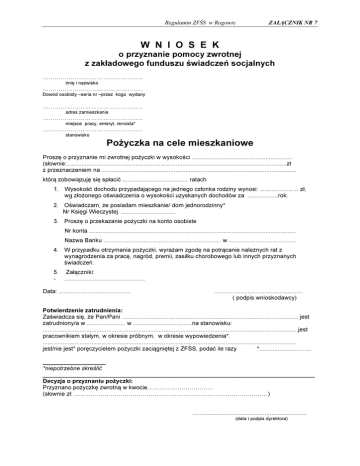 Regulamin ZFŚS w Rogowie ZAŁĄCZNIK NR 7 W N I O S E K o przyznanie pomocy zwrotnej z zakładowego funduszu świadczeń socjalnych .. imię i nazwisko .. Dowód osobisty –seria nr –przez kogo wydany .. adres zamieszkania .. miejsce pracy, emeryt, rencista* .. stanowisko Pożyczka na cele mieszkaniowe Proszę o przyznanie mi zwrotnej pożyczki w wysokości ............................................................ (słownie:...................................................................................................................................zł z przeznaczeniem na .................................................................................................................... którą zobowiązuję się spłacić ....................................... ratach 1. Wysokość dochodu przypadającego na jednego członka rodziny wynosi: ....................... zł, wg złożonego oświadczenia o wysokości uzyskanych dochodów za ..................rok. 2. Oświadczam, że posiadam mieszkanie/ dom jednorodzinny* Nr Księgi Wieczystej ................................ 3. Proszę o przekazanie pożyczki na konto osobiste Nr konta ........................................................................................................................... Nazwa Banku ...................................................................... w ........................................ 4. W przypadku otrzymania pożyczki, wyrażam zgodę na potrącanie należnych rat z wynagrodzenia za pracę, nagród, premii, zasiłku chorobowego lub innych przyznanych świadczeń. 5. Załączniki: - ................................................ Data: ........................................... ..................................................... ( podpis wnioskodawcy) Potwierdzenie zatrudnienia: Zaświadcza się, że Pan/Pani ......................................................................................................... jest zatrudniony/a w ....................... w ...................................na stanowisku: ........................................................................................................................................................jest pracownikiem stałym, w okresie próbnym, w okresie wypowiedzenia*. ....................................................................................................................................................... jest/nie jest* poręczycielem pożyczki zaciągniętej z ZFŚS, podać ile razy *............................... _________________ *niepotrzebne skreślić _________________________________________________________________________________ Decyzja o przyznaniu pożyczki: Przyznano pożyczkę zwrotną w kwocie (słownie zł: ) .................................................................... (data i podpis dyrektora)