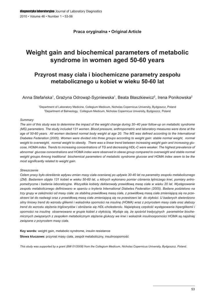 diagnostyka laboratoryjna Journal of Laboratory Diagnostics 2010 • Volume 46 • Number 1 • 53-56 Praca oryginalna • Original Article Weight gain and biochemical parameters of metabolic syndrome in women aged 50-60 years Przyrost masy ciała i biochemiczne parametry zespołu metabolicznego u kobiet w wieku 50-60 lat Anna Stefańska1, Grażyna Odrowąż-Sypniewska1, Beata Błaszkiewicz2, Irena Ponikowska2 1 Department of Laboratory Medicine, Collegium Medicum, Nicholas Copernicus University, Bydgoszcz, Poland 2 Department of Balneology, Collegium Medicum, Nicholas Copernicus University, Bydgoszcz, Poland Summary The aim of this study was to determine the impact of the weight change during 30–40 year follow-up on metabolic syndrome (MS) parameters. The study included 131 women. Blood pressure, anthropometric and laboratory measures were done at the age of 50-60 years. All women declared normal body weight at age 20. The MS was defined according to the International Diabetes Federation (2005). Women were divided into three groups according to weight gain: stable normal weight, normal weight to overweight, normal weight to obesity. There was a linear trend between increasing weight gain and increasing glucose, HOMA index. Trends to increasing concentrations of TG and decreasing HDL-C were weaker. The highest prevalence of abnormal glucose concentrations and HOMA index were observed in obese group compared to overweight and stable normal weight groups Among traditional biochemical parameters of metabolic syndrome glucose and HOMA index seem to be the most significantly related to weight gain. Streszczenie Celem pracy było określenie wpływu zmian masy ciała ocenianej po upływie 30-40 lat na parametry zespołu metabolicznego (ZM). Badaniem objęto 131 kobiet w wieku 50-60 lat, u których wykonano pomiar ciśnienia tętniczego krwi, pomiary antropometryczne i badania laboratoryjne. Wszystkie kobiety deklarowały prawidłową masę ciała w wieku 20 lat. Występowanie zespołu metabolicznego definiowano w oparciu o kryteria International Diabetes Federation (2005). Badane podzielono na trzy grupy w zależności od masy ciała: ze stabilną prawidłową masą ciała, z prawidłową masą ciała zmieniającą się na przestrzeni lat do nadwagi oraz z prawidłową masą ciała zmieniającą się na przestrzeni lat do otyłości. U badanych stwierdzono silny liniowy trend do wzrostu glikemii i wskaźnika oporności na insulinę (HOMA) wraz z przyrostem masy ciała oraz słabszy trend do wzrostu stężenia triglicerydów i obniżania się HDL-cholesterolu. Największą częstość występowania hiperglikemii i oporności na insulinę obserwowano w grupie kobiet z otyłością. Wydaje się, że spośród tradycyjnych parametrów biochemicznych związanych z zespołem metabolicznym stężenie glukozy we krwi i wskaźnik insulinooporności HOMA są najsilniej związane z przyrostem masy ciała. Key words:weight gain, metabolic syndrome, insulin resistance Słowa kluczowe:przyrost masy ciała, zespół metaboliczny, insulinooporność This study was supported by a grant (BW 01/2008) from the Collegium Medicum, Nicholas Copernicus University, Bydgoszcz, Poland. 53