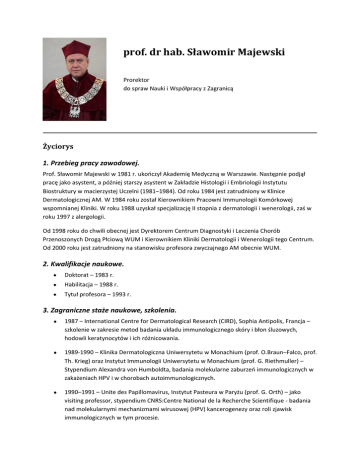prof. dr hab. Sławomir Majewski Prorektor do spraw Nauki i Współpracy z Zagranicą Życiorys 1. Przebieg pracy zawodowej. Prof. Sławomir Majewski w 1981 r. ukooczył Akademię Medyczną w Warszawie. Następnie podjął pracę jako asystent, a później starszy asystent w Zakładzie Histologii i Embriologii Instytutu Biostruktury w macierzystej Uczelni (1981–1984). Od roku 1984 jest zatrudniony w Klinice Dermatologicznej AM. W 1984 roku został Kierownikiem Pracowni Immunologii Komórkowej wspomnianej Kliniki. W roku 1988 uzyskał specjalizację II stopnia z dermatologii i wenerologii, zaś w roku 1997 z alergologii. Od 1998 roku do chwili obecnej jest Dyrektorem Centrum Diagnostyki i Leczenia Chorób Przenoszonych Drogą Płciową WUM i Kierownikiem Kliniki Dermatologii i Wenerologii tego Centrum. Od 2000 roku jest zatrudniony na stanowisku profesora zwyczajnego AM obecnie WUM. 2. Kwalifikacje naukowe. Doktorat – 1983 r. Habilitacja – 1988 r. Tytuł profesora – 1993 r. 3. Zagraniczne staże naukowe, szkolenia. 1987 – International Centre for Dermatological Research (CIRD), Sophia Antipolis, Francja – szkolenie w zakresie metod badania układu immunologicznego skóry i błon śluzowych, hodowli keratynocytów i ich różnicowania. 1989-1990 – Klinika Dermatologiczna Uniwersytetu w Monachium (prof. O.Braun–Falco, prof. Th. Krieg) oraz Instytut Immunologii Uniwersytetu w Monachium (prof. G. Riethmuller) – Stypendium Alexandra von Humboldta, badania molekularne zaburzeo immunologicznych w zakażeniach HPV i w chorobach autoimmunologicznych. 1990–1991 – Unite des Papillomavirus, Instytut Pasteura w Paryżu (prof. G. Orth) – jako visiting professor, stypendium CNRS:Centre National de la Recherche Scientifique - badania nad molekularnymi mechanizmami wirusowej (HPV) kancerogenezy oraz roli zjawisk immunologicznych w tym procesie. 4. Główne zainteresowania naukowe i kliniczne. Zaburzenia immunologiczne w chorobach o podłożu autoimmunologicznym (łuszczyca, kolagenozy), alergicznym (atopowe zapalenie skóry). Mechanizmy skórnej onkogenezy; w tym rola wirusów brodawczaka ludzkiego – HPV oraz procesy angiogenezy nowotworowej. 5. Dorobek naukowy. Prof. Sławomir Majewski jest autorem lub współautorem 722 publikacji. Ponad 100 jego prac zostało zamieszczonych w znanych zagranicznych czasopismach. Łączna liczba punktów za opublikowane artykuły tzw. Cumulative Impact Factor wynosi ponad 350. Indeks cytowao przekroczył liczbę 2000. Profesor współpracuje z takimi czasopismami jak: Archives of Dermatology, Journal of American Academy of Dermatology, Journal of Investigative Dermatology, Arch Dermatol Res, Cancer Research czy Int J Cancer. Zajął ósme miejsce na liście najczęściej cytowanych polskich autorów w latach 1995–2005 z dziedziny nauk biomedycznych według tzw. „indeksu h”. Prof. Sławomir Majewski ma duże osiągnięcia w zakresie organizacji i przeprowadzania badao naukowych, był między innymi: kierownikiem międzynarodowego grantu europejskiego – „Copernicus” – 1992–1996 głównym wykonawcą innego grantu europejskiego – „Copernicus” – 1992–1995 kierownikiem 4 grantów KBN głównym wykonawcą 10 grantów KBN oraz grantu zamawianego KBN koordynatorem ze strony polskiej programu oficjalnej współpracy z Unite des Papillomavirus Instytutu Pasteura w Paryżu od 1995 do 2000 r. 6. Promocje i recenzje. Recenzent 30 prac doktorskich i 8 prac habilitacyjnych Recenzent z ramienia Centralnej Komisji ds. Stopni i Tytułów Naukowych Promotor 18 zakooczonych i 2 otwartych przewodów doktorskich Opiekun w 4 przewodach habilitacyjnych (dwie osoby uzyskały już tytuł profesora) Profesor recenzował również prace kliniczne i doświadczalne w wielu zagranicznych czasopismach naukowych. 7. Główne osiągnięcia, nagrody odznaczenia. Międzynarodowa Nagroda Naukowa w Dziedzinie Dermatologii i Wenerologii im. Emanuele Stablum – Rzym 1992 r. Trzy Nagrody Ministra Zdrowia; w tym dwie pierwszego stopnia. Kilkanaście Nagród JM Rektora AM. Dwie nagrody „Złotej Kukułki” AM w Warszawie – za pracę najczęściej cytowaną w piśmiennictwie światowym w ciągu ostatnich pięciu lat. Nagrodę otrzymał w 2001 r. i w 2002 r. Honorowe członkostwo „Sigma Xi” Scientific Research Society, The Newark Chapter, USA – 2006 r. Medal Komisji Edukacji Narodowej – 2006 r. 8. Członkostwo w towarzystwach naukowych, pełnione funkcje, inna działalność organizacyjna. Prof. Sławomir Majewski jest: od 2002 r. członkiem korespondentem PAN, od 1996 r. zastępcą Przewodniczącego Wydziału Nauk Medycznych PAN, Przewodniczącym komisji Wydziału VI PAN ds. oceny działalności naukowej placówek, jest także członkiem kilku komitetów PAN–u, od 2001 r. członkiem Rady Europejskich Badao Medycznych (European Medical Research Councils), od 2006 r. Prezesem Polskiego Towarzystwa Profilaktyki Zakażeo HPV, członkiem kilku komitetów redakcyjnych międzynarodowych czasopism naukowych, członkiem wielu polskich i zagranicznych towarzystw naukowych, od 2002 r. członkiem Prezydium Rady Naukowej przy Ministrze Zdrowia, Sekretarzem Rady od 2006 r., członkiem Rady Naukowej International Institute of Molecular and Cell Biology oraz członkiem Rady Naukowej Instytutu Immunologii Doświadczalnej i Terapii PAN we Wrocławiu.