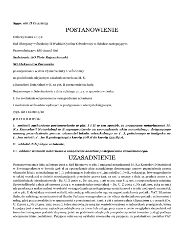 Sygn. akt II Cz 216/13 POSTANOWIENIE Dnia 25 marca 2013 r. Sąd Okręgowy w Świdnicy II Wydział Cywilny Odwoławczy w składzie następującym: Przewodniczący: SSO Anatol Gul Sędziowie: SO Piotr Rajczakowski SO Aleksandra Żurawska po rozpoznaniu w dniu 25 marca 2013 r. w Świdnicy na posiedzeniu niejawnym zażalenia notariusza M. K. z Kancelarii Notarialnej w B. na pkt. II postanowienia Sądu Rejonowego w Dzierżoniowie z dnia 14 lutego 2013 r. w sprawie z wniosku I. S.o zwolnienie od ponoszenia wynagrodzenia notariusza i zwolnienie od kosztów sądowych w postępowaniu wieczystoksięgowym, sygn. akt I Co 2209/12 p o s t a n a w i a: I. zmienić zaskarżone postanowienie w pkt. I i II w ten sposób, że przyznane notariuszowi M. K.z Kancelarii Notarialnej w B.wynagrodzenie za sporządzenie aktu notarialnego dotyczącego umowy przeniesienia prawa własności lokalu mieszkalnego nr (...), położonego w budynku nr (...)na osiedlu (...)w B.podwyższyć z kwoty 508 zł do kwoty 532,84 zł, II. oddalić dalej idące zażalenie, III. oddalić wniosek notariusza o zasądzenie kosztów postępowania zażaleniowego. UZASADNIENIE Postanowieniem z dnia 14 lutego 2013 r. Sąd Rejonowy w pkt. I przyznał notariuszowi M. K.z Kancelarii Notarialnej w B.wynagrodzenie w kwocie 508 zł za sporządzenie aktu notarialnego dotyczącego umowy przeniesienia prawa własności lokalu mieszkalnego nr (...), położonego w budynku nr (...)na osiedlu (...)w B., wskazując, że wynagrodzenie w takiej wysokości w świetle obowiązujących przepisów prawa (art. 12 ust. 5 ustawy z dnia 15 grudnia 2000 r. o spółdzielniach mieszkaniowych - Dz. U. Z 2003 r., Nr 119, poz. 1116 ze zm. oraz § 12 ust. 1 rozporządzenia ministra Sprawiedliwości z dnia 28 czerwca 2004 r. w sprawie taksy notarialnej – Dz. U. Z 2004 r., Nr 148, poz. 1564 ze zm.) nie przekracza maksymalnej wysokości wynagrodzenia przysługującego notariuszowi z tytułu podjętych czynności, zaś w pkt. II dalej idący wniosek oddalił, odmawiając wliczenia do tego wynagrodzenia kwoty podatku VAT. Zdaniem Sądu, do należnego notariuszowi od Skarbu Państwa wynagrodzenia nie wlicza się dodatkowo podatku od towarów i usług, gdyż pozostawałoby to w sprzeczności z przepisami art. 3 ust. 1 pkt 1 ustawy z dnia 5 lipca 2001 r. o cenach (Dz. U. Z 2001 r., Nr 97, poz. 1050 ze zm.), które stanowią, że ceną jest wartość wyrażona w jednostkach pieniężnych, którą kupujący jest obowiązany zapłacić przedsiębiorcy za towar lub usługę, przy czym w cenie uwzględnia się podatek od towarów i usług oraz podatek akcyzowy, jeżeli na podstawie odrębnych przepisów sprzedaż towarów (usług) podlega obciążeniu takim podatkiem. Przyjęcie odmiennej wykładni równałoby się przyjęciu, że podatnikiem podatku VAT jest strona korzystająca z usług notariusza, a nie notariusz. Ten byłby wówczas jedynie płatnikiem. To założenie pozostawałoby natomiast w sprzeczności z przepisami regulującymi obowiązki podatkowe. W zażaleniu na powyższe postanowienie w pkt. II notariusz, wnosząc o przyznanie wynagrodzenia w całej żądanej kwocie zgodnie z wnioskiem i o zasądzenie kosztów postępowania zażaleniowego, podniosła, że Sąd Rejonowy błędnie stanął na stanowisku, iż wynagrodzenie należne notariuszowi za dokonanie czynności notarialnej jako wynagrodzenie maksymalne obejmuje już podatek VAT. Zdaniem skarżącej, odmowa uznania wynagrodzenia notariusza w zakresie kwoty, stanowiącej równowartość podatku VAT w niniejszej sprawie, powoduje bezzasadne obniżenie wynagrodzenia należnego za sporządzony akt notarialny. Podatek VAT ma być bowiem kwotą doliczoną do wynagrodzenia notariusza – dodatkowo obciążającą stronę, a nie kwotą obniżającą to wynagrodzenie. Skarżąca oparła się przy tym na stanowisku Krajowej Rady Notarialnej, wyrażonym w uchwale z dnia 28 grudnia 1993 r., z którego wynika, że do wynagrodzenia notariusza ustalonego ze stronami czynności notarialnej w kwocie nieprzekraczającej stawki maksymalnej doliczany jest podatek VAT. Sąd Okręgowy zważył: Zażalenie zasługuje jedynie na częściowe uwzględnienie. Zdaniem Sądu, wysokość wynagrodzenia notariusza i kwota podatku mieści się "nie obok", a w kwocie należnej, nie przekraczającej jednak stawki maksymalnej taksy notarialnej za daną czynność. Zgodnie z art. 12 ust. 5 ustawy z dnia 15 grudnia 2000 r. o spółdzielniach mieszkaniowych (Dz. U. Z 2003 r., Nr 119, poz. 1116 ze zm.) wynagrodzenie notariusza za ogół czynności notarialnych dokonanych przy zawieraniu umowy, o której mowa w ust. 1, wynosi 1/4 minimalnego wynagrodzenia za pracę, o którym mowa w ustawie z dnia 10 października 2002 r. o minimalnym wynagrodzeniu za pracę. Oznacza to, jak słusznie wskazał Sąd pierwszej instancji, że za sporządzenie tego aktu notarialnego wynagrodzenie notariusza wynosi maksymalnie 400 zł (taką opłatę notarialną prawidłowo ustalił notariusz w § 7 aktu). Pobieranie więc "obok" tak ustalonego wynagrodzenia maksymalnego również podatku od towarów i usług pozostaje w sprzeczności z art. 3 ust. 1 pkt 1 ustawy z dnia 5 lipca 2001 r. o cenach. Z przepisów tej ustawy wynika, że ceną jest wartość wyrażona w jednostkach pieniężnych, którą kupujący jest obowiązany zapłacić przedsiębiorcy za towar lub usługę, przy czym w cenie uwzględnia się podatek od towarów i usług oraz podatek akcyzowy, jeżeli na podstawie odrębnych przepisów sprzedaż towarów (usług) podlega obciążeniu takim podatkiem. Przez cenę, którą nabywca obowiązany jest zapłacić za usługę (czynność notarialną) należy rozumieć wynagrodzenie notariusza według taksy notarialnej ustalonej na podstawie art. 5 ustawy - Prawo o notariacie. Zatem kwota należna od strony za dokonanie czynności notarialnej powinna obejmować wynagrodzenie notariusza wraz z kwotą należnego podatku (o ile notariusz jest płatnikiem podatku VAT), prz