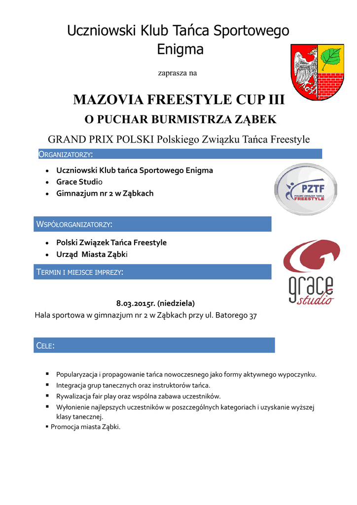 Uczniowski Klub Tańca Sportowego Enigma zaprasza na MAZOVIA FREESTYLE CUP III O PUCHAR BURMISTRZA ZĄBEK GRAND PRIX POLSKI Polskiego Związku Tańca Freestyle ORGANIZATORZY: Uczniowski Klub tańca Sportowego Enigma Grace Studio Gimnazjum nr 2 w Ząbkach WSPÓŁORGANIZATORZY: Polski Związek Tańca Freestyle Urząd Miasta Ząbki TERMIN I MIEJSCE IMPREZY: 8.03.2015r. (niedziela) Hala sportowa w gimnazjum nr 2 w Ząbkach przy ul. Batorego 37 CELE: Popularyzacja i propagowanie tańca nowoczesnego jako formy aktywnego wypoczynku. Integracja grup tanecznych oraz instruktorów tańca. Rywalizacja fair play oraz wspólna zabawa uczestników. Wyłonienie najlepszych uczestników w poszczególnych kategoriach i uzyskanie wyższej klasy tanecznej. Promocja miasta Ząbki. KATEGORIE: KONKURENCJA DYSCYPLINA KATEGORIA WIEKOWA Solo: Open oraz Debiuty i klasy: E,D,C,B,A,S (PZTF) Są to turnieje kwalifikacyjne Duety: Open oraz poiziomy: E+D,C+B,A+S Małe grupy (3-7 osób) Il liga, I liga, ekstraliga Klasy Dzieci: Do 7 lat/2008 i młodsi 8-9 lat/2007-2006 Formacje (8-24 osób) II liga, I liga, ekstraliga 10-11 lat/2005 – 2004 Solo: Open oraz Debiuty i klasy: E,D,C,B,A,S (PZTF) 12-13 lat/2003 – 2002; DISCO DANCE Są to turnieje kwalifikacyjne Duety: open oraz poziomy: E+D,C+B,A+S Juniorzy: 14-15 lat/2001-2000 Dorośli: 16+/1999 i starsi Małe grupy (3-7 osób) Il liga, I liga, ekstraliga Formacje (8-24 osób) II liga, I liga, ekstraliga HIP HOP Solo: Debiuty i klasy: E,D,C,B,A,S (PZTF) Są to turnieje kwalifikacyjne Małe grupy (3-7 osób) Il liga, I liga, ekstraliga Formacje (8-240sób) II liga, I liga, ekstraliga JAZZ DANCE Solo: Debiuty i klasy: E,D,C,B,A,S (PZTF) Są to turnieje kwalifikacyjne Małe grupy (3-7 osób): II liga, I liga, ekstraliga MODERN Formacje (8-24 osób) II liga, I liga, ekstraliga INNE FORMY Formacje: II liga, I liga, ekstraliga Debiuty Open Małe grupy Formacje Inne formy Dzieci: Do 11 lat/2004 i młodsi Juniorzy: 12- 15 lat/2003- 2000 Dorośli: 16+/1999 i starsi Serdecznie zapraszamy wszystkich tancerzy do rywalizacji w: solo open duety open - o przynależności do danej kategorii wiekowej decyduje wiek starszego uczestnika małe Grupy (3-7 osób), formacje (8-24 osoby), zespoły Inne Formy (3 i więcej osób) / Ekstraliga, I Liga, II Liga- o przynależności do danej kategorii wiekowej decyduje wiek najstarszego uczestnika. Ligi zespołów (charakterystyka): II liga – zespoły początkujące, zespoły szkolne I liga – zespoły średniozaawansowane (uczestnicy ogólnopolskich festiwali i turniejów) ekstraliga – zespoły zaawansowane (uczestnicy MŚ, ME, PE, KM IDO, finaliści dużych festiwali). Kategorie debiuty, poziomy, klasy taneczne zostaną rozegrane dla tancerzy zrzeszonych w PZTF. CZAS PREZENTACJI: solo Disco Dance; Hip-Hop; Jazz Dance; Modern - 1.00 min. (muzyka organizatora) Uwaga: Jazz Dance / Modern muzyka własna dla kl. A i S /short program do półfinału duet Disco Dance; Hip-Hop - 1.00 min. (muzyka organizatora) mała Grupa Disco Dance; Hip-Hop - 2.00 min. (muzyka organizatora) mała Grupa Disco Dance 11.- - 1.30 min. (muzyka organizatora) mała Grupa Jazz Dance; Modern - 2 min.30s - 3 min. (muzyka własna) formacja Disco Dance; Hip-Hop - 2 min.30 s - 3 min. (muzyka własna) formacja Jazz Dance; Modern - 2 min. 30 s - 4 min. (muzyka własna) Inne formy - 2 min. 30 s - 5 min. (muzyka własna) WARUNKI UCZESTNICTWA: Zgłoszenie się on-line www.pztf.pl w terminie do 1.03.2015r. i przesłanie zgłoszenia na adres email: [email protected] Opłaty startowa: • solo / duety: 30 zł od osoby - dla członków uczestników PZTF • debiuty 20 zł od osoba - dla członków uczestników PZTF • mała Grupa, formacja, zespół: 10 zł od osoby - dla członków uczestników PZTF Uwaga: Tancerze PZTF za udział w więcej niż 1 konkurencji – dodatkowo 10 zł za każdy start • tancerze zrzeszeni w PFT płacą 30 zł od osoby za udział w każdej konkurencji solo i duetach oraz 15 zł za udział w małych Grupach, Formacjach i zespołach • tancerze niezrzeszeni w PZTF i PFT płacą o 100% wyższą odpłatność za udział w konkurencji open solo i duety oraz w małych Grupach, formacjach i zespołach oraz dodatkowo płacą 15zł od osoby za udział w następnych konkurencjach (dotyczy:małe Grupy, formacje, zespoły). Opłatę startową zbiorczo za wszystkich zawodników należy przesłać na konto: Uczniowski Klub Tańca Sportowego Enigma nr konta 23 1140 2004 0000 3450 8421 3625 w treści przelewu należy wpisać przykładowo: KLUB XYZ opłata startowa Mazovia Freestyle Cup 2015 Rejestracja zespołu w dniu imprezy zgodnie z Programem Ramowym. Przygotowanie muzyki własnej oddzielnie na każdą prezentację opisaną w następujący sposób: nazwa zespołu, kategoria, tytuł prezentacji, czas trwania. Podporządkowanie się zaleceniom organizacyjnym, przepisom BHP i PPOŻ. Podporządkowanie się przepisom szczegółowym turnieju. Tańczenie w obuwiu sportowym, które nie niszczy parkietu. Turniej został zatwierdzony przez Zarząd PZTF i zostanie rozegrany zgodnie z przepisami PZTF. UWAGA 2.03 .2015r. stanowi ostateczną datę wniesienia opłaty startowej. Po tym terminie organizator zastrzega sobie prawo nie przyjęcia zgłoszenia. W przypadku przyjęcia zgłoszenia po terminie odpłatność za udział wzrasta dwukrotnie. Uczestnik ma prawo wycofać się z udziału w turnieju na każdym etapie. W takim przypadku, jak również w przypadku niezakwalifikowania się do dalszych rund, opłata startowa nie podlega zwrotowi. KOMISJA SĘDZIOWSKA: Skład Komisji Sędziowskiej minimum 5 licencjonowanych sędziów PZTF. Przy obliczaniu wyników finału stosowany jest Skating System. W kategorii Debiuty ocena szkolna. Małe Grupy i Formacje w II i I Lidze oceniane są na miejsca I, II, III. RAMOWY PROGRAM TURNIEJU: Godzina Kategoria 7:30 Otwarcie hali Od 8:00 Rejestracja 9:30 – 13:30 DISCO DANCE 10:30 – 13:30 JAZZ 13:30 – 14:30 Przerwa obiadowa 14:30 – 17:30 INNE
