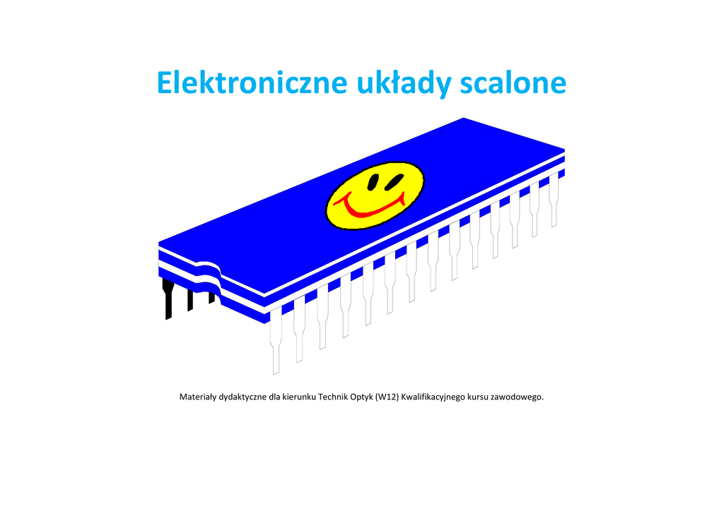 Elektroniczne układy scalone Materiały dydaktyczne dla kierunku Technik Optyk (W12) Kwalifikacyjnego kursu zawodowego. Układy scalone Układ scalony, jest to układ elektroniczny wytworzony w podłożu monolitycznym lub na jego powierzchni, realizujący określona funkcję. Jest on elementem podstawowym, pojedynczym i niepodzielnym, stosowanym w konstrukcji większych urządzeń elektronicznych. Układy scalone możemy podzielić na: • analogowe - sygnał elektroniczny ciągły, przetwarzany w czasie. Zarówno sygnał wejściowy jak i wyjściowy mają postać funkcji ciągłej. • cyfrowe - sygnał elektroniczny dwupoziomowy, zero – jedynkowy. Występuje w postaci impulsów o dwóch umownych poziomach – niski – L i wysoki – H. • hybrydowe – stanowią połączenie obwodów analogowych i cyfrowych we wspólnej obudowie. Ze względu na ilość elementów umieszczonych we wspólnej obudowie i tworzącej określoną strukturę mówimy o układach scalonych. Są one montowane w ujednoliconej obudowie, choć zawierają często różnorodne elementy o wielu zastosowaniach. Układy scalone określa ich skala integracji: • SSI - mała (do 100 elementów) • MSI - średnia (100 – 1000 elementów) • LSI - duża (1000 – 100000 elementów) • VLSI - bardzo duża (powyżej 100000 elementów) Układy scalone wykonywane są w różnorodnych technologiach: • TTL • ECL • MOS • CMOS • BiCMOS Przykładowe układy scalone Przykładowy cyfrowy układ scalony Mikroprocesory Mikroprocesor jest to układ cyfrowy wykonany jako układ scalony lub kilka układów scalonych zdolny do wykonywania operacji cyfrowych według dostarczonych mu instrukcji. W kaŜdym mikroprocesorze moŜemy wyróŜnić następujące elementy: • ALU (Arithmetic and Logical Unit) - Jednostka arytmetycznologiczna. • CU (ang. Control Unit) - Interpreter Rozkazów. • Rejestry • Szyna danych • Szyna adresowa KaŜdy bardziej skomplikowany mikroprocesor zaklasyfikować do jednej z trzech architektur: • CISC (Complex Instruction Set Computers) • RISC (Reduced Instruction Set Computers) • VLIW (Very Long Instruction Word) Schemat blokowy mikroprocesora moŜna Struktura mikroprocesora ADUC845 Program jest umieszczony w pamięci, czyli specjalizowanym układzie elektronicznym, który moŜe przechowywać informacje. Jest ona złoŜona z komórek pamięci zawierających niepowtarzalany adres i określoną liczbę bitów. Bit to podstawowa, jednostka informacji, która moŜe przyjąć wartość zera lub jedynki. Mikroprocesor adresuje określoną komórkę pamięci za pomocą tzw. szyny adresowej. Jej zawartość, poprzez szynę danych, trafia do mikroprocesora. W ten sposób następuje pobranie kodu rozkazu, który za, pośrednictwem bloku interpretera rozkazów uruchamia proces wykonania rozkazu. Lista moŜliwych rozkazów zaleŜy od typu mikroprocesora i moŜe być naprawdę rozmaita... Za operacje logiczne i arytmetyczne, jakie są, wykonywane na polecenie programu, jest odpowiedzialna jednostka arytmetyczno-logiczna. To jej moŜliwości decydują o tzw. mocy obliczeniowej mikroprocesora. Mikroprocesor ma rejestry, czyli własne komórki pamięci. Ich liczba i przeznaczenie są bardzo indywidualne, ale o kilku z nich warto wspomnieć. NajwaŜniejszy jest licznik rozkazów, który po wykonaniu bieŜącego rozkazu zwiększa swą wartość, czyli pozwala sięgnąć po następny rozkaz zapisany w pamięci. Kolejnym waŜnym rejestrem jest akumulator. Jego zadaniem jest przechowanie danych, nad którymi do woli moŜe się pastwić ALU. Literatura: J.Nowicki „Podstawy elektrotechniki i elektroniki dla ZSN” WSiP 1999 A.Chochowski „Podstawy elektrotechniki i elektroniki dla elektryków” cz. 2. WSiP 2011