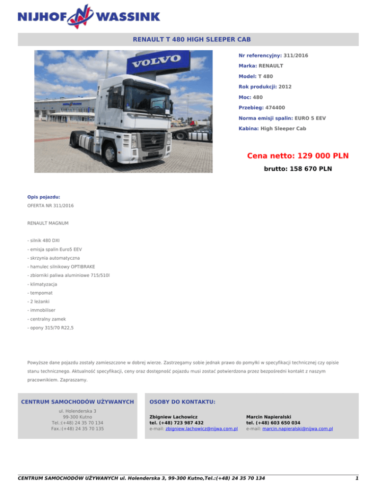 RENAULT T 480 HIGH SLEEPER CAB Nr referencyjny: 311/2016 Marka: RENAULT Model: T 480 Rok produkcji: 2012 Moc: 480 Przebieg: 474400 Norma emisji spalin: EURO 5 EEV Kabina: High Sleeper Cab Cena netto: 129 000 PLN brutto: 158 670 PLN Opis pojazdu: OFERTA NR 311/2016 RENAULT MAGNUM - silnik 480 DXI - emisja spalin Euro5 EEV - skrzynia automatyczna - hamulec silnikowy OPTIBRAKE - zbiorniki paliwa aluminiowe 715/510l - klimatyzacja - tempomat - 2 leżanki - immobiliser - centralny zamek - opony 315/70 R22,5 Powyższe dane pojazdu zostały zamieszczone w dobrej wierze. Zastrzegamy sobie jednak prawo do pomyłki w specyfikacji technicznej czy opisie stanu technicznego. Aktualność specyfikacji, ceny oraz dostępność pojazdu musi zostać potwierdzona przez bezpośredni kontakt z naszym pracownikiem. Zapraszamy. CENTRUM SAMOCHODÓW UŻYWANYCH ul. Holenderska 3 99-300 Kutno Tel.:(+48) 24 35 70 134 Fax.:(+48) 24 35 70 135 OSOBY DO KONTAKTU: Zbigniew Lachowicz tel. (+48) 723 987 432 e-mail: [email protected] Marcin Napieralski tel. (+48) 603 650 034 e-mail: [email protected] CENTRUM SAMOCHODÓW UŻYWANYCH ul. Holenderska 3, 99-300 Kutno,Tel.:(+48) 24 35 70 134 1 CENTRUM SAMOCHODÓW UŻYWANYCH ul. Holenderska 3, 99-300 Kutno,Tel.:(+48) 24 35 70 134 2 CENTRUM SAMOCHODÓW UŻYWANYCH ul. Holenderska 3, 99-300 Kutno,Tel.:(+48) 24 35 70 134 3 CENTRUM SAMOCHODÓW UŻYWANYCH ul. Holenderska 3, 99-300 Kutno,Tel.:(+48) 24 35 70 134 4 http://ciezarowki-uzywane.pl/renault-t-480-high-sleeper-cab-c253.html CENTRUM SAMOCHODÓW UŻYWANYCH ul. Holenderska 3, 99-300 Kutno,Tel.:(+48) 24 35 70 134 5