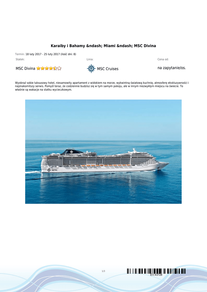 Karaiby i Bahamy – Miami – MSC Divina Termin: 18 luty 2017 - 25 luty 2017 (ilość dni: 8) Statek: MSC Divina Linia: Cena od: MSC Cruises na zapytanie/os. Wyobraź sobie luksusowy hotel, niesamowity apartament z widokiem na morze, wykwintną światową kuchnię, atmosferę ekskluzywności i najznakomitszy serwis. Pomyśl teraz, że codziennie budzisz się w tym samym pokoju, ale w innym niezwykłym miejscu na świecie. To właśnie są wakacje na statku wycieczkowym. 1/3 EV:43728 TRASA REJSU dzień 1 Data Port Wpłynięcie Wypłynięcie sobota 18.02.2017 Miami, Floryda 19:00 19:00 Stany Zjednoczone dzień 2 niedziela 19.02.2017 Dzień na morzu --:-- --:-- dzień 3 poniedziałek 20.02.2017 Dzień na morzu --:-- --:-- dzień 4 wtorek 21.02.2017 Philipsburg 09:00 18:00 środa 22.02.2017 San Juan 08:00 16:00 dzień 6 czwartek 23.02.2017 Dzień na morzu --:-- --:-- dzień 7 piątek 24.02.2017 Nassau 12:00 18:00 Bahamy sobota 25.02.2017 07:00 07:00 Stany Zjednoczone dzień 5 dzień 8 Legenda Sint Maarten Portoryko Miami, Floryda CENNIK Cena katalogowa Kabina wewnętrzna na zapytanie Kabina zewnętrzna z oknem na zapytanie Kabina zewnętrzna z balkonem na zapytanie Suite (apartament) na zapytanie MSC Yacht Club Suite na zapytanie Kabina jednoosobowa na zapytanie 3 i 4 osoba dorosła w kabinie na zapytanie dziecko od 2 do 12 lat jako 3 i 4 osoba w kabinie Cena promocyjna tylko opłaty portowe 2/3 EV:43728 dziecko od 13 do 17 lat jako 3 i 4 osoba w kabinie Opłaty portowe na zapytanie €120.00 Uwaga! Ceny za osobę w kabinie dwuosobowej. Cena zawiera: zakwaterowanie w kabinie wybranej kategorii; wyżywienie - 3 główne posiłki, przekąski między posiłkami, bufet lub przekąski o północy; napoje serwowane do śniadania i w bufetach samoobsługowych; serwis bagażowy podczas wejścia i zejścia ze statku; serwis kabinowy; korzystanie ze wszystkich urządzeń sportowo - rekreacyjnych znajdujących się na pokładzie statku (basen, jacuzzi, sala fitness, itp.); udział we wszystkich imprezach organizowanych na statku (przedstawienia w teatrze, koncerty, programy animacyjne itp.). Cena nie zawiera: kosztów dojazdu do portu; opłat portowych; ewentualnych noclegów w hotelu przed/po rejsie i transferów; wycieczek fakultatywnych w trakcie rejsu; korzystania z barów, mini baru w kabinie oraz napojów zamawianych w restauracji; korzystania z punktów usługowych (fryzjer, pralnia, fotograf, salon piękności i odnowy biologicznej, internet) i wydatków osobistych; napiwków dla obsługi na statku (kwota uzależniona od długości rejsu); ubezpieczenia KL, NNW i bagaż, kosztów wiz (tam gdzie wymagane). Uwagi: na wszystkich rejsach MSC Cruises można zarezerwować pakiety all inclusive: Allegrissimo 24h: 26€/os./dzień i 12€/dziecko/dzień; Allegrissimo Premium: 44€/os./dzień i 21€/dziecko/dzień (pakiet musi być wykupiony przez każdą osobę zakwaterowaną w kabinie - można zakupić w biurze przed rejsem). Na Państwa życzenie zarezerwujemy przelot, transfery do/z portu, parking, dodatkowe noclegi oraz zadbamy o odpowiednie ubezpieczenie podróżne. 3/3 EV:43728