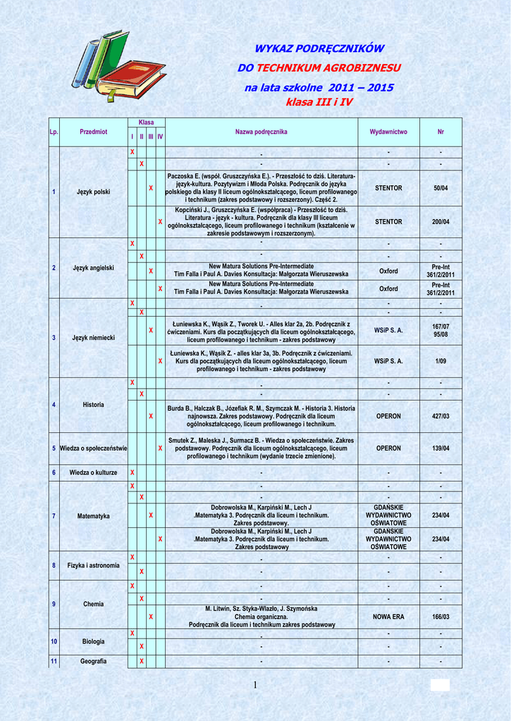WYKAZ PODRĘCZNIKÓW DO TECHNIKUM AGROBIZNESU na lata szkolne 2011 – 2015 klasa III i IV Klasa Lp. Przedmiot I II III IV Nazwa podręcznika Wydawnictwo Nr - - - - - STENTOR 50/04 STENTOR 200/04 - - X X 1 X Język polski X Paczoska E. (współ. Gruszczyńska E.). - Przeszłość to dziś. Literaturajęzyk-kultura. Pozytywizm i Młoda Polska. Podręcznik do języka polskiego dla klasy II liceum ogólnokształcącego, liceum profilowanego i technikum (zakres podstawowy i rozszerzony). Część 2. Kopciński J., Gruszczyńska E. (współpraca) - Przeszłość to dziś. Literatura - język - kultura. Podręcznik dla klasy III liceum X ogólnokształcącego, liceum profilowanego i technikum (kształcenie w zakresie podstawowym i rozszerzonym). - X 2 Język angielski X X X Łuniewska K., Wąsik Z., Tworek U. - Alles klar 2a, 2b. Podręcznik z ćwiczeniami. Kurs dla początkujących dla liceum ogólnokształcącego, liceum profilowanego i technikum - zakres podstawowy X 3 New Matura Solutions Pre-Intermediate Tim Falla i Paul A. Davies Konsultacja: Małgorzata Wieruszewska New Matura Solutions Pre-Intermediate Tim Falla i Paul A. Davies Konsultacja: Małgorzata Wieruszewska 1/09 - - - - Burda B., Halczak B., Józefiak R. M., Szymczak M. - Historia 3. Historia najnowsza. Zakres podstawowy. Podręcznik dla liceum ogólnokształcącego, liceum profilowanego i technikum. OPERON 427/03 Smutek Z., Maleska J., Surmacz B. - Wiedza o społeczeństwie. Zakres podstawowy. Podręcznik dla liceum ogólnokształcącego, liceum profilowanego i technikum (wydanie trzecie zmienione). OPERON 139/04 - - - - - - Dobrowolska M., Karpiński M., Lech J .Matematyka 3. Podręcznik dla liceum i technikum. Zakres podstawowy. Dobrowolska M., Karpiński M., Lech J .Matematyka 3. Podręcznik dla liceum i technikum. Zakres podstawowy - - GDAŃSKIE WYDAWNICTWO OŚWIATOWE GDAŃSKIE WYDAWNICTWO OŚWIATOWE - - - - - - - M. Litwin, Sz. Styka-Wlazło, J. Szymońska Chemia organiczna. Podręcznik dla liceum i technikum zakres podstawowy - - NOWA ERA 166/03 - - X - - - X - - - - Historia X 5 Wiedza o społeczeństwie X X X X 7 X Matematyka X X 8 Fizyka i astronomia X X 9 X Chemia X X 10 Biologia 11 Geografia - WSiP S. A. Łuniewska K., Wąsik Z. - alles klar 3a, 3b. Podręcznik z ćwiczeniami. Kurs dla początkujących dla liceum ogólnokształcącego, liceum profilowanego i technikum - zakres podstawowy X Wiedza o kulturze Oxford 167/07 95/08 X 6 Oxford Pre-Int 361/2/2011 Pre-Int 361/2/2011 - WSiP S. A. X Język niemiecki X 4 - 1 234/04 234/04 - Mordawski J., Wiecki W. - Geografia Polski. Geografia 3. Zakres podstawowy. Podręcznik dla liceum ogólnokształcącego, liceum profilowanego i technikum. OPERON 326/03 - - - - - - - - - X - - - Produkcja i pozyskiwanie X surowców X żywnościowych - - - - - - X - - - Podstawy przetwórstwa spożywczego. Praca zbiorowa pod redakcją A. Zajączkowskiej Format AB 73/98 Podstawy przetwórstwa spożywczego. Praca zbiorowa pod redakcją A. Zajączkowskiej Format AB 73/98 - - - X - - - X Anna Kuczyńska - Cesarz Rachunkowość część 1 Anna Kuczyńska - Cesarz Rachunkowość część 2 - - DIFIN 42/03 DIFIN 43/03 - - - - - - - - - Komosa Andrzej Praca biurowa cz. II - - EKONOMIK 1/03 - - - H. Hamera, J. Wołoszyn Wybrane zagadnienia z psychologii społecznej Format AB 58/97 - - - WSiP 33/00 WSiP 33/00 Polskie Wydawnictwo Ekonomiczne - Polskie Wydawnictwo Ekonomiczne - WSiP 22/2006 WSiP 22/2006 WSiP 84/98 WSiP 84/98 - - Format-AB 26/2004 eMPi2 12/02 Format-AB 26/2004 eMPi2 45/05 WAM Pallottinum AZ-4-01/1 X 12 13 14 15 16 17 Podstawy przedsiębiorczości Technologia Informacyjna Wychowanie fizyczne Przysposobienie obronne X X X X X X Podstawy przetwórstwa spożywczego X X 18 Podstawy ekonomii X X 19 Elementy rachunkowości X 20 Wybrane zagadnienia prawne Brak X X X X 21 Technika biurowa i komputerowa X X Przepisy ruchu 22 drogowego Wybrane zagadnienia z 23 psychologii społecznej X X X 24 Ekonomika agrobiznesu X X X 25 Język obcy w agrobiznesie X 26 Marketing w agrobiznesie X X X 27 Zarządzanie firmą X 28 Przedsiębiorczość X X 29 Przedmiot specjalizacyjny X X X 30 Religia X X X X A. Grontkowska Podstawy ekonomiki agrobiznesu cz.2 A. Grontkowska Podstawy ekonomiki agrobiznesu cz.2 Literatura pomocnicza: B. Pawłowska “New Business English” Z. Kopestyńska “Business Correspondence” Literatura pomocnicza: B. Pawłowska “New Business English” Z. Kopestyńska “Business Correspondence” H.Szulce, M.Florek, T.Żyminkowski Marketing H.Szulce, M.Florek, T.Żyminkowski Marketing Literatura pomocnicza: E. Niedzielski, A. Łapińska Zarządzanie firmą Literatura pomocnicza: E. Niedzielski, A. Łapińska Zarządzanie firmą Brak B.Mikuta, K.Żelazna Organizacja ruchu turystycznego na wsi Marian Pietraszewski Elżbieta Strzyżewska Jerzy Szwajor Finanse cz. 1 B.Mikuta, K.Żelazna Organizacja ruchu turystycznego na wsi Ryszard Doll, Marian Pietraszewski, Bronisław Stawicki Finanse cz. 2 Pismo Święte Nowego Testamentu 2