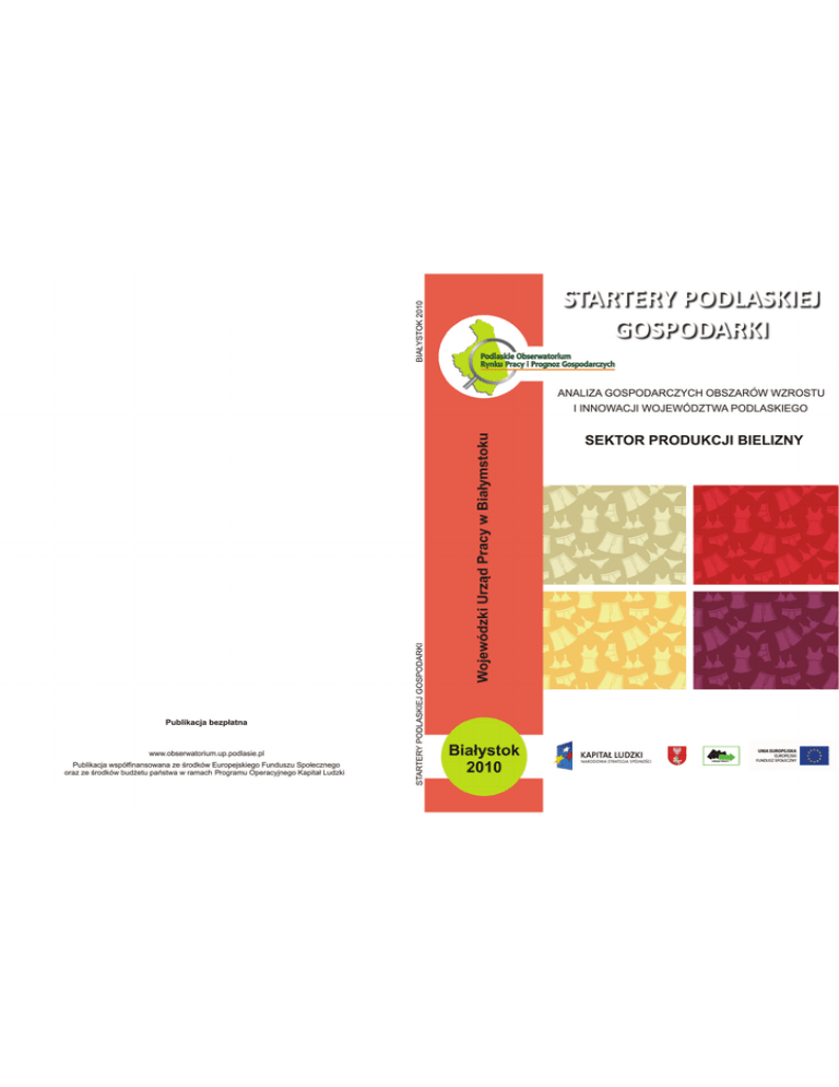 STARTERY PODLASKIEJ GOSPODARKI ANALIZA GOSPODARCZYCH OBSZARÓW WZROSTU I INNOWACJI WOJEWÓDZTWA PODLASKIEGO SEKTOR PRODUKCJI BIELIZNY ZESPÓŁ BADAWCZY prof. nadzw. dr hab. Bogusław Plawgo dr Anna Grabska dr Magdalena Klimczuk mgr Mariusz Citkowski mgr Marta Juchnicka mgr Agnieszka Sosnowicz mgr Justyna Żynel-Etel mgr Kamil Leszko KONSULTACJA Andrzej Kuźmicki ISBN 978-83-62258-10-9 © COPYRIGHT BY WOJEWÓDZKI URZĄD PRACY W BIAŁYMSTOKU BIAŁYSTOK 2010 Badanie zostało przeprowadzone w ramach projektu: „PODLASKIE OBSERWATORIUM RYNKU PRACY I PROGNOZ GOSPODARCZYCH” przez Fundację BFKK współfinansowanego ze środków Europejskiego Funduszu Społecznego w ramach Programu Operacyjnego Kapitał Ludzki, Działanie 8.1 Rozwój pracowników i przedsiębiorstw w regionie, Poddziałanie 8.1.4 Przewidywanie zmiany gospodarczej www.obserwatorium.up.podlasie.pl DRUK: Druk123.pl Wojewódzki Urząd Pracy w Białymstoku Podlaskie Obserwatorium Rynku Pracy i Prognoz Gospodarczych STARTERY PODLASKIEJ GOSPODARKI – SEKTOR PRODUKCJI BIELIZNY Spis treści 1. Koncepcja badania ................................................................................................................. 6 1.1. Uzasadnienie badania ...................................................................................................... 6 1.2. Cele badania .................................................................................................................... 7 1.3. Zakres przedmiotowy badania ......................................................................................... 8 1.4. Obszary analizy ............................................................................................................... 8 2. Metodologia badań ................................................................................................................. 9 2.1. Opis metodologii badania – wstęp................................................................................... 9 2.2. Techniki badawczo-analityczne .................................................................................... 10 2.2.1. Zespół badawczy z ekspertami (ZE) ....................................................................... 10 2.2.2. Desk research (DR) ................................................................................................. 11 2.2.3. Zogniskowany wywiad grupowy (FGI) .................................................................. 11 2.2.4. Indywidualne wywiady pogłębione (IDI/ITI) ......................................................... 12 2.2.5. Seminarium (S) ....................................................................................................... 12 3. Charakterystyka sektora ....................................................................................................... 13 3.1. Historia .......................................................................................................................... 13 3.2. Stan obecny.................................................................................................................... 14 3.3. Produkty......................................................................................................................... 18 3.4. Dystrybucja .................................................................................................................... 19 3.5. Kierunki rozwoju ........................................................................................................... 21 4. Popytowo-podażowe zewnętrzne uwarunkowania rozwojowe sektora ............................... 23 4.1. Analiza czynników popytowych ................................................................................... 24 4.1.1. Czynniki ekonomiczne............................................................................................ 24 4.1.2. Czynniki społeczne ................................................................................................. 30 4.1.3. Czynniki prawno-administracyjne .......................................................................... 35 4.2. Analiza czynników podażowych ................................................................................... 38 4.2.1. Czynniki ekonomiczne............................................................................................ 38 4.2.2. Czynniki społeczne ................................................................................................. 47 4.2.3. Czynniki technologiczne ......................................................................................... 50 5. Analiza sił konkurencji w sektorze ...................................................................................... 53 5.1. Siła przetargowa dostawców ......................................................................................... 53 5.1.1. Stopień koncentracji sektora dostawcy ................................................................... 54 5.1.2. Uzależnienie od jakości dostaw .............................................................................. 54 5.1.3. Udział dostaw w kosztach ....................................................................................... 55 5.1.4. Koszty zmiany dostawcy ........................................................................................ 55 5.1.5. Groźba integracji w przód ....................................................................................... 55 5.2. Siła przetargowa nabywców .......................................................................................... 55 5.2.1. Stopień koncentracji odbiorców ............................................................................. 56 5.2.2. Uzależnienie nabywców od jakości ........................................................................ 57 5.2.3. Udział w kosztach odbiorcy (wrażliwość na cenę) ................................................. 57 5.2.4. Koszty zmiany dostawcy przez 