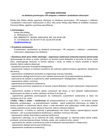 ZAPYTANIE OFERTOWE na działania promocyjne i PR związane z mlekiem i produktami mlecznymi Polska Izba Mleka składa zapytanie ofertowe na działania promocyjne i PR związane z mlekiem i produktami mlecznymi realizowanie w 2011 roku przez Polską Izbę Mleka ze środków Funduszu Promocji Mleka, zgodnie z poniższą specyfikacją: 1.Zamawiający: Polska Izba Mleka, ul. Mickiewicza 7/23 KRS: 0000307577, REGON: 200214918, NIP: 542 30 85 199 15 -213 Białystok, Tel. 85 674 73 29, Fax 85 874 43 88 [email protected] 2.Przedmiot zamówienia: Przedmiotem zamówienia są działania promocyjne i PR związane z mlekiem i produktami mlecznymi, obejmujące trzy działania: 1)Światowy dzień picia mleka szkolnego – organizacja wydarzenia (otwartej imprezy plenerowej) skierowanego do dzieci w wieku szkolnym na terenie miasta Białystok w terminie na koniec maja 2011, pokazującego dzieciom w formie zabawy i nauki, że mleko to ważny produkt w diecie dziecka. Zakres zadania obejmuje: - pozyskanie patronatu Prezydenta Białegostoku, - zapewnienie miejsca na świeżym powietrzu do realizacji zadania (miejsce ogrodzone, bezpieczne dla dzieci), - zapewnienie niezbędnych pozwoleń na organizację imprezy masowej, - zapewnienie obsługi technicznej w tym mediów koniecznych do przeprowadzenia działania, - zaproszenie do udziału w wydarzeniu szkół podstawowych z Białegostoku i okolic, - zapewnienie zabaw i animacji, - zapewnienie prowadzenia wydarzenia, - zapewnianie promocji wydarzenia na terenie miasta Białystok i innych okolicznych miejscowości/ miast, - zapewnienie atrakcji w formie zabaw ruchowych dla dzieci, w tym zabawki nadmuchiwane dostosowane do dzieci w wieku szkolnym od klasy 0 do klasy VI, - zapewnienie gadżetów promocyjnych do rozdawania uczestnikom wydarzenia w ilości nie mniejszej niż 5 tys. sztuk. 2)Fakty i Mity o mleku – konferencja do przeprowadzenia w maju 2011 r. na terenie miasta Białystok, przekazująca - za pośrednictwem mediów - opinii publicznej informacje, że mleko to ważny produkt w codziennej diecie dzieci i osób dorosłych oraz pokazująca mleko jako produkt modny, polecany przez osoby aktywne fizycznie. Zakres realizacji zadania: - zapewnienie - w hotelu co najmniej 3 gwiazdkowym lub innym miejscu zapewniającym wysoki standard – sali na przeprowadzenie konferencji z udziałem minimum 50 osób, - zapewnienie udziału dziennikarzy podczas konferencji, - zapewnieni cateringu na co najmniej 50 osób, obejmującego: co najmniej jedno danie ciepłe, przekąski, przerwę kawową (kawa, herbata, woda, sok, ciastka kruche, ciasto) - zaproszenie do udziału w konferencji osób ze środowisk nauczycielskich i medycznych, - zapewnienie obsługi technicznej konferencji, - zapewnienie moderatora konferencji, - zapewnienie prelegentów, w tym co najmniej jednej osoby z tytułem profesorskim. 3)Dziecięca mleczna wyspa - organizacja wydarzenia skierowanego do dzieci w wieku szkolnym na terenie miasta Warszawy w ogrodach Szkoły Głównej Gospodarstwa Wiejskiego, w terminie czerwiec 2011, pokazującego dzieciom w formie zabawy i nauki, że mleko to ważny produkt w diecie dziecka, zakres zadania obejmuje: - pozyskanie partnerstwa Ministerstwa Rolnictwa i Rozwoju Wsi, - zabezpieczenie miejsca do realizacji zadania – poprzez wygrodzenie miejsca realizacji imprezy - zapewnienie obsługi technicznej w tym mediów koniecznych do przeprowadzenia wydarzenia, - zapewnienie zabaw i animacji, w tym konkursów i zabaw o tematyce mlecznej, - zapewnienie prowadzenia wydarzenia, - zapewnienie nagłośnienia i mini sceny, - zapewnianie ulotek promujących spożycie mleka (format A4, bigowane, pełen kolor) w ilości co najmniej 10 tys. szt, - zapewnienie atrakcji w formie zabaw ruchowych dla dzieci, - zapewnienie ubezpieczenia imprezy masowej. 1.Termin realizacji oferty: Wykonawca będzie związany ofertą przez okres 10 dni roboczych. Bieg terminu związania ofertą rozpoczyna się wraz z upływem terminu składnia ofert. 2.Okres gwarancji: nie dotyczy 3.Miejsce i termin złożenia oferty: Ofertę należy wysłać na adres e-mail: [email protected] w terminie do 28 lutego 2011 r. do godz. 12.00. 4.Termin rozstrzygnięcia zapytania: 1 marca 2011 5.Warunki płatności: Przelew po wykonaniu usługi na podstawie wystawionej faktury VAT, dostarczonej do siedziby Zamawiającego, w terminie do 14 dni. 6.Osoba upoważniona do kontaktu z wykonawcami: Agnieszka Maliszewska tel. 85 674-73-29 7.Sposób przygotowania oferty : Ofertę należy sporządzić w języku polskim. Opis kryteriów, którymi Zamawiający będzie się kierował przy wyborze oferty: 1)cena oferty –maksymalną liczbę punktów (80) otrzyma Wykonawca, który zaproponuje najniższą całkowitą cenę za wykonanie przedmiotu zamówienia, 2)doświadczenie w wydatkowaniu środków pochodzących z Funduszu Promocji Mleka – 20 punktów maksymalną liczbę punktów (20) otrzyma Wykonawca, który wykaże się doświadczeniem w wydatkowaniu środków pochodzących z Funduszu Promocji Mleka poprzez przeprowadzenie co najmniej 2 (słownie: dwóch) zadań finansowanych ze środków FPM. Wraz z ofertą należy wówczas przedłożyć wykaz tych przeprowadzonych zadań. 1.Treść oferty: 1.nazwa wykonawcy: …………………………………………………………… 2.adres wykonawcy: ……………………………………………………………. 3.NIP: …………………………………………………………………………… 4.Regon: ………………………………………………………………………… 5.nr rachunku bankowego: ……………………………………………………… 6.Cena wykonania zadania: 1)cena ogólna wykonania całości zadania powinna być podana w kwocie brutto, 2)oferta powinna zawierać informacje o koszcie ogólnym każdego z wymienionych działań oraz szczegółowy kosztorys każdego zadania, 7.Zamawiający zastrzega sobie prawo do zmiany lub rezygna