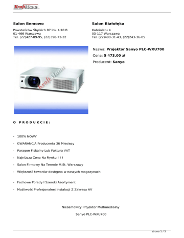 Salon Bemowo Salon Białołęka Powstańców Śląskich 87 lok. U10 B 01-466 Warszawa Tel. (22)427-89-95, (22)398-73-32 Kabrioletu 4 03-117 Warszawa Tel. (22)490-31-43, (22)243-36-05 Nazwa: Projektor Sanyo PLC-WXU700 Cena: 5 473,00 zł Producent: Sanyo O PRODUKCIE: - 100% NOWY - GWARANCJA Producenta 36 Miesięcy - Paragon Fiskalny Lub Faktura VAT - Najniższa Cena Na Rynku ! ! ! - Salon Firmowy Na Terenie M.St. Warszawy - Większość towarów dostępna w naszych magazynach - Fachowe Porady I Szeroki Asortyment - Możliwość Profesjonalnej Instalacji Z Zakresu AV Niesamowity Projektor Multimedialny Sanyo PLC-WXU700 strona 1 / 5 LCD / WXGA / 3800ANSI / 500:1 / HDMI / LAN / WLAN / USB 36 miesięczna gwarancja producenta 36 miesięczna gwarancja na lampę (door-to-door) Sanyo PLC-WXU700 to pierwszy na świecie projektor sieciowy, wykorzystujący protokół WLAN 802.11n, pozwalający na transmisję z przepustowością do 600 Mbit/sek. Tak wysoka prędkość przesyłu pozwala na wyświetlanie filmów standardzie HD. Co ważne, projektor sam komunikuje się z laptopem – do realizacji połączenia WiFi nie jest wymagana instalacja oprogramowania. Projektor pracuje w rozdzielczości WXGA (1280x800) z wysoką jasnością 3.800 ANSI lumenów i wyposażony jest w szerokokątny obiektyw (1.17 – 1.87) z dużym zoomem (1.6x). WXU700 umożliwia również odczyt danych (np. JPEG) z pamięci USB, dzięki czemu możliwa jest prezentacja bez laptopa. Urządzenie kompatybilne jest z systemami Windows XP oraz Vista, jak również Windows Embedded CE6.0. Urządzeniem można sterować przez sieć LAN i WLAN, a sygnał przesyłać można również przez jedno z wielu złącz (m.in. HDMI, D-Sub15, S-Video) Wszystkie projektory firmy SANYO objęte są 3-letnią gwarancją producenta, ewentualne naprawy realizowane są w trybie door-to-door, czyli przesyłka kurierska od klienta do serwisu i z powrotem na koszt serwisu. Specyfikacja techniczna: Technologia wyświetlania 3 x 0.74” TFT p-SI (16:10), micro lens Rozdzielczość WXGA 1.280 x 800 Jasność (STD/ECO) 3.800 ANSI Lumenów / 3.040 ANSI Lumenów Kontrast 500 : 1 Głośność (STD/ECO) 35 dB / 31 dB Format Obrazu 16:10 Waga 3.6 kg Kompatybilność komputerowa 140 MHz, H.Sync 15 – 100kHz V.Sync 50 – 100Hz UXGA, SXGA, SXGA+, WXGA, XGA, SVGA, VGA, WXGA+, WSXGA+, WUXGA Kompatybilność wideo Pal, Pal-M, Pal-N, SECAM, NTSC, NTSC4.43 Jednorodność 85 % Obiektyw f = 19.2 ~ 30.2mm, F = 1.7 ~ 2.5 Współczynnik odległości 1.17 - 1.87 : 1 Odległość od ekranu 0.99 m – 12.1 m Korekcja Trapezu Pionowa +/- 40 stopni Rodzaje Projekcji Przednia, Tylna, Przednia sufitowa, Tylna sufitowa Lampa 275W UHP (LMP-111) Żywotność lampy (STD/ECO) 2500 h / 3000 h Wymiary 335.7 x 93.9 x 257.5 mm (szer. x wys. x gł.) Zasilanie 100 – 240V, 50 – 60Hz. Pobór mocy (STD/ECO) 316W / 278W, 12.1W w trybie czuwania Wejścia 1 x D-Sub15 (RGB) lub wyjście monitorowe 1 x D-Sub15 (RGB/Component/SCART-RGB) 1 x HDMI (HDCP) 1 x RCA (Composite) 1 x Mini DIN 4-pin (S-Video) 1 x RJ45 (LAN) 1 x 3.5mm Stereo Jack (audio) 2 x RCA (R/L Mono) dla video 1 x D-Sub9 (RS232) 1 x USB type B 1 x USB type A 1 x 3.5mm Stereo Jack (sterowanie przewodowe pilotem) WLAN Wyjścia 1 x 3.5mm Stereo Jack (audio) Funkcje Auto-strojenie Blackboard mode Kod PIN Logo użytkownika Natychmiastowe wyłączanie Stop-Klatka Zabezpieczenie Kensington Sterowanie bezprzewodowe Audio Głośnik 1W, mono Pilot zdalnego sterowania Pilot na podczerwień Gwarancja 3 lata na projektor, 3 lata na lampę (max. 2.000 h), dla modeli zakupionych po 01.03.2010 r gwarancja na projektor wynosi 5 lat, 5 lat na lampę (max. 2.500 h)* Języki Menu Polski, Angielski, Niemiecki, Francuski, Włoski, Hiszpański, Portugalski, strona 2 / 5 Holenderski, Szwedzki, Fiński, Węgierski, Rumuński, Rosyjski, Chiński, Koreański i Japoński Dostarczane akcesoria Pilot bezprzewodowy wraz z bateriami, kabel zasilający, kabel D-SUb15, karta kodów PIN, torba transportowa, zaślepka obiektywu ze sznurkiem, instrukcja obsługi na CDROM, oprogramowanie Easy Network Set-Up (na USB) Akcesoria opcjonalne kabel SCART/D-Sub15 (POA-CA-SCART) kabel Components/D0Cub15 (POA-CA-COMPVGA) mocowanie podsufitowe 15 cm (POA-CM1) mocowanie podsufitowe 40-70 cm (POA-CM02) mocowanie podsufitowe 70-110 cm (POA-CM03) Gorąco zapraszamy po odbiór osobisty ! ! ! Wysyłamy również firmą kurierską ! ! ! UWAGA!!! Dodatkowo RABAT na dowolny ekran 10%! > > KLIKNIJ < < i/lub RABAT na dowolny uchwyt do projektora 10%! strona 3 / 5 > > KLIKNIJ < < Zapraszamy do odwiedzenia naszej siedziby na ul. Kabrioletu 4 (przy ul. Modli?skiej) oraz sklepu firmowego przy ul. Powst. ?l?skich 87 lok. 10A i 10B (przy skrzy?owaniu ulic Powsta?ców ?l?skich i Górczewskiej) gdzie istnieje mo?liwo?? odbioru osobistego zakupionego towaru. W razie pytań: strona 4 / 5 - zadzwoń tel. (022) 427-89-95 (pon-pt 9.00-17.00) kom. 0-501-726-922 * 0-512-207-819 (pon-nd 8.00-20.00) - napisz: [email protected] [email protected] [email protected] strona 5 / 5 Powered by TCPDF (www.tcpdf.org)