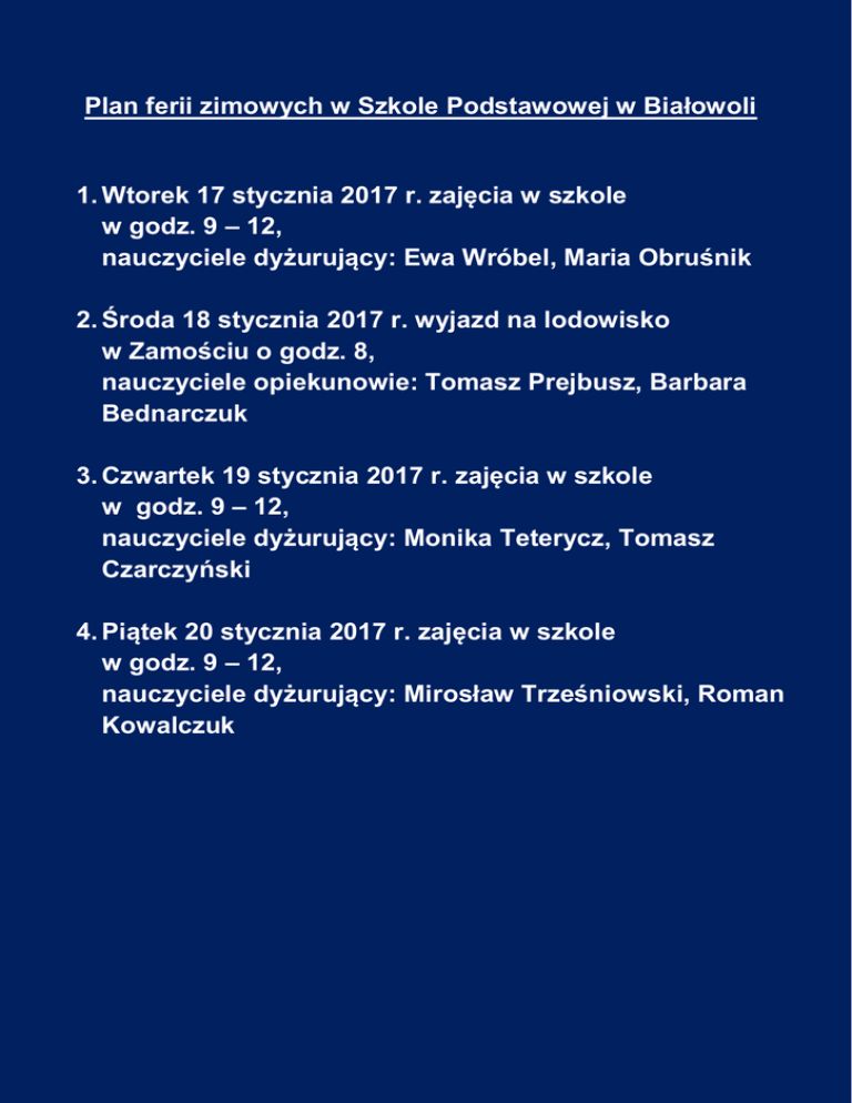 Plan ferii zimowych w Szkole Podstawowej w Białowoli 1. Wtorek 17 stycznia 2017 r. zajęcia w szkole w godz. 9 – 12, nauczyciele dyżurujący: Ewa Wróbel, Maria Obru nik 2. roda 18 stycznia 2017 r. wyjazd na lodowisko w Zamo ciu o godz. 8, nauczyciele opiekunowie: Tomasz Prejbusz, Barbara Bednarczuk 3. Czwartek 19 stycznia 2017 r. zajęcia w szkole w godz. 9 – 12, nauczyciele dyżurujący: Monika Teterycz, Tomasz Czarczyński 4. Piątek 20 stycznia 2017 r. zajęcia w szkole w godz. 9 – 12, nauczyciele dyżurujący: Mirosław Trze niowski, Roman Kowalczuk