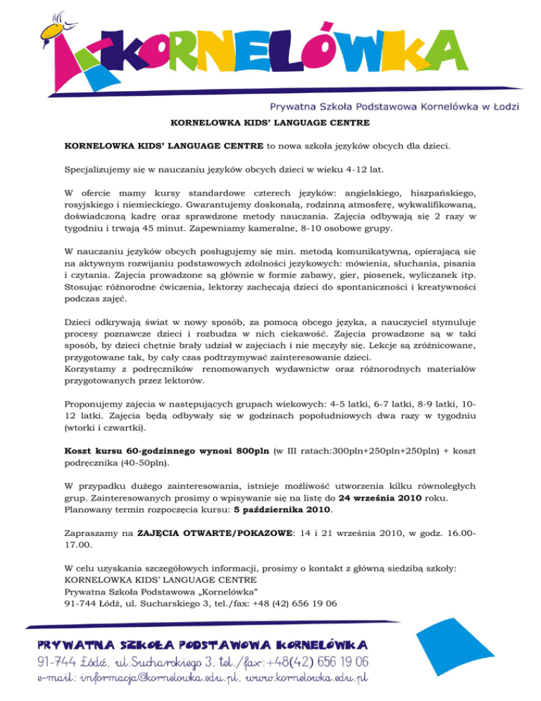 KORNELOWKA KIDS’ LANGUAGE CENTRE KORNELOWKA KIDS’ LANGUAGE CENTRE to nowa szkoła języków obcych dla dzieci. Specjalizujemy się w nauczaniu języków obcych dzieci w wieku 4-12 lat. W ofercie mamy kursy standardowe czterech języków: angielskiego, hiszpańskiego, rosyjskiego i niemieckiego. Gwarantujemy doskonałą, rodzinną atmosferę, wykwalifikowaną, doświadczoną kadrę oraz sprawdzone metody nauczania. Zajęcia odbywają się 2 razy w tygodniu i trwają 45 minut. Zapewniamy kameralne, 8-10 osobowe grupy. W nauczaniu języków obcych posługujemy się min. metodą komunikatywną, opierającą się na aktywnym rozwijaniu podstawowych zdolności językowych: mówienia, słuchania, pisania i czytania. Zajęcia prowadzone są głównie w formie zabawy, gier, piosenek, wyliczanek itp. Stosując różnorodne ćwiczenia, lektorzy zachęcają dzieci do spontaniczności i kreatywności podczas zajęć. Dzieci odkrywają świat w nowy sposób, za pomocą obcego języka, a nauczyciel stymuluje procesy poznawcze dzieci i rozbudza w nich ciekawość. Zajęcia prowadzone są w taki sposób, by dzieci chętnie brały udział w zajęciach i nie męczyły się. Lekcje są zróżnicowane, przygotowane tak, by cały czas podtrzymywać zainteresowanie dzieci. Korzystamy z podręczników renomowanych wydawnictw oraz różnorodnych materiałów przygotowanych przez lektorów. Proponujemy zajęcia w następujących grupach wiekowych: 4-5 latki, 6-7 latki, 8-9 latki, 1012 latki. Zajęcia będą odbywały się w godzinach popołudniowych dwa razy w tygodniu (wtorki i czwartki). Koszt kursu 60-godzinnego wynosi 800pln (w III ratach:300pln+250pln+250pln) + koszt podręcznika (40-50pln). W przypadku dużego zainteresowania, istnieje możliwość utworzenia kilku równoległych grup. Zainteresowanych prosimy o wpisywanie się na listę do 24 września 2010 roku. Planowany termin rozpoczęcia kursu: 5 października 2010. Zapraszamy na ZAJĘCIA OTWARTE/POKAZOWE: 14 i 21 września 2010, w godz. 16.0017.00. W celu uzyskania szczegółowych informacji, prosimy o kontakt z główną siedzibą szkoły: KORNELOWKA KIDS’ LANGUAGE CENTRE Prywatna Szkoła Podstawowa „Kornelówka” 91-744 Łódź, ul. Sucharskiego 3, tel./fax: +48 (42) 656 19 06