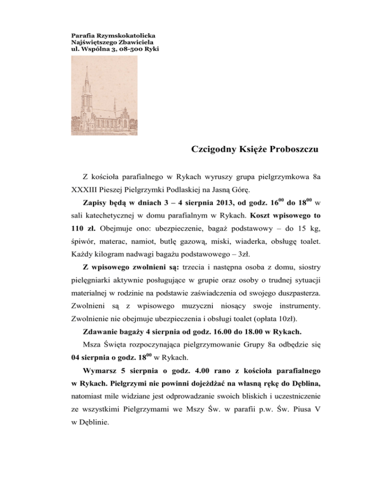 Parafia Rzymskokatolicka Najświętszego Zbawiciela ul. Wspólna 3, 08-500 Ryki Czcigodny Księże Proboszczu Z kościoła parafialnego w Rykach wyruszy grupa pielgrzymkowa 8a XXXIII Pieszej Pielgrzymki Podlaskiej na Jasną Górę. Zapisy będą w dniach 3 – 4 sierpnia 2013, od godz. 1600 do 1800 w sali katechetycznej w domu parafialnym w Rykach. Koszt wpisowego to 110 zł. Obejmuje ono: ubezpieczenie, bagaż podstawowy – do 15 kg, śpiwór, materac, namiot, butlę gazową, miski, wiaderka, obsługę toalet. Każdy kilogram nadwagi bagażu podstawowego – 3zł. Z wpisowego zwolnieni są: trzecia i następna osoba z domu, siostry pielęgniarki aktywnie posługujące w grupie oraz osoby o trudnej sytuacji materialnej w rodzinie na podstawie zaświadczenia od swojego duszpasterza. Zwolnieni są z wpisowego muzyczni niosący swoje instrumenty. Zwolnienie nie obejmuje ubezpieczenia i obsługi toalet (opłata 10zł). Zdawanie bagaży 4 sierpnia od godz. 16.00 do 18.00 w Rykach. Msza Święta rozpoczynająca pielgrzymowanie Grupy 8a odbędzie się 04 sierpnia o godz. 1800 w Rykach. Wymarsz 5 sierpnia o godz. 4.00 rano z kościoła parafialnego w Rykach. Pielgrzymi nie powinni dojeżdżać na własną rękę do Dęblina, natomiast mile widziane jest odprowadzanie swoich bliskich i uczestniczenie ze wszystkimi Pielgrzymami we Mszy Św. w parafii p.w. Św. Piusa V w Dęblinie. Pielgrzymka duchowa skierowana jest do osób, które z różnych względów nie mogą wziąć udziału w pielgrzymce w sposób fizyczny, ze względu na podeszły wiek, chorobę, skomplikowaną sytuację rodzinną, służbę wojskową, oddalenie od kraju itp. Mogą jednak pielgrzymować, łącząc się sercem i modlitwą z pątnikami wędrującymi na Jasną Górę, pomnażając w ten sposób dobro duchowe oraz uzyskując wiele łask. Codziennie odczytywane są intencje duchowych uczestników pielgrzymki podczas modlitwy różańcowej, dlatego proszę o zachęcenie wiernych do udziału w tej formie pielgrzymowania i wypisanie intencji na kartach. Po intencje przyjadę do parafii 4 sierpnia br. po wcześniejszym powiadomieniu, Informacje dotyczące pielgrzymki umieszczone są na www.parafia-ryki.pl w zakładce aktualności. Dołączam informacje do gabloty parafialnej. Bardzo proszę o podanie informacji wiernym. Z Chrystusowym pozdrowieniem ks. Tomasz Oponowicz przewodnik Grupy 8a nr tel. 507 552 984