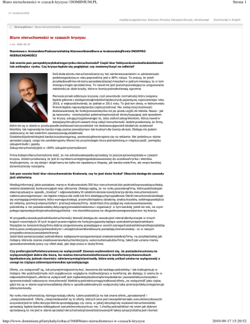 Biuro nieruchomości w czasach kryzysu | DOMINIUM.PL Strona 1 17 września2010 współpracująceserwisy: Katowice, Wrocław, Zakopane, Biura.pl, wKrakowie.pl Dominium.pl in English Strona główna > Biuro nieruchomościw czasachkryzysu Biuro nieruchomości w czasach kryzysu z dn. 2009 -09 -07 Rozmowa z ArmandemPodczerwińskim, KierownikiemBiura w krakowskiejfirmie INDEPRO NIERUCHOMOŚCI. Jak ocenia pan perspektywylokalnegorynku nieruchomości? Część biur faktyczniezawiesiładziałalność lub zniknęłaz rynku. Czy kryzys będzie się pogłębiać, czy moŜemy liczyć na odbicie? Dziś skala obrotu nieruchomościami, czy teŜ zainteresowanienimi w odniesieniudo podobnegookresu w roku poprzednim, jest o 80% niŜsza. To znaczy, Ŝe jeŜeli przykładowafirma rok temu sprzedała dziesięć mieszkań w jednym miesiącu, to w tym miesiącu mogła sprzedać dwa. To nawet nie jest poziompozwalającyna uregulowanie naleŜności za stale koszty, które w branŜy pośrednictwasą ogromne. Pierwszeoznaki odbicia po kryzysie, czyli powrotudo normalności, który związany będzie głównie z dostępnościąkredytówhipotecznych, pojawią się najwcześniejw roku 2010, a większośćtwierdzi, Ŝe jednak w 2011 roku. To jest ten okres, w którymwielu firmom będzie naprawdębardzo cięŜko przetrwać. Nie widzę innej moŜliwości dostosowaniasię do funkcjonowaniarynku niŜ po prostu wyjść do klienta. Nasza - jak ją nazywamy - rewolucja bez pobieraniaprowizji od stronykupującej, jest sposobem na kryzys, usługą przygotowanąpo to, Ŝeby ułatwić zakup klientom, którzy nawet w dzisiejszychtrudnych czasach chcą nabyć nieruchomość. Jestem przekonany, Ŝe firmy, które nie są w stanie w prostysposób analizowaćrzeczywistościi nie dostosowująswoich działań do oczekiwań klientów, tak naprawdęnie bardzo mają szanse powodzeniaw tak trudnym dla branŜy okresie. Dlatego nie jestem zaskoczony, Ŝe tak wiele firm zawiesza swoją działalność. Działalnośćpośrednikajest bardzo kosztownąpracą, poniewaŜ głównie opiera się na reklamie. Nie jesteśmy w stanie sprzedać czegoś, czego nie zareklamujemy. Klienci nie przychodządo biura pośrednictwa„w międzyczasie”, pomiędzy zakupem bułki i gazety. Zakup nieruchomościjest w 100% zakupem przemyślanym. Firma Indepro Nieruchomościnie dość, Ŝe nie odnotowałaspadku sprzedaŜy, to jeszcze sprawniej działa w czasach kryzysu. Jestem przekonany, Ŝe jest to wynikiem umiejętnegodostosowaniasię do oczekiwań rynku i klientów. Analizujemyto, co się dzieje i dzięki temu nie tylko nie wpadamyw kłopoty, jak bardzo wiele firm, ale wręcz bardziej dynamiczniesię rozwijamy. Jak pan ocenia ilość biur nieruchomościw Krakowie, czy to jest duŜa liczba? Obecnie dostęp do zawodu jest ułatwiany. Według informacji, jakie posiadam, mamy w Krakowieokoło 350 biur nieruchomościlub podmiotówprowadzącychtaką właśnie działalność, konkurencjajest więc olbrzymia. Dlatego sądzę, Ŝe na rynku pozostanąfirmy, które podchodzą do obecnej sytuacji w sposób ,,trzeźwy” i odpowiedzialny. W ostatnim okresie rozwój branŜy obrotu nieruchomościami nabiera pewnegotempa i nie będzie miejsca dla osób lub firm działającychprzypadkowo. Obrót nieruchomościamistaje się wymagającymbiznesem, który wymaga strategii, przemyśleniaplanu działania, analizy kosztów, solidnegopodejścia do reklamy, promocji własnychofert i promocji własnej firmy. JeŜeli ktoś chce podjąć się wykonywaniazawodu pośrednika, a nie posiada wiedzy dotyczącej prowadzeniabiznesu i organizacji- a tym bardziej, jeŜeli nie wie, na czym polega naprawdęprofesjonalnaobsługa klienta - ma niewielkieszanse na długookresowepowodzeniew tej branŜy. W przypadku zawodu pośrednikanieruchomości, łatwość dostępu do zawodu jest niemal identycznajak w innych krajach rozwiniętych. W tych krajach prawie nigdzie nie funkcjonująosoby będące samodzielnymipośrednikami. Wszędzie na świeciekrólują firmy dobrze zorganizowane, posiadającew swoich szeregachpośrednikówprofesjonalistów , którzy poza predyspozycjamiosobistymii umiejętnościamihandlowymi, posiadają równieŜwiedzę - co w naszym przypadku oznacza posiadanielicencji. JeŜeli ktoś zamierza zostać pośrednikiem, najlepszymrozwiązaniemjest znalezieniedobrej firmy, na przykład takiej jak Indepro, która da szanse zrealizowaniawłasnychambicji przy wykorzystaniuatutów firmy, takich jak uznana marka, sprawdzonemetody pracy czy efekt skali, jaki daje praca w duŜej firmie. Czy preferujeciePaństwoumowy na wyłączność? Zawsze wydawałomi się, Ŝe posiadanieumowy na wyłącznośćjest dobre dla biura, bo moŜna nieruchomośćoferowaćw komfortowychwarunkach. Spotkałem się jednak równieŜz odmiennymiopiniamiosób, które wolą unikać umów na wyłączność, z uwagi na ciąŜące zobowiązaniewobec sprzedającego. Oferty „na wyłączność” są, lub przynajmniejpowinny być, bezcenne dla kaŜdego pośrednika, i tak traktujemyje w Indepro. Nie podchodzimydo nich wyjątkowoze względuna moŜliwośćpracy w komforcie, ale dlatego, iŜ wiemy Ŝe w odpowiednichrękach „oferta na wyłączność” jest najbardziejskutecznąformą działania i pozwala faktycznieszybko i sprawnieznaleźć nabywcę na nieruchomość. Niektórzy pośrednicymogą traktowaćoferty „na wyłączność” jako cięŜar, gdyŜ nie są w stanie wypromowaćtakiej oferty w sposób adekwatnydo wyłączności, taka promocja faktyczniegeneruje olbrzymie koszty. Na rynku nieruchomościsą róŜnego rodzaju oferty. Łatwo podzielić je na tak zwane oferty „sprzedawane” i „niesprzedawalne”. Oferty „niesprzedawalne” są to oferty, których cena jest niewspółmiernado warunkówrynkowychi oczywiściejest to tylko decyzja klienta sprzedającego, czy cena, w jakiej decyduje się wystawić nieruchomośćdo sprzedaŜy, będzie bardzo odbiegała od warunkówrynkowychczy nie. I choćby pośrednikbył nie wiem jak dobrym