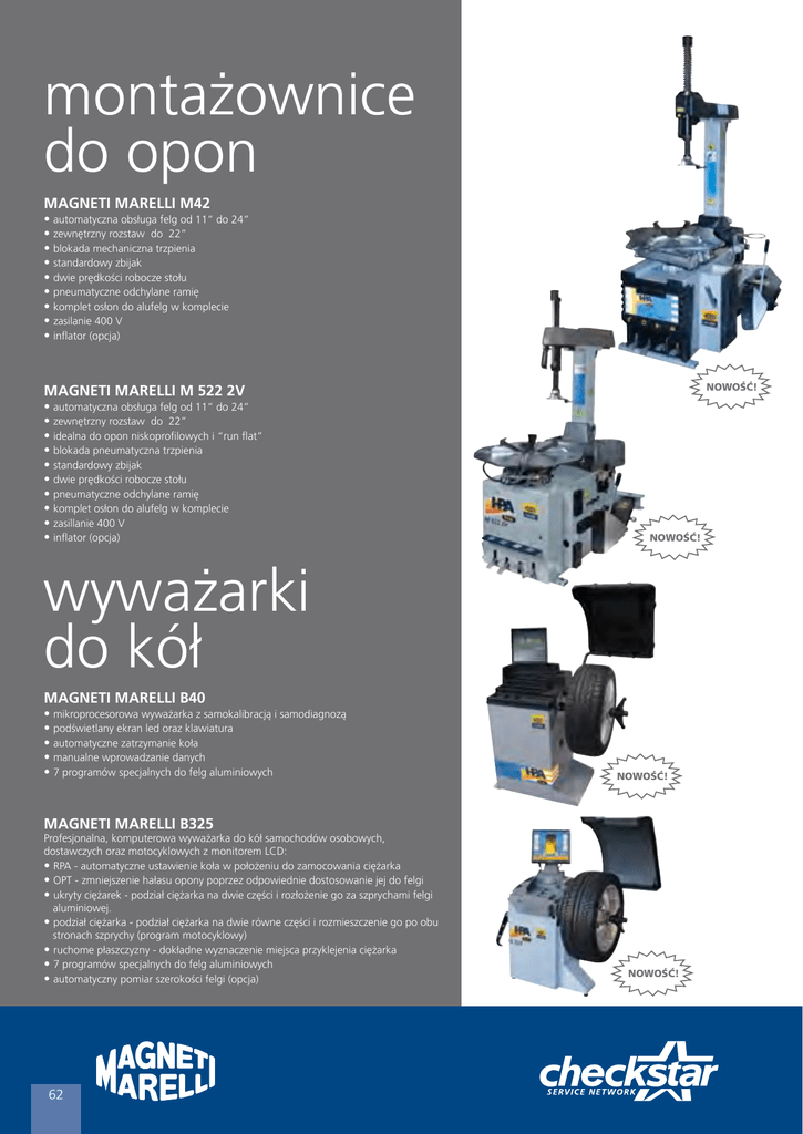 montażownice do opon MAGNETI MARELLI M42 • automatyczna obsługa felg od 11” do 24” • zewnętrzny rozstaw do 22” • blokada mechaniczna trzpienia • standardowy zbijak • dwie prędkości robocze stołu • pneumatyczne odchylane ramię • komplet osłon do alufelg w komplecie • zasilanie 400 V • inflator (opcja) NOWOŚĆ! MAGNETI MARELLI M 522 2V • automatyczna obsługa felg od 11” do 24” • zewnętrzny rozstaw do 22” • idealna do opon niskoprofilowych i “run flat” • blokada pneumatyczna trzpienia • standardowy zbijak • dwie prędkości robocze stołu • pneumatyczne odchylane ramię • komplet osłon do alufelg w komplecie • zasillanie 400 V • inflator (opcja) NOWOŚĆ! wyważarki do kół MAGNETI MARELLI B40 • mikroprocesorowa wyważarka z samokalibracją i samodiagnozą • podświetlany ekran led oraz klawiatura • automatyczne zatrzymanie koła • manualne wprowadzanie danych • 7 programów specjalnych do felg aluminiowych NOWOŚĆ! MAGNETI MARELLI B325 Profesjonalna, komputerowa wyważarka do kół samochodów osobowych, dostawczych oraz motocyklowych z monitorem LCD: • RPA - automatyczne ustawienie koła w położeniu do zamocowania ciężarka • OPT - zmniejszenie hałasu opony poprzez odpowiednie dostosowanie jej do felgi • ukryty ciężarek - podział ciężarka na dwie części i rozłożenie go za szprychami felgi aluminiowej. • podział ciężarka - podział ciężarka na dwie równe części i rozmieszczenie go po obu stronach szprychy (program motocyklowy) • ruchome płaszczyzny - dokładne wyznaczenie miejsca przyklejenia ciężarka • 7 programów specjalnych do felg aluminiowych • automatyczny pomiar szerokości felgi (opcja) 62 NOWOŚĆ!