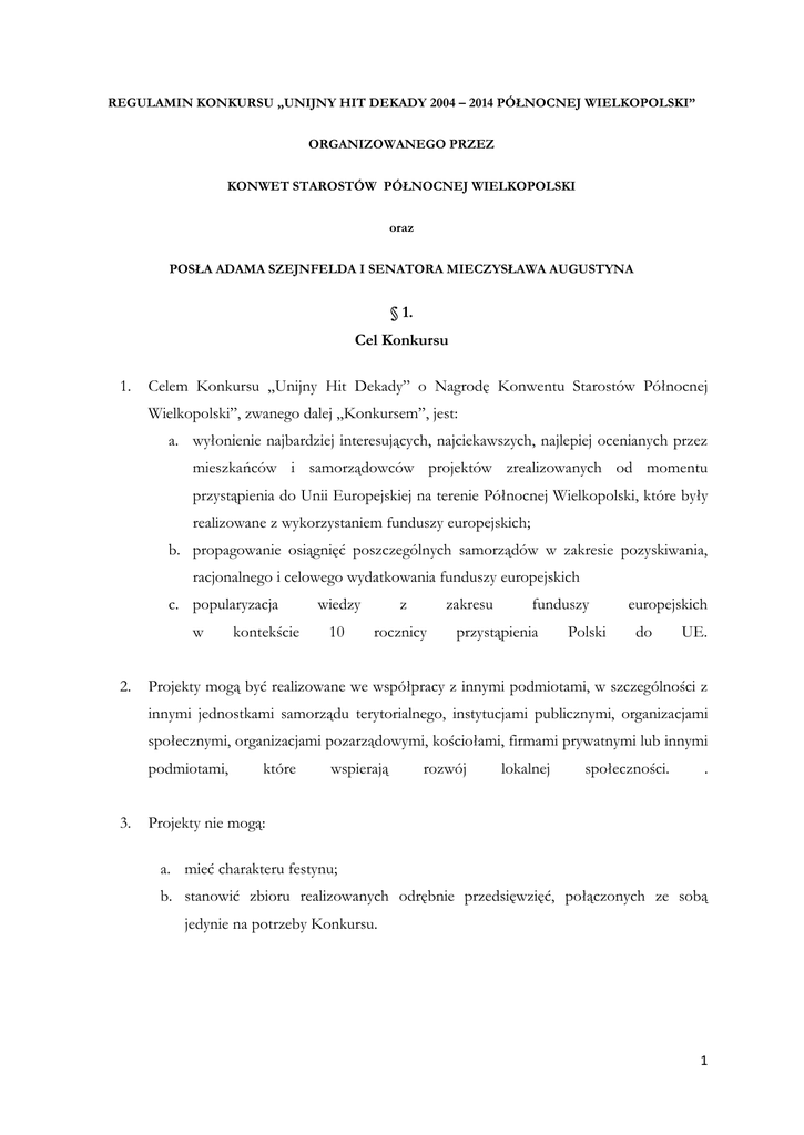 REGULAMIN KONKURSU „UNIJNY HIT DEKADY 2004 – 2014 PÓŁNOCNEJ WIELKOPOLSKI” ORGANIZOWANEGO PRZEZ KONWET STAROSTÓW PÓŁNOCNEJ WIELKOPOLSKI oraz POSŁA ADAMA SZEJNFELDA I SENATORA MIECZYSŁAWA AUGUSTYNA § 1. Cel Konkursu 1. Celem Konkursu „Unijny Hit Dekady” o Nagrodę Konwentu Starostów Północnej Wielkopolski”, zwanego dalej „Konkursem”, jest: a. wyłonienie najbardziej interesujących, najciekawszych, najlepiej ocenianych przez mieszkańców i samorządowców projektów zrealizowanych od momentu przystąpienia do Unii Europejskiej na terenie Północnej Wielkopolski, które były realizowane z wykorzystaniem funduszy europejskich; b. propagowanie osiągnięć poszczególnych samorządów w zakresie pozyskiwania, racjonalnego i celowego wydatkowania funduszy europejskich c. popularyzacja w 2. kontekście wiedzy z zakresu 10 rocznicy funduszy przystąpienia Polski europejskich do UE. Projekty mogą być realizowane we współpracy z innymi podmiotami, w szczególności z innymi jednostkami samorządu terytorialnego, instytucjami publicznymi, organizacjami społecznymi, organizacjami pozarządowymi, kościołami, firmami prywatnymi lub innymi podmiotami, 3. które wspierają rozwój lokalnej społeczności. . Projekty nie mogą: a. mieć charakteru festynu; b. stanowić zbioru realizowanych odrębnie przedsięwzięć, połączonych ze sobą jedynie na potrzeby Konkursu. 1 § 2. Uczestnicy Konkursu 1. W Konkursie mogą wziąć udział: a. jednostki samorządu terytorialnego Północnej Wielkopolski (z powiatów: czarnkowsko-trzcianeckiego, chodzieskiego, pilskiego, wągrowieckiego, złotowskiego). b. organizacje pozarządowe mające swoją siedzibę w subregionie Północnej Wielkopolski w powiatach wymienionych w ppkt a. § 3. Organizator Konkursu 1. Organizatorami Konkursu są: a. Konwent Starostów Północnej Wielkopolski b. Adam Szejnfeld – Poseł na Sejm Rzeczypospolitej Polskiej c. Mieczysław Augustyn – Senator Rzeczypospolitej Polskiej 2. Obsługę Konkursu zapewnia Biuro Senatora Mieczysława Augustyna, zwane dalej „Sekretariatem Konkursu”. Sekretariat Konkursu mieści się w Pile, przy ul. Śródmiejskiej 20/1, 64-920 Piła, nr tel. 503 138 691, adres e-mail: [email protected] a. Zastrzega się, że obsługę Konkursu na I Etapie – powiatowym – sprawuje Starosta właściwy do adresu podmiotu biorącego udział w Konkursie, zwanym dalej „Biuro Konkursu”: Starostwo Powiatowe w Czarnkowie (ul. Rybaki 3 64-700 Czarnków, 67 253 01 60 wew. 1155, 67 253 01 78, [email protected]) Starostwo Powiatowe w Chodzieży (ul. Wiosny Ludów 1, 64-800 Chodzież, tel. 67 28 27 261, fax. 67 28 12 711, [email protected]) Starostwo Powiatowe w Pile (al. Niepodległości 33/35, 64-920 Piła, tel. 67 210 93 01, fax. 67 210 93 01, [email protected]) Starostwo Powiatowe w Wągrowcu (ul. Kościuszki 15, 62-100 Wągrowiec, tel. 67 26 20 168, fax. 67 26 27 888, [email protected]) 2 Starostwo Powiatowe w Złotowie (Aleja Piasta 32, 77-400 Złotów, tel. 67 263 32 20, fax 67 263 28 02, [email protected]) § 4. Kapituła Konkursu 1. Kapituła Konkursu składa się z 7 Członków będących przedstawicielami, Organizatorów: Senatora, Posła, Konwentu Starostów Północnej Wielkopolski: po jednym z każdego powiatu. 2. Przewodniczący Kapituły Konkursu wyznaczany jest spośród Członków Kapituły Konkursu w głosowaniu jawnym zwykłą większością głosów. 3. Przewodniczący Kapituły Konkursu kieruje pracami Kapituły Konkursu dbając o realizację jego celów. 4. Zmiany w składzie Kapituły Konkursu oraz na stanowisku Przewodniczącego mogą być dokonywane w każdym czasie, w trybie określonym odpowiednio w ust. 1, 2 i 3. 5. Obsługę Prac Kapituły Konkursu zapewnia Sekretariat Konkursu. W uzasadnionych przypadkach, Przewodniczący Kapituły Konkursu może korzystać z pomocy innych komórek organizacyjnych Organizatora. § 5. Organizacja Konkursu 1. Konkurs ogłaszany jest z okazji 10 rocznicy wstąpienia Polski do Unii Europejskiej i trwa od 24 marca 2014 do 19 kwietnia 2014 r. 2. Konkurs składa się z dwóch etapów. a. Etap I: Do 24 marca 2014 r. Starostwa Powiatowe ogłaszają konkurs na swoich stronach internetowych i w sposób zwyczajowo przyjęty w Powiecie. Starosta wysyła zaproszenia do gmin stanowiących dany Powiat oraz organizacji pozarządowych funkcjonujących na terenie Powiatu. Od dnia 24 marca 2014 do 7 kwietnia 2014 Uczestnicy Konkursu na formularzu będącym Załącznikiem nr 1 do Regulaminu Konkursu wysyłają do Biura Konkursu, ze względu na miejsce prowadzenia działalności po jednym zgłoszeniu: Samorządy w kategorii: 3 Inwestycje samorządowe (gminne i powiatowe) Inwestycje w kapitał ludzki (tzw. projekty miękkie) Organizacje Pozarządowe w kategorii: Inwestycje w rozwój aktywności lokalnej, przedsiębiorczości i osób defaworyzowanych. Od 7 kwietnia 2014 r. na stronach internetowych Starostw Powiatowych zamieszczone będą zgłoszone do konkursu projekty, na które do północy 14 kwietnia mieszkańcy będą mogli oddawać swoje głosy. Każdy z głosujących może oddać tylko jeden głos na projekt w każdej kategorii. Projekt, który otrzyma największą liczbę głosów w danej kategorii zostaje zwycięzcą I Etapu i otrzymuje tytuł „ UNIJNY HIT DEKADY 2004-2014 W POWIECIE..........” oraz awansuje do II Etapu b. Etap II Zwycięskie Projekty z poszczególnych kategorii z Biur Konkursu zostaną dostarczone do Sekretariatu Konkursu najpóźniej do 18 kwietnia 2014 r. Do 25 kwietnia 2014 r. Kapituła Konkursu dokonuje wyłonienia najlepszych projektów. Zwycięskie projekty z obu etapów będą zaprezentowane w dniach 1 – 3 maja 2014 r. w Pile, Uroczyste wręczenie nagród podczas obchodów jubileuszu 10. lecia Polski w Unii Europejskiej. Dopuszcza się możliwość aby wystawa była prezentowana w miastach będących stolicami Powiatów, które Organizują Konkurs. § 6. Zgłoszenie udziału w Konkursie 1. Informacja o 