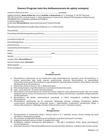 Umowa Program Auto bez dofinansowania do opłaty wstepnej zawarta w Katowicach dnia _____________________________________________ pomiędzy : Spółką pod firmą: Akuna Polska Sp. z o.o. z siedzibą w Katowicach, ul. 11 Listopada 11, 40-387 Katowice , NIP 954-23-03-351, zarejestrowaną w Sądzie Rejonowym w Katowicach, Wydział VIII Gospodarczo-Rejestrowym KRS0000075235 z kapitałem zakładowym 50.000 zł, w całości wpłaconym, zwana dalej Zleceniodawcą, reprezentowaną przez Tomasza Kwolka a Niezależnym dystrybutorem spółki Akuna Polska Sp. z o. o. w Katowicach, Panem/Panią _________________________________________________________________________________________________________________________ Prowadzącą działalność gospodarczą pod firmą: _________________________________________________________________________________ _________________________________________________________________________________________________________________________________________ na podsawie wpisu do _______________________________________________________________________________________________________________ prowadzonego przez ________________________________________________________________________________________________________________ pod numrerem _______________________________________________________________________________________________________________________ zamieszkałą/zamieszkałym w ______________________________________________________________________________________________________ przy ul. ________________________________________________________________________________________________________________________________ PESEL: _________________________________________________________, NIP: _________________________________________________________________ REGON: ________________________________________________________, zwanym dalej „Zleceniobiorcą“, łącznie zwanymi dalej „Stronami“. Marka pojazdu: _______________________________________________________________________________________________________________________ Firma Leasingowa: ___________________________________________________________________________________________________________________ §1 Przedmiot umowy 1. Zleceniobiorca zobowiązuje się do świadczenia usług marketingowych, zleconych przez Zleceniodawcę, w postaci promowania jego marki poprzez zamieszczenie oznaczeń Zleceniodawcy na samochodzie, wykorzystywanym przez Zleceniobiorcę w jego działalności dystrybucyjnej związanej z firmą Akuna, oznaczeń określonych przez Zleceniodawcę. 2. Oznaczenia, o których mowa w ust. 1, obejmują łacznie: a) folie samoprzylepne z logo Zleceniodawcy na przednich drzwiach bocznych, b) napis „www.akuna.pl“ na tylnim zderzaku pojazdu. 3. Zleceniobiorca jest zobowiązany do zachowania koloru nadwozia i folii reklamowych przez cały czas trwania niniejszej umowy. Strony nie zamieszczą na samochodzie reklamy lub informacji o produkcie innego podmiotu niż Zleceniodawca. 4. Zleceniobiorca nie będzie wykorzystywał samochodu w celach niezgodnych z polityką handlową Zleceniodawcy. 5. Zleceniobiorca zobowiązuje się do wykonania niniejszego zlecenia z należytą starannością, zgodnie z powszechnie obowiązującymi przepisami prawa i odpowiednimi standardami zawodowymi, dbając o interesy Zleceniodawcy i spełniając warunki, o których mowa w § 2 i 3 niniejszej umowy. §2 Wynagrodzenie 1. Wynagordzenie za świadczenie usług, o których mowa w § 1 niniejszej umowy, Strony ustalają wg zasad opisanych w niniejszym paragrafie. 2. Dla uzyskania wynagrodzenia konieczne jest spełnienie wszystkich poniższych warunków: a) podpisanie niniejszej umowy do dnia 31 grudnia 2012 roku; b) Kwalifikacja osobista (miesięczna) Zleceniobiorcy – 700 pkt.w produktach Firmy Akuna posiadających wartości punktowe; c) posiadanie minimum 3 Dywizji Kwalifikowanych (miesięcznie) Zleceniobiorcy w każdym roku trwania umowy. Strona 1 z 4 3. Wysokość wynagrodzenia Zleceniobiorcy zależna jest od sumy miesięcznego obrotu wszystkich nowych menedżerów nominowanych po 01 grudnia 2011 roku do trzeciej generacji kwalifikowanej Zleceniobiorcy zakupów dokonanych w Polsce i wynosi miesięcznie: 15750 pkt i więcej – 1000,00 zł, 12600-15749 pkt – 700,00 zł, 9450-12599 pkt – 450,00 zł, 6300-9449 pkt – 300,00 zł, 3150-6299 pkt – 150,00 zł. W żadnym wypadku miesięcznie wynagrodzenie nie może przekroczyć kwoty 1000,00 zł netto. 4. Wynagrodzenie płatne jest na podstawie rachunku lub faktrury VAT wystawionej przez Zleceniobiorcę. Wynagrodzenie płatne jest przelewem na rachunek bankowy wskazany przez Zleceniobiorcę w terminie do końca miesiąca kalendarzowego następującego po miesiącu , którego dotyczy wykonanie usługi. 5. W przypadku kradzieży, kasacji samochodu lub innych sytuacji, które powodują rozwiązanie umowy Leasingowej Zleceniobiorca zobowiązany jest do niezwłocznego poinformowania Zleceniodawcy o tym fakcie. Zleceniodawca ma prawo do zwrotu niesłusznie wypłaconego dofinansowania wraz z odsetkami ustawowymi. 6. W przypadku zdarzeń, o których mowa w § 2 ust. 5 dofinansowanie uznane jest za niesłuszne licząć od miesiąca zaistnienia zdarzenia. §3 Dodatkowe postanowienia umowne 1. Zleceniobiorcą może być podmiot posiadający w dniu podpisania niniejszej umowy status „Złoty Partner“. 2. Oznaczenia, o których mowa w §1, mogą być naniesione wyłącznie na fabrycznie nowym samochodzie Marek wskazanych przez Zleceniodawcę w kolorze srebrnym. Samochód ten stanowić będzie przedmiot umowy leasingowej lub kredytowej na okres 48 miesięcy. Umowa leasingowa lub kredytowa będzie zawarta z Getin Leasing z siedzibą w Katowicach, Masterlease z siedzibą w Katowicach lub Raiffeisen Leasing z siedzibą w Bielsku Białej w terminie od 01stycznia 2012 roku do 31 grudnia 2012roku. 3. Samochód, na którym znajdą się oznaczenia, o których mowa w § 1 ust. 2 niniejszej umowy, nabyty zostanie