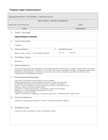 Program zajęć edukacyjnych Agrogospodarstwo „Pod Skałką” / Barbara Socha ______________________________________________________________________________________________________________________ Nazwa obiektu / nazwisko prowadzącego Szkolna 34, 42-310 Przybynów _________________________________________________________________________________ Adres 1. śląskie _________________________________ Województwo Temat / tytuł zajęć: Zapomniane zawody. 2. Czas trwania zajęć: 4 godziny 3. Grupa docelowa: 4. dzieci w wieku 6-10 lat, 11-13 lat; rodzice z dziećmi 5. Liczebność grupy: min. 10 max. 20 Prowadzący zajęcia: gospodarz 6. Zakres tematyczny: Uczniowie zapoznają się z zawodami, które dzisiaj już nie funkcjonują, ale także z takimi, które zaczynają przezywać swój renesans. Poznają m.in. zawody: ludwisarza, kołodzieja, kowala, introligatora, garncarza i bednarza. Dowiadują się o wpływie wykonywanych w danym regionie zawodów na nazewnictwo miejscowości oraz brzmienie nazwisk. 7. Harmonogram/przebieg zajęć: Powitanie uczestników przysmakami kuchni wiejskiej. Krótka pogadanka na temat starych zaw odów, ich roli dawnej i dziś. Zwiedzanie Mini-Skansenu. Prezentacja kuźni i narzędzi kowalskich. Praca w kuźni pod okiem kowala (praca przy miechu, hartowaniu stali. Zabawa z gliną „Nie święci garnki lepią”. Zwierzyniec i bliskie obcowanie z zwierzętami (karmienie zwierząt). Zabawa – rzut oka (plastikowa) podkową do celu. Przejażdżka wozem konnym. Ognisko z pieczeniem kiełbasek, wręczanie dyplomów „małego kowala i garncarza” . 8. Pomoce dydaktyczne: zabytkowa zagroda ze sprzętami, kuźnia i narzędzia kowalskie, zdjęcia 9. Dodatkowe uwagi: Zrobione z gliny przedmioty, dzieci zabierają ze sobą.