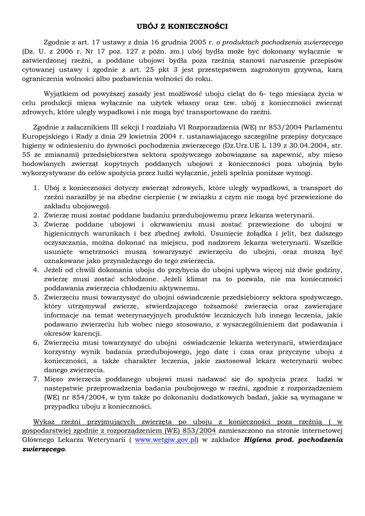 UBÓJ Z KONIECZNOŚCI Zgodnie z art. 17 ustawy z dnia 16 grudnia 2005 r. o produktach pochodzenia zwierzęcego (Dz. U. z 2006 r. Nr 17 poz. 127 z późn. zm.) ubój bydła może być dokonany wyłącznie w zatwierdzonej rzeźni, a poddane ubojowi bydła poza rzeźnią stanowi naruszenie przepisów cytowanej ustawy i zgodnie z art. 25 pkt 3 jest przestępstwem zagrożonym grzywną, karą ograniczenia wolności albo pozbawienia wolności do roku. Wyjątkiem od powyższej zasady jest możliwość uboju cieląt do 6- tego miesiąca życia w celu produkcji mięsa wyłącznie na użytek własny oraz tzw. ubój z konieczności zwierząt zdrowych, które uległy wypadkowi i nie mogą być transportowane do rzeźni. Zgodnie z załącznikiem III sekcji I rozdziału VI Rozporządzenia (WE) nr 853/2004 Parlamentu Europejskiego i Rady z dnia 29 kwietnia 2004 r. ustanawiającego szczególne przepisy dotyczące higieny w odniesieniu do żywności pochodzenia zwierzęcego (Dz.Urz.UE L 139 z 30.04.2004, str. 55 ze zmianami) przedsiębiorstwa sektora spożywczego zobowiązane są zapewnić, aby mięso hodowlanych zwierząt kopytnych poddanych ubojowi z konieczności poza ubojnią było wykorzystywane do celów spożycia przez ludzi wyłącznie, jeżeli spełnia poniższe wymogi. 1. Ubój z konieczności dotyczy zwierząt zdrowych, które uległy wypadkowi, a transport do rzeźni naraziłby je na zbędne cierpienie ( w związku z czym nie mogą być przewiezione do zakładu ubojowego). 2. Zwierzę musi zostać poddane badaniu przedubojowemu przez lekarza weterynarii. 3. Zwierzę poddane ubojowi i okrwawieniu musi zostać przewiezione do ubojni w higienicznych warunkach i bez zbędnej zwłoki. Usunięcie żołądka i jelit, bez dalszego oczyszczania, można dokonać na miejscu, pod nadzorem lekarza weterynarii. Wszelkie usunięte wnętrzności muszą towarzyszyć zwierzęciu do ubojni, oraz muszą być oznakowane jako przynależącego do tego zwierzęcia. 4. Jeżeli od chwili dokonania uboju do przybycia do ubojni upływa więcej niż dwie godziny, zwierzę musi zostać schłodzone. Jeżeli klimat na to pozwala, nie ma konieczności poddawania zwierzęcia chłodzeniu aktywnemu. 5. Zwierzęciu musi towarzyszyć do ubojni oświadczenie przedsiębiorcy sektora spożywczego, który utrzymywał zwierzę, stwierdzającego tożsamość zwierzęcia oraz zawierające informacje na temat weterynaryjnych produktów leczniczych lub innego leczenia, jakie podawano zwierzęciu lub wobec niego stosowano, z wyszczególnieniem dat podawania i okresów karencji. 6. Zwierzęciu musi towarzyszyć do ubojni oświadczenie lekarza weterynarii, stwierdzające korzystny wynik badania przedubojowego, jego datę i czas oraz przyczynę uboju z konieczności, a także charakter leczenia, jakie zastosował lekarz weterynarii wobec danego zwierzęcia. 7. Mięso zwierzęcia poddanego ubojowi musi nadawać się do spożycia przez ludzi w następstwie przeprowadzenia badania poubojowego w rzeźni, zgodnie z rozporządzeniem (WE) nr 854/2004, w tym także po dokonaniu dodatkowych badań, jakie są wymagane w przypadku uboju z konieczności. Wykaz rzeźni przyjmujących zwierzęta po uboju z konieczności poza rzeźnią ( w gospodarstwie) zgodnie z rozporządzeniem (WE) 853/2004 zamieszczono na stronie internetowej Głównego Lekarza Weterynarii ( www.wetgiw.gov.pl) w zakładce Higiena prod. pochodzenia zwierzęcego.