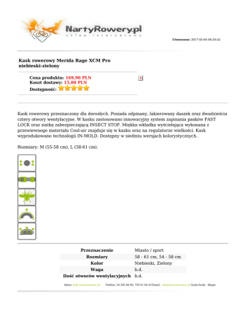 Utworzono: 2017-03-04 04:50:42 Kask rowerowy Merida Rage XCM Pro niebieski-zielony Cena produktu: 169,90 PLN Koszt dostawy: 15,00 PLN Dostępność: Kask rowerowy przeznaczony dla dorosłych. Posiada odpinany, lakierowany daszek oraz dwadzieścia cztery otwory wentylacyjne. W kasku zastosowano innowacyjny system zapinania pasków FAST LOCK oraz siatkę zabezpieczającą INSECT STOP. Miękka wkładka wyściełająca wykonana z przewiewnego materiału Cool-air znajduje się w kasku oraz na regulatorze wielkości. Kask wyprodukowano technologii IN-MOLD. Dostępny w siedmiu wersjach kolorystycznych. Rozmiary: M (55-58 cm), L (58-61 cm). Przeznaczenie Rozmiary Miasto / sport 58 - 61 cm, 54 - 58 cm Kolor Niebieski, Zielony Waga b.d. Ilość otworów wentylacyjnych b.d. Adres: http://nartyrowery.pl/ Telefon: 34 365 66 09, 793 61 04 29 Email: [email protected] Gadu-Gadu: Skype: