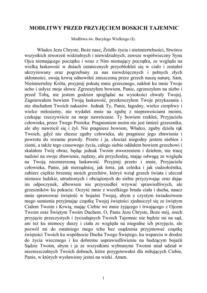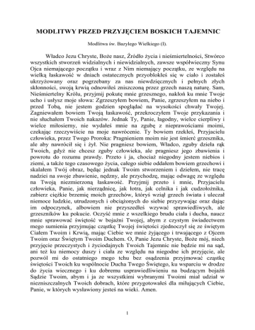 MODLITWY PRZED PRZYJĘCIEM BOSKICH TAJEMNIC Modlitwa św. Bazylego Wielkiego (I). Władco Jezu Chryste, Boże nasz, Źródło życia i nieśmiertelności, Stwórco wszystkich stworzeń widzialnych i niewidzialnych, zawsze współwieczny Synu Ojca niemającego początku i wraz z Nim niemający początku, ze względu na wielką łaskawość w dniach ostatecznych przyoblokłeś się w ciało i zostałeś ukrzyżowany oraz pogrzebany za nas niewdzięcznych i pełnych złych skłonności, swoją krwią odnowiłeś zniszczoną przez grzech naszą naturę. Sam, Nieśmiertelny Królu, przyjmij pokutę mnie grzesznego, nakłoń ku mnie Twoje ucho i usłysz moje słowa: Zgrzeszyłem bowiem, Panie, zgrzeszyłem na niebo i przed Tobą, nie jestem godzien spoglądać na wysokości chwały Twojej. Zagniewałem bowiem Twoją łaskawość, przekroczyłem Twoje przykazania i nie słuchałem Twoich nakazów. Jednak Ty, Panie, łagodny, wielce cierpliwy i wielce miłosierny, nie wydałeś mnie na zgubę z nieprawościami moimi, czekając rzeczywiście na moje nawrócenie. Ty bowiem rzekłeś, Przyjacielu człowieka, przez Twego Proroka: Pragnieniem moim nie jest śmierć grzesznika, ale aby nawrócił się i żył. Nie pragniesz bowiem, Władco, zguby dzieła rąk Twoich, gdyż nie chcesz zguby człowieka, ale pragniesz jego zbawienia i powrotu do rozumu prawdy. Przeto i ja, chociaż niegodny jestem niebios i ziemi, a także tego czasowego życia, całego siebie oddałem bowiem grzechowi i skalałem Twój obraz, będąc jednak Twoim stworzeniem i dziełem, nie tracę nadziei na swoje zbawienie, nędzny, ale przychodzę, mając odwagę ze względu na Twoją niezmierzoną łaskawość. Przyjmij przeto i mnie, Przyjacielu człowieka, Panie, jak nierządnicę, jak łotra, jak celnika i jak cudzołożnika, zabierz ciężkie brzemię moich grzechów, któryś wziął grzech świata i uleczał niemoce ludzkie, utrudzonych i obciążonych do siebie przyzywając oraz dając im odpoczynek, albowiem nie przyszedłeś wzywać sprawiedliwych, ale grzeszników ku pokucie. Oczyść mnie z wszelkiego brudu ciała i ducha, naucz mnie sprawować świętość w bojaźni Twojej, abym z czystym świadectwem mego sumienia przyjmując cząstkę Twojej świętości zjednoczył się ze świętym Ciałem Twoim i Krwią, mając Ciebie we mnie żyjącego i trwającego z Ojcem Twoim oraz Świętym Twoim Duchem. O, Panie Jezu Chryste, Boże mój, niech przyjęcie przeczystych i życiodajnych Twoich Tajemnic nie będzie mi na sąd, ani też ku niemocy duszy i ciała ze względu na niegodne ich przyjęcie, ale pozwól mi do ostatniego mego tchu bez osądzenia przyjmować cząstkę świętości Twoich ku wspólnocie Ducha Twego Świętego, ku wsparciu w drodze do życia wiecznego i ku dobremu usprawiedliwieniu na budzącym bojaźń Sądzie Twoim, abym i ja ze wszystkimi wybranymi Twoimi miał udział w niezniszczalnych Twoich dobrach, które przygotowałeś dla miłujących Ciebie, Panie, w których wysławiony jesteś na wieki. Amen. 1 Modlitwa św. Jana Chryzostoma (II). Panie Boże mój, wiem, że nie jestem godny, ani usposobiony, abyś wszedł pod dach świątyni mojej duszy, gdyż cały jestem pusty i upadły, nie ma we mnie godnego miejsca, gdzie można skłonić głowę, ale jak z wysokości ze względu na nas ukorzyłeś siebie samego, ukorz się i teraz nad moją pokorą. Jak zechciałeś w pustyni i w żłobie zwierzęcym spocząć, tak i teraz spocznij w żłobie mojej pozbawionej rozumu duszy i wejdź w moje zbrukane ciało. Jak zechciałeś wejść i wieczerzać z grzesznikami w domu Szymona Trędowatego, tak zechciej także wejść do domu pokornej mojej duszy, trędowatej i grzesznej; jak nie odrzuciłeś podobnej mi nierządnicy i grzesznicy, która przyszła i dotykała Ciebie, tak też zmiłuj się nade mną grzesznym, przychodzącym i dotykającym Ciebie; jak nie pogardziłeś jej zbrukanymi i nieczystymi ustami, które Ciebie całowały, tak też nie pogardź moimi ustami, bardziej zbrukanymi i bardziej nieczystymi od jej ust, ani też nie pogardź moimi nieczystymi i zbrukanymi wargami oraz zbrukanym i nieczystym mym językiem. Niech będzie mi węglem płonącym przeczyste Twoje Ciało i najczcigodniejsza Twoja Krew na oczyszczenie i oświecenie oraz zdrowie pokornej mojej duszy i ciała, ku złagodzeniu ciężaru wielu moich grzechów, na zachowanie od wszelkiego działania diabelskiego, na odpędzenie i powstrzymanie mych złych i niewłaściwych obyczajów, ku umartwieniu żądz, ku zachowaniu przykazań Twoich, ku pomnożeniu Bożej Twej łaski i zdobyciu Twego królestwa. Nie przychodzę do Ciebie, Chryste, z pogardą, ale z odwagą, ze względu na niewypowiedzianą Twoją łaskawość, obym nie oddalał się zbytnio od wspólnoty z Tobą, abym nie został pochwycony przez duchowego wilka. Przeto modlę się do Ciebie, albowiem jeden święty jesteś, Władco, uświęć moją duszę i ciało, rozum i serce, wnętrzności i łono, całego mnie odnów i zakorzeń bojaźń Twoją w moich członkach, i Twoje uświęcenie uczyń moją cząstką nie do odebrania. Bądź mi pomocnikiem i obrońcą, chroniąc moje życie w świecie, czyniąc mnie godnym stanięcia po Twojej prawicy ze świętymi Twymi, dla modlitw i błagań Przeczystej Twojej Matki, niematerialnych Twoich sług i najczystszych mocy, i wszystkich świętych, których od wieków sobie upodobałeś. Amen. Modlitwa św. Symeona Metafrastesa (III). Jedyny czysty i niezniszczalny Panie, z powodu niewypowiedzianego miłosierdzia i przyjaźni do człowieka przyjąłeś całą naszą naturę z czystego i dziewiczego łona, cudownie zrodziła Ciebie Matka przez ocienienie Ducha Bożego i z woli Ojca zawsze będącego, Chryste Jezusie, Mądrości Boża, pokoju i mocy, który z własnej woli przyjąłeś życiodajne i zbawcze cierpienia, krzyż, gwoździe, włócznię, śmierć, umartw moje zgubne dla duszy żądze cielesne. Przez pogrzeb Twój zniewoliłeś kró
