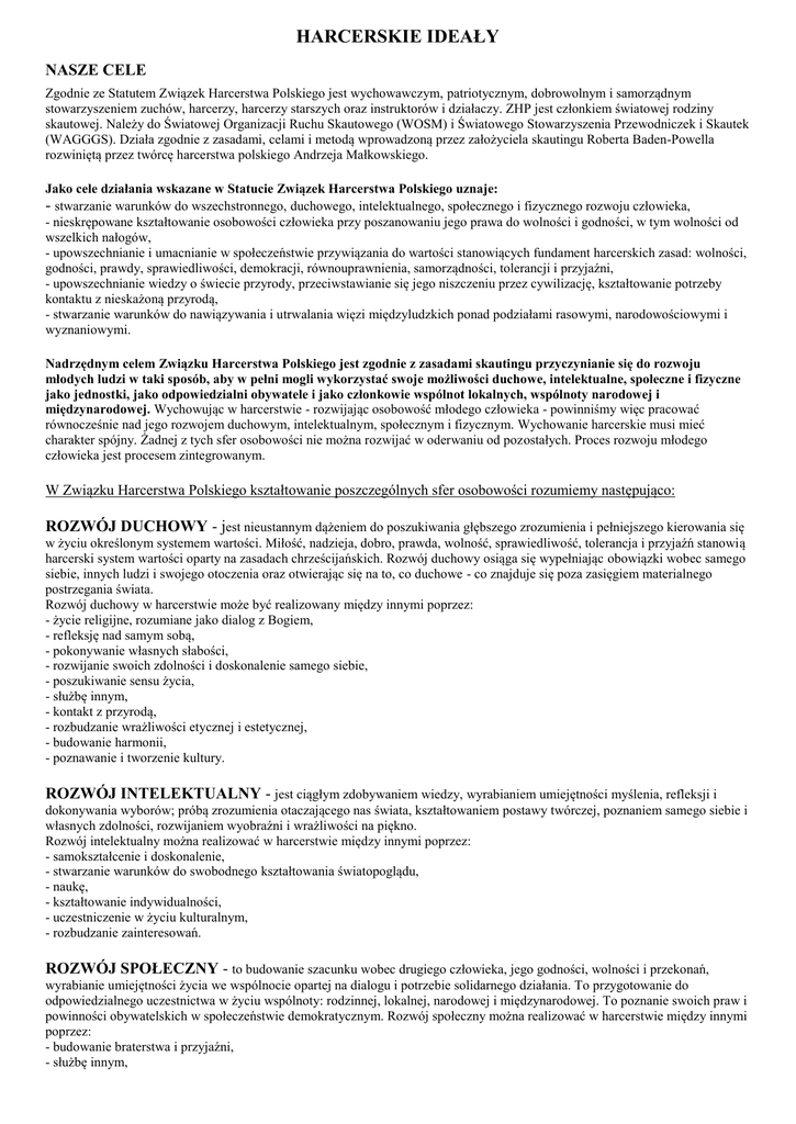 HARCERSKIE IDEAŁY NASZE CELE Zgodnie ze Statutem Związek Harcerstwa Polskiego jest wychowawczym, patriotycznym, dobrowolnym i samorządnym stowarzyszeniem zuchów, harcerzy, harcerzy starszych oraz instruktorów i działaczy. ZHP jest członkiem światowej rodziny skautowej. Należy do Światowej Organizacji Ruchu Skautowego (WOSM) i Światowego Stowarzyszenia Przewodniczek i Skautek (WAGGGS). Działa zgodnie z zasadami, celami i metodą wprowadzoną przez założyciela skautingu Roberta Baden-Powella rozwiniętą przez twórcę harcerstwa polskiego Andrzeja Małkowskiego. Jako cele działania wskazane w Statucie Związek Harcerstwa Polskiego uznaje: - stwarzanie warunków do wszechstronnego, duchowego, intelektualnego, społecznego i fizycznego rozwoju człowieka, - nieskrępowane kształtowanie osobowości człowieka przy poszanowaniu jego prawa do wolności i godności, w tym wolności od wszelkich nałogów, - upowszechnianie i umacnianie w społeczeństwie przywiązania do wartości stanowiących fundament harcerskich zasad: wolności, godności, prawdy, sprawiedliwości, demokracji, równouprawnienia, samorządności, tolerancji i przyjaźni, - upowszechnianie wiedzy o świecie przyrody, przeciwstawianie się jego niszczeniu przez cywilizację, kształtowanie potrzeby kontaktu z nieskażoną przyrodą, - stwarzanie warunków do nawiązywania i utrwalania więzi międzyludzkich ponad podziałami rasowymi, narodowościowymi i wyznaniowymi. Nadrzędnym celem Związku Harcerstwa Polskiego jest zgodnie z zasadami skautingu przyczynianie się do rozwoju młodych ludzi w taki sposób, aby w pełni mogli wykorzystać swoje możliwości duchowe, intelektualne, społeczne i fizyczne jako jednostki, jako odpowiedzialni obywatele i jako członkowie wspólnot lokalnych, wspólnoty narodowej i międzynarodowej. Wychowując w harcerstwie - rozwijając osobowość młodego człowieka - powinniśmy więc pracować równocześnie nad jego rozwojem duchowym, intelektualnym, społecznym i fizycznym. Wychowanie harcerskie musi mieć charakter spójny. Żadnej z tych sfer osobowości nie można rozwijać w oderwaniu od pozostałych. Proces rozwoju młodego człowieka jest procesem zintegrowanym. W Związku Harcerstwa Polskiego kształtowanie poszczególnych sfer osobowości rozumiemy następująco: ROZWÓJ DUCHOWY - jest nieustannym dążeniem do poszukiwania głębszego zrozumienia i pełniejszego kierowania się w życiu określonym systemem wartości. Miłość, nadzieja, dobro, prawda, wolność, sprawiedliwość, tolerancja i przyjaźń stanowią harcerski system wartości oparty na zasadach chrześcijańskich. Rozwój duchowy osiąga się wypełniając obowiązki wobec samego siebie, innych ludzi i swojego otoczenia oraz otwierając się na to, co duchowe - co znajduje się poza zasięgiem materialnego postrzegania świata. Rozwój duchowy w harcerstwie może być realizowany między innymi poprzez: - życie religijne, rozumiane jako dialog z Bogiem, - refleksję nad samym sobą, - pokonywanie własnych słabości, - rozwijanie swoich zdolności i doskonalenie samego siebie, - poszukiwanie sensu życia, - służbę innym, - kontakt z przyrodą, - rozbudzanie wrażliwości etycznej i estetycznej, - budowanie harmonii, - poznawanie i tworzenie kultury. ROZWÓJ INTELEKTUALNY - jest ciągłym zdobywaniem wiedzy, wyrabianiem umiejętności myślenia, refleksji i dokonywania wyborów; próbą zrozumienia otaczającego nas świata, kształtowaniem postawy twórczej, poznaniem samego siebie i własnych zdolności, rozwijaniem wyobraźni i wrażliwości na piękno. Rozwój intelektualny można realizować w harcerstwie między innymi poprzez: - samokształcenie i doskonalenie, - stwarzanie warunków do swobodnego kształtowania światopoglądu, - naukę, - kształtowanie indywidualności, - uczestniczenie w życiu kulturalnym, - rozbudzanie zainteresowań. ROZWÓJ SPOŁECZNY - to budowanie szacunku wobec drugiego człowieka, jego godności, wolności i przekonań, wyrabianie umiejętności życia we wspólnocie opartej na dialogu i potrzebie solidarnego działania. To przygotowanie do odpowiedzialnego uczestnictwa w życiu wspólnoty: rodzinnej, lokalnej, narodowej i międzynarodowej. To poznanie swoich praw i powinności obywatelskich w społeczeństwie demokratycznym. Rozwój społeczny można realizować w harcerstwie między innymi poprzez: - budowanie braterstwa i przyjaźni, - służbę innym, - odpowiadanie programem działania na najważniejsze problemy wspólnoty lokalnej, kraju, społeczności międzynarodowej, - poznanie i stosowanie zasad demokracji, - kształtowanie postaw tolerancji i poszanowania odmienności, - poznawanie mechanizmów i struktur życia społecznego, - wyrabianie postawy obywatelskiej, - poznawanie dziedzictwa tradycji, kultury i cywilizacji Polski, Europy, świata. ROZWÓJ FIZYCZNY - to stała troska o zdrowie i kondycję fizyczną, nauka zdrowego stylu życia, nieuleganie nałogom, wychowanie w poszanowaniu własnego zdrowia, przezwyciężanie własnych słabości i lęków - w dążeniu do utrzymania równowagi ducha i ciała. Rozwój fizyczny można realizować w harcerstwie między innymi poprzez: - dbałość o sprawność fizyczną, - uprawianie sportu, - życie obozowe, - uprawianie wędrówek i turystyki, - poznanie zasad zdrowego trybu życia, - walkę z nałogami, - popularyzowanie i przestrzeganie zasad higieny. CHARAKTER WYCHOWANIA W ZHP Zgodnie ze Statutem wychowanie w ZHP: * opiera się na normach moralnych wywodzących się z uniwersalnych, kulturowych i etycznych wartości chrześcijańskich wyrażonych w Prawie i Przyrzeczeniu Harcerskim, * kształtuje postawy szacunku wobec każdego człowieka, co wynika z uznania przyrodzonej godności i wolności każdej istoty ludzkiej. ZHP jest stowarzyszeniem otwartym dla wszystkich bez względu na pochodzenie, rasę czy wyznanie. System wartości duchowych uznaje za sprawę osobistą, gdyż każdy członek ZHP samo