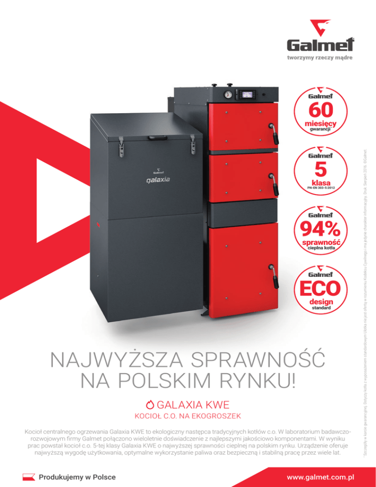 60 miesięcy 5 klasa PN-EN 303-5:2012 94% sprawność cieplna kotła ECO design standard NAJWYŻSZA SPRAWNOŚĆ NA POLSKIM RYNKU! GALAXIA KWE KOCIOŁ C.O. NA EKOGROSZEK * Kocioł centralnego ogrzewania Galaxia KWE to ekologiczny następca tradycyjnych kotłów c.o. W laboratorium badawczorozwojowym firmy Galmet połączono wieloletnie doświadczenie z najlepszymi jakościowo komponentami. W wyniku prac powstał kocioł c.o. 5-tej klasy Galaxia KWE o najwyższej sprawności cieplnej na polskim rynku. Urządzenie oferuje najwyższą wygodę użytkowania, optymalne wykorzystanie paliwa oraz bezpieczną i stabilną pracę przez wiele lat. Szczegóły w karcie gwarancyjnej. Dotyczy kotła z wyposażeniem standardowym Ulotka nie jest ofertą w rozumieniu Kodeksu Cywilnego i ma jedynie charakter informacyjny. Druk: Sierpień 2016. ©Galmet. gwarancji * Produkujemy w Polsce www.galmet.com.pl 5 GALAXIA KWE klasa PN-EN 303-5:2012 94% ECO sprawność cieplna kotła design standard 60 miesięcy gwarancji * XX Najwyższa, 5-ta klasa (wg normy PN-EN 303-5:2012). XX Odznaczony certyfikatem "Polskie Ciepło", który nadawany jest najbardziej ekologicznym kotłom c.o. XX Najwyższa sprawność cieplna na polskim rynku - 94,29%. XX Kocioł wyposażony w podajnik prosty z obrotową retortą, dzięki której paliwo spalane jest z jeszcze większą efektywnością. XX Korpus z 6 mm stali kotłowej - wysoka wytrzymałość i żywotność. XX Duży zasobnik paliwa - nieprzerwana praca kotła przez kilka dni. XX Nowoczesny regulator eLider: - płynna modulacja mocy, - sterowanie pompą podłogową, - bezpośrednie sterowanie siłownikiem zaworu mieszającego, - nowy algorytm sterowania mocą kotła PID, - dostęp zdalny przez www, - jeszcze bardziej intuicyjne menu. XX Czujnik pogodowy i otwarcia klapy zasobnika paliwa w standardzie. XX Zabezpieczenie STB, zapobiegające przegrzaniu się kotła. XX Możliwość wyposażenia regulatora w moduł bezprzewodowy, dzięki któremu regulator spełnia funkcję panelu pokojowego (opcja, dopłata 269,00 zł netto). XX Regulator z dotykowym, kolorowym wyświetlaczem LCD (opcja, dopłata 221,00 zł netto). Dane techniczne specyfikacja numer katalogowy moc nominalna zakres mocy klasa kotła wg normy PN-EN 303-5:2012 powierzchnia grzewcza kotła paliwo klasa paliwa pojemność zasobnika paliwa stałopalność dla mocy nominalnej sprawność cieplna wymagany ciąg komina minimalna wysokość komina minimalny przekrój komina temperatura spalin dla mocy nominalnej temperatura spalin dla mocy minimalnej opory przepływu zakres temperatury pracy maksymalna temperatura na zasilaniu minimalna temperatura powrotu dopuszczalne ciśnienie pracy pojemność wodna kotła masa kotła z palnikiem, podajnikiem i zasobnikiem średnica zewnętrzna czopucha średnica króćców zasilania/powrotu średnica króćca spustowego wysokość kotła szerokość kotła głębokość kotła odległość czopucha od posadzki maksymalny pobór mocy pobór mocy w stanie gotowości cena katalogowa netto cena katalogowa brutto j. m. kW kW m2 l h % mbar m mm °C °C mbar °C °C °C bar l kg mm ” ” mm mm mm mm W W PLN PLN Galaxia KWE 07-222430 (podajnik z prawej strony kotła) / 07-222431 (podajnik z lewej strony kotła) 22,0 6,6 ÷22,0 5 3,24 ekogroszek o granulacji 8÷20 A1 EN 14961-2 240 60 94,29 0,20 6 Ø 160 71 61 17 55÷85 85 55 2,2 90 533 Ø 160 6/4 ½ 1660 1165 1320 1397 354 4 9 799,00 12 052,77 Dystrybutor „Galmet Sp. z o.o.” Sp. K. 48-100 Głubczyce, ul. Raciborska 36 tel.: +48 77 403 45 00; fax: +48 77 403 45 99 Produkujemy w Polsce * sprzedaż: +48 77 403 45 21÷24 [email protected] dział kotłów c.o.: +48 77 403 45 65 [email protected] Szczegóły w karcie gwarancyjnej. Dotyczy kotła z wyposażeniem standardowym Ulotka nie jest ofertą w rozumieniu Kodeksu Cywilnego i ma jedynie charakter informacyjny. Druk: Sierpień 2016. ©Galmet. Kocioł c.o. na ekogroszek www.galmet.com.pl