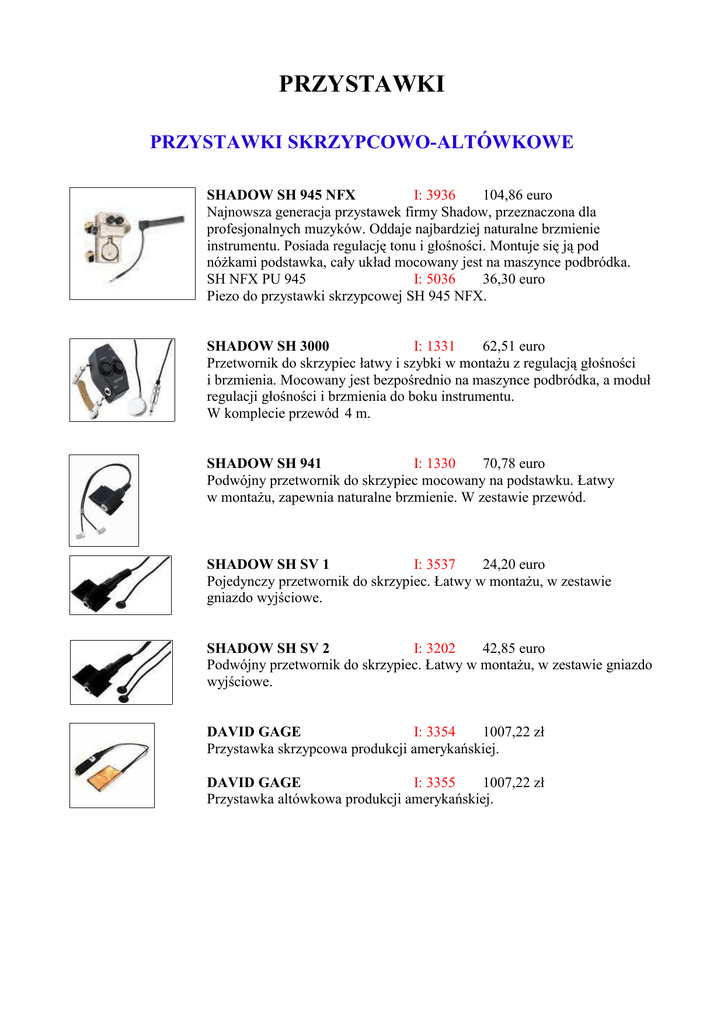 PRZYSTAWKI PRZYSTAWKI SKRZYPCOWO-ALTÓWKOWE SHADOW SH 945 NFX I: 3936 104,86 euro Najnowsza generacja przystawek firmy Shadow, przeznaczona dla profesjonalnych muzyków. Oddaje najbardziej naturalne brzmienie instrumentu. Posiada regulację tonu i głośności. Montuje się ją pod nóżkami podstawka, cały układ mocowany jest na maszynce podbródka. SH NFX PU 945 I: 5036 36,30 euro Piezo do przystawki skrzypcowej SH 945 NFX. I: 1331 62,51 euro SHADOW SH 3000 Przetwornik do skrzypiec łatwy i szybki w montażu z regulacją głośności i brzmienia. Mocowany jest bezpośrednio na maszynce podbródka, a moduł regulacji głośności i brzmienia do boku instrumentu. W komplecie przewód 4 m. SHADOW SH 941 I: 1330 70,78 euro Podwójny przetwornik do skrzypiec mocowany na podstawku. Łatwy w montażu, zapewnia naturalne brzmienie. W zestawie przewód. SHADOW SH SV 1 I: 3537 24,20 euro Pojedynczy przetwornik do skrzypiec. Łatwy w montażu, w zestawie gniazdo wyjściowe. SHADOW SH SV 2 I: 3202 42,85 euro Podwójny przetwornik do skrzypiec. Łatwy w montażu, w zestawie gniazdo wyjściowe. I: 3354 1007,22 zł DAVID GAGE Przystawka skrzypcowa produkcji amerykańskiej. DAVID GAGE I: 3355 1007,22 zł Przystawka altówkowa produkcji amerykańskiej. PRZYSTAWKI WIOLONCZELOWE SHADOW SH 955 NFX I: 3937 124,52 euro Nowej generacji profesjonalna przystawka firmy Shadow, oparta na technologii NFX. Montuje się ją pod dwoma nóżkami podstawka, cały przetwornik umieszcza się między strunociągiem a podstawkiem, swobodnie zaczepiając go na strunach G i D. Przystawka posiada regulację tonu i głośności, oddaje naturalne brzmienie instrumentu. SHADOW SH SC 1 I: 2111 42,85 euro Przystawka dwu punktowa do montowania na podstawku. DAVID GAGE I: 3356 1007,22 zł Przystawka wiolonczelowa produkcji amerykańskiej. PRZYSTAWKI KONTRABASOWE SHADOW SH 965 NFX I: 3938 144,20 euro Nowej generacji profesjonalna przystawka firmy Shadow, oparta na technologii NFX. Montuje się ją pod dwoma nóżkami podstawka, cały przetwornik umieszcza się między strunociągiem a podstawkiem, swobodnie zaczepiając go na środkowych strunach. Przystawka posiada regulację tonu i głośności, oddaje naturalne brzmienie instrumentu. I: 5034 36,30 euro SH NFX PU 965 Piezo do przystawki kontrabasowej SH 965 NFX. SHADOW SH 950 I: 1334 112,72 euro Dwu punktowa przystawka przeznaczona do gry arco i pizzicato. Montuje się ją na podstawku, wiernie oddaje brzmienie instrumentu. SHADOW SH 951 I: 4223 66,85 euro Jednopunktowa przystawka przeznaczona do gry arco i pizzicato. Montuje się ją na podstawku, wiernie oddaje brzmienie instrumentu. SHADOW SH SB 1 I: 2202 24,20 euro Jednopunktowa przystawka, łatwa w montażu. SHADOW SH SB 2 I: 2110 42,85 euro Przystawka dwu punktowa, łatwa w montażu. DAVID GAGE I: 3357 1007,22 zł Przystawka kontrabasowa produkcji amerykańskiej. SCHALLER I: 1335 133,24 euro Chromowana przystawka ma magnesy chwytające, montowana na podstrunnicy. Posiada regulację głośności. PRZYSTAWKI WIELOINSTRUMENTALNE SHADOW SH 2000 I: 2071 52,43 euro Popularna przystawka wieloinstrumentalna ze ze zintegrowanym regulatorem tonu i głośności. W zestawie kabel. Przeznaczona jest do wszystkich instrumentów posiadających płytę rezonansową, a także do harfy. SHADOW SH 2001 I: 2107 41,34 euro Przystawka wieloinstrumentalna bez regulatora tonu i głośności. W zestawie kabel. Przeznaczona jest do wszystkich instrumentów posiadających płytę rezonansową, a także do harfy. SHADOW SH 711 I: 2108 26,21 euro Przystawka jednopunktowa z wyjściem 1/4''. I: 2201 SHADOW SH 712 Przystawka dwu punktowa z wyjściem 1/4''. 37,30 euro SHADOW SH 713 Przystawka trzypunktowa 45,37 euro I: 2203 SHADOW SH 714 I: 2204 56,46 euro Przystawka czteropunktowa z wyjściem 1/4''. PRZYSTAWKI GITAROWE GITARA KLASYCZNA SHADOW SH 060 I: 2200 39,32 euro Przystawka typu piezo do łatwego montażu pod prożkiem gitary bez ingerencji lutniczej. Grubość 1,8 mm, pasuje do standardowych mostków ze szczeliną szerokości 2,3 mm. W zestawie przewód. I: 2375 51,12 euro SHADOW SH 076 Przystawka typu piezo z zestawie z prożkiem. I: 3960 45,87 euro SHADOW SH 090 Przystawka typu piezo w zestawie z prożkiem. I: 324 85,20 euro SHADOW SH 1900 Profesjonalna przystawka z progiem do zamontowania, wyposażona w regulator głośności i kabel z uchwytem. GITARA AKUSTYCZNA SHADOW SH 330 I: 2197 42,85 euro Magnetyczna przystawka z pojedynczą spiralą w drewnianej oprawie z zainstalowanym na stałe kablem 4 m. Łatwa w montażu w otworze rezonansowym gitary. SHADOW SH 141 I: 3941 85,20 euro Aktywna przystawka z elektroniczną końcówką zawierającą preamp. SHADOW SH 145 I: 3943 111,41 euro Nowej generacji aktywna przystawka magnetyczna z przedwzmacniaczem i wbudowaną baterią. Łatwa w montażu w otworze rezonansowym. Posiada regulację głośności, gniazdo na duży i mały jack, kabel 4 m. Przystawka bezszumowa, przeznaczona do gitar akustycznych i klasycznych ze strunami metalowymi. Dostępna w kolorze czarnym i srebrnym. SHADOW SH 066 I: 2119 51,12 euro Profesjonalna przystawka typu piezo z prożkiem; doskonała dynamika, pasmo przenoszenia 20 Hz – 30.000 Hz. SHADOW SH 095 I: 2205 29,63 euro Przystawka typu piezo montowana pod prożkiem. GITARA BASOWA AKUSTYCZNA SHADOW SH 064 I: 3651 47,84 euro Profesjonalna przystawka typu piezo z prożkiem przeznaczona do gitar basowych akustycznych 4-strunowych. SHADOW SH 065 I: 3245 55,70 euro Profesjonalna przystawka typu piezo z prożkiem przeznaczona do gitar basowych akustycznych 5-strunowych. GITARA KLASYCZNA I AKUSTYCZNA SHADOW SH NFX-AC I: 3939 104,86 euro Nowej generacji przystawka foliowa ze zintegrowanym przedwzmacniaczem. Oparta jest na najnowszej technologii NFX. Układ aktywny typu piezo przeznaczony jest do gitar klasycznych i akustycznych. Składa się z elementu piezoelektrycznego nowej generacji montowanego pod prożkiem, przedwzmacniacza zintegrowanego z wyjściem na kabel typu jack. Przysta