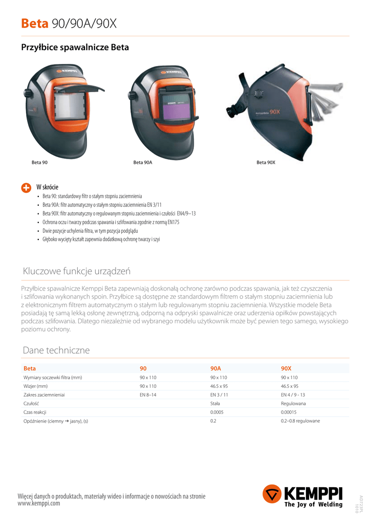Beta 90/90A/90X Przyłbice spawalnicze Beta Beta 90 Beta 90A Beta 90X W skrócie • • • • • • B eta 90: standardowy filtr o stałym stopniu zaciemnienia Beta 90A: filtr automatyczny o stałym stopniu zaciemnienia EN 3/11 Beta 90X: filtr automatyczny o regulowanym stopniu zaciemnienia i czułości EN4/9–13 Ochrona oczu i twarzy podczas spawania i szlifowania zgodnie z normą EN175 Dwie pozycje uchylenia filtra, w tym pozycja podglądu Głęboko wycięty kształt zapewnia dodatkową ochronę twarzy i szyi Kluczowe funkcje urządzeń Przyłbice spawalnicze Kemppi Beta zapewniają doskonałą ochronę zarówno podczas spawania, jak też czyszczenia i szlifowania wykonanych spoin. Przyłbice są dostępne ze standardowym filtrem o stałym stopniu zaciemnienia lub z elektronicznym filtrem automatycznym o stałym lub regulowanym stopniu zaciemnienia. Wszystkie modele Beta posiadają tę samą lekką osłonę zewnętrzną, odporną na odpryski spawalnicze oraz uderzenia opiłków powstających podczas szlifowania. Dlatego niezależnie od wybranego modelu użytkownik może być pewien tego samego, wysokiego poziomu ochrony. Dane techniczne Beta 90 90A 90X Wymiary soczewki filtra (mm) 90 x 110 90 x 110 90 x 110 Wizjer (mm) 90 x 110 46.5 x 95 46.5 x 95 Zakres zaciemnieniai EN 8–14 EN 3 / 11 EN 4 / 9 - 13 Czułość Stała Regulowana Czas reakcji 0.0005 0.00015 Opóźnienie (ciemny g jasny), (s) 0.2 0.2–0.8 regulowane AD723PL 1010 Więcej danych o produktach, materiały wideo i informacje o nowościach na stronie www.kemppi.com Beta 90/90A/90X Dane do zamówienia Przyłbica spawalnicza Beta 90 9873045 Beta 90 A 9873046 Beta 90 X 9873047 B A. Filtr przyłbicy 90 x 110 mm 8 9873241 90 x 110 mm 9 9873242 90 x 110 mm 10 9873243 90 x 110 mm 11 9873244 90 x 110 mm 12 9873245 90 x 110 mm 13 9872146 90 x 110 mm 14 9873247 A C D A - Filtr przyłbicy, Samościemniający filtr spawalniczy B - Szkiełko przeciwodpryskowe C - Szkiełko przeciwodpryskowe D - Filtr spawalniczy B, C. Szkiełko przeciwodpryskowe Beta 90X 51 x 107 x 1.0 9873251 Beta 90, 90A, 90X 90 x 110 x 1.0 9873253 90 x 110 x 1.5 9873254 90 x 110 x 1.5 9873255 Beta (1,0) 51 x 108 mm 9873260 Beta (1.5) 51 x 108 mm 9873261 Beta (2.0) 51 x 108 mm 9873262 Beta (2.5) 51 x 108 mm 9873263 Beta 90 A, DIN 3/11 90 x 110 9873051 Beta 90 X, DIN 4/9-13 90 x 110 9873055 D. Filtr spawalniczy Szybka zabezpieczająca Samościemniający filtr spawalniczy Beta, polycarb. DIN 3 Powiększająca soczewka filtra A. Samościemniający filtr spawalniczy Sprężyna mocująca filtr Beta 90, 90 A, 90 X 3149850 Nagłowie Beta 4306370 Opaska chłonąca pot 9873018 Zakres odcieni filtrów do spawania łukowego Natężenie prądu (A) Metody spawania 15 30 20 Spawanie MMA 60 100 40 9 80 MAG (spawanie CO2) 10 175 250 225 10 11 10 11 12 12 13 11 10 11 Żłobienie elektropowietrzne Cięcie plazmowe 200 11 MIG, aluminium 9 125 10 MIG, stal MIG, aluminium 150 12 10 11 275 350 12 500 450 12 13 14 12 13 14 13 14 15 14 13 11 400 14 12 13 15 14 15 13 AD723PL 1010 Więcej danych o produktach, materiały wideo i informacje o nowościach na stronie www.kemppi.com 300
