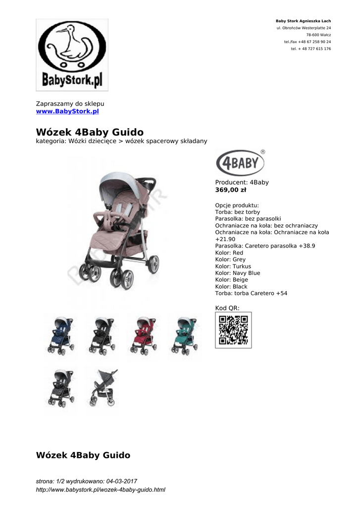 Baby Stork Agnieszka Lach ul. Obrońców Westerplatte 24 78-600 Wałcz tel./fax +48 67 258 90 24 tel. + 48 727 615 176 Zapraszamy do sklepu www.BabyStork.pl Wózek 4Baby Guido kategoria: Wózki dziecięce > wózek spacerowy składany Producent: 4Baby 369,00 zł Opcje produktu: Torba: bez torby Parasolka: bez parasolki Ochraniacze na koła: bez ochraniaczy Ochraniacze na koła: Ochraniacze na koła +21.90 Parasolka: Caretero parasolka +38.9 Kolor: Red Kolor: Grey Kolor: Turkus Kolor: Navy Blue Kolor: Beige Kolor: Black Torba: torba Caretero +54 Kod QR: Wózek 4Baby Guido strona: 1/2 wydrukowano: 04-03-2017 http://www.babystork.pl/wozek-4baby-guido.html Wózek spacerowy Guido - składany, lekki, waży tylko 7,92 kg. To model szczególnie ceniony przez rodziców, pełna rączka w wózku umożliwia łatwe prowadzenie nawet jedną ręką. Duże wygodne siedzisko w wózku Guido wpływa pozytywnie na komfort jazdy i wygodę twojego dziecka. Dodatkowym atutem wózka jest płynna regulacja oparcia do pełnej pozycji leżącej i regulowany podnóżek. Amortyzowane wszystkie koła, wielkości 6,5 cala, przednie obrotowe z możliwością blokady. Bezpieczeństwo zapewniają dziecku pięciopunktowe pasy oraz barierka zabezpieczająca przed wysunięciem się dziecka. W komplecie osłona na nóżki, odpinana barierka, kosz na zakupy. Właściwości: Stalowy stelaż Płynna regulacja oparcia jedną ręką Wygodny mechanizm składania wózka w rączce Kieszeń oraz okienko z magnetycznym zapięciem Regulowany podnóżek Pojemny kosz na zakupy 5-cio punktowe pasy bezpieczeństwa Przednie koła obrotowe z blokadą Amortyzacja przód i tył Zdejmowana barierka Ocieplana osłona na nogi Dane techniczne: Wymiary (szer. / gł./ wys. cm ): Rozłożone 52/96/103 cm Złożone 53/90/33 cm Siedzisko 36/30/47 cm Waga: 7,92 kg Rozmiar kółek: 6,5' (16,5 cm) strona: 2/2 wydrukowano: 04-03-2017 http://www.babystork.pl/wozek-4baby-guido.html
