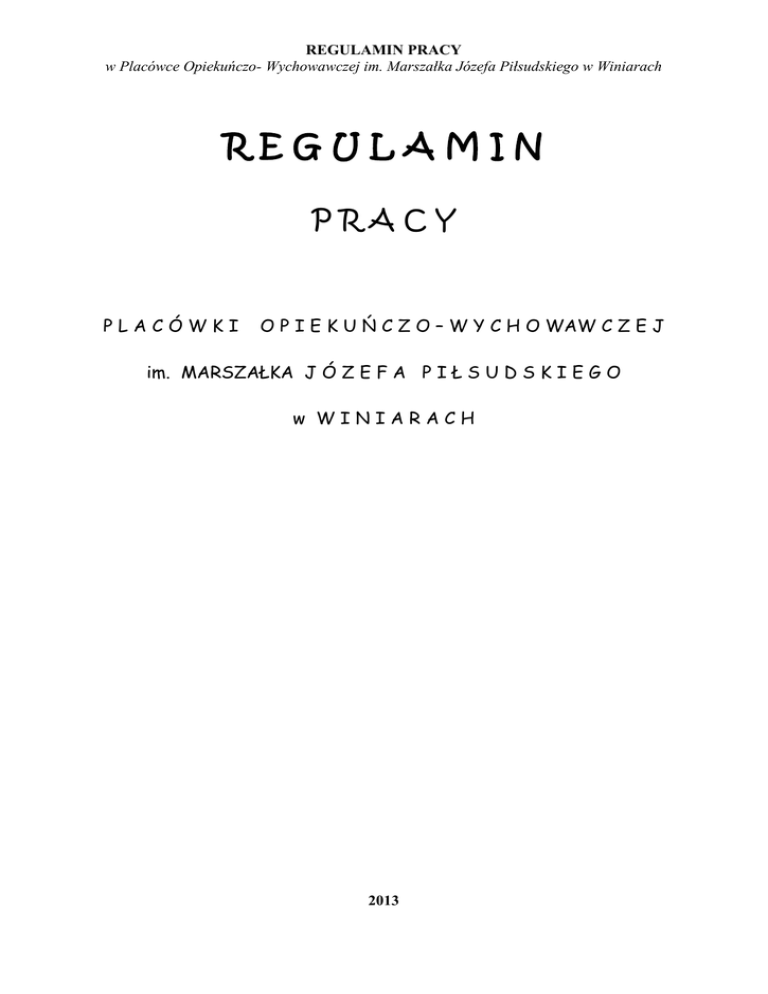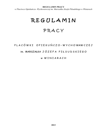 REGULAMIN PRACY w Placówce Opiekuńczo- Wychowawczej im. Marszałka Józefa Piłsudskiego w Winiarach REGULAMIN PRACY PLACÓWKI O P I E K U Ń C Z O – W Y C H O WAW C Z E J im. MARSZAŁKA J Ó Z E F A P I Ł S U D S K I E G O w WINIARACH 2013 REGULAMIN PRACY w Placówce Opiekuńczo- Wychowawczej im. Marszałka Józefa Piłsudskiego w Winiarach 1 Przepisy wstępne §1 1. Regulamin pracy zwany dalej regulaminem ustala organizację i porządek w procesie pracy w Placówce Opiekuńczo- Wychowawczej w Winiarach zwanej dalej placówką oraz związane z tym prawa i obowiązki pracodawcy i pracowników. 2. Postanowienia ogólne regulaminu dotyczą wszystkich pracowników bez względu na rodzaj wykonywanej pracy i zajmowane stanowisko. 3. Dyrektor placówki zapoznaje wszystkich pracowników z pracownikiem nowoprzyjmowanym oraz zaznajamia go z przepisami dotyczącymi funkcjonowania placówki, a przede wszystkim z jego obowiązkami oraz z wykazem spraw stanowiących tajemnicę służbową. 4. Pracownik składa oświadczenie o zapoznaniu się z obowiązującymi w placówce regulaminami. Oświadczenie umieszcza się w aktach osobowych. 5. W następnej kolejności pracownik kierowany jest do specjalisty ds. bhp i ppoż. w celu zapoznania się z przepisami bezpieczeństwa i higieny pracy i przepisami przeciwpożarowymi obowiązującymi na terenie Placówki Opiekuńczo- Wychowawczej w Winiarach. Oświadczenie o znajomości przepisów bhp i ppoż., podpisane przez pracownika umieszcza się w aktach osobowych. 6. Pracownik obowiązany jest bez zbędnej zwłoki dostarczyć wszelkie dokumenty, które mogą rodzić przyszłe skutki finansowe, np. warunkujące otrzymanie dodatku za staż pracy lub nagrodę jubileuszową. Po uzupełnieniu dokumentów prawo do otrzymania świadczeń przysługuje pracownikowi począwszy od następnego miesiąca, chyba, że przepisy szczególne stanowią inaczej. Pracownik odpowiedzialny za prawidłowe prowadzenie akt osobowych obowiązany jest każde zaświadczenie zaopatrzyć datą wpływu. §2 Ilekroć w regulaminie jest mowa o: 1) pracodawcy – należy przez to rozumieć Placówkę Opiekuńczo- Wychowawczą w Winiarach, reprezentowaną przez dyrektora, 2) pracowniku – należy przez to rozumieć osoby zatrudnione w placówce na podstawie: a) powołania, b) umowy o pracę, - na czas określony, -2- REGULAMIN PRACY w Placówce Opiekuńczo- Wychowawczej im. Marszałka Józefa Piłsudskiego w Winiarach - na czas nieokreślony, - na okres próbny, - na czas zastępstwa (art. 25 § 1 Kodeksu pracy) Nie są pracownikami osoby świadczące pracę na podstawie umowy o dzieło lub umowy- zlecenia; 3) przepisach prawa – należy przez to rozumieć przepisy kodeksu pracy oraz przepisy innych ustaw i aktów wykonawczych określające prawa i obowiązki pracowników i pracodawcy; 4) zakładzie pracy lub terenie zakładu pracy – należy przez to rozumieć miejsca gdzie świadczona jest praca także w czasie podróży służbowych; 5) przełożonych – należy przez to rozumieć osoby uprawnione zgodnie z przepisami prawa do wydawania poleceń służbowych konkretnym pracownikom; 6) klientach – należy przez to rozumieć wychowanków, wychowawców, pracowników administracji i obsługi, wykonawców robót zleconych, rodziców, sponsorów, osoby współpracujące z placówką np.: nauczyciele, policjanci, sędziowie, kuratorzy; 7) regulaminie – należy przez to rozumieć niniejszy dokument. 2 POSTANOWIENIA DOTYCZĄCE ORGANIZACJI PRACY, ŁADU I PORZĄDKU §3 1. W celu zapewnienia kontroli obecności oraz punktualnego rozpoczęcia pracy, pracownik ma obowiązek potwierdzenia przybycia do pracy i obecności w pracy poprzez złożenie własnoręcznego podpisu na liście obecności. 2. Pracownik powinien przebywać na swoim stanowisku pracy. Jeśli pracownik z ważnych przyczyn musi opuścić teren zakładu pracy w czasie pracy, godzinę wyjścia i powrotu powinien zgłosić pracodawcy (przełożonemu). 3. Czas wyjścia i powrotu pracownika w celach służbowych i prywatnych w godzinach pracy należy odnotować w odrębnej ewidencji prowadzonej w sekretariacie. Fakt ten winien być potwierdzony własnoręcznym podpisem. 4. Przebywanie pracownika na terenie zakładu pracy poza godzinami pracy dozwolone jest tylko po wyrażeniu zgody przez pracodawcę (przełożonego). -3- REGULAMIN PRACY w Placówce Opiekuńczo- Wychowawczej im. Marszałka Józefa Piłsudskiego w Winiarach §4 Zabronione jest wykonywanie na terenie zakładu pracy przez pracownika jakichkolwiek prac na rachunek prywatny bez uprzedniej zgody pracodawcy. Zakaz dotyczy także pracy wykonywanej poza godzinami pracy. §5 Używanie telefonów służbowych dla celów prywatnych dozwolone jest wyłącznie po uzyskaniu zgody przełożonego. Koszty prywatnych połączeń telefonicznych powinny zostać pokryte przez pracownika. §6 1. Palenie tytoniu na terenie zakładu pracy jest zabronione. §7 1. Pracownik jest obowiązany zawiadomić swojego przełożonego o wszelkich przeszkodach w procesie pracy. 2. Po zakończeniu pracy pracownik jest obowiązany uporządkować swoje miejsce pracy, schować narzędzia pracy i dokumenty w miejscu na ten cel przeznaczony oraz sprawdzić, czy pozostawione pomieszczenie nie stanowi zagrożenia pożarowego, zabezpieczyć pomieszczenie. §8 Pracodawca w przypadkach uzasadnionych jego potrzebami może powierzyć pracownikowi na okres nie przekraczający 3 miesięcy w roku kalendarzowym inną pracę, niż to wynika z umowy o pracę, odpowiadającą jego kwalifikacjom, za tym samym wynagrodzeniem. §9 Pracownik obowiązany jest niezwłocznie zawiadomić pracodawcę o wszelkich zmianach w stanie rodzinnym, warunkujących nabycie lub utratę właściwych świadczeń. § 10 1. Pracownik jest obowiązany do przestrzegania tajemnicy dotyczącej funkcjonowania pracodawcy jak np. stan finansów, działalności handlowej, struktury organizacyjnej, wysokości wynagrodzeń (w tym własnego) oraz wiadomości s