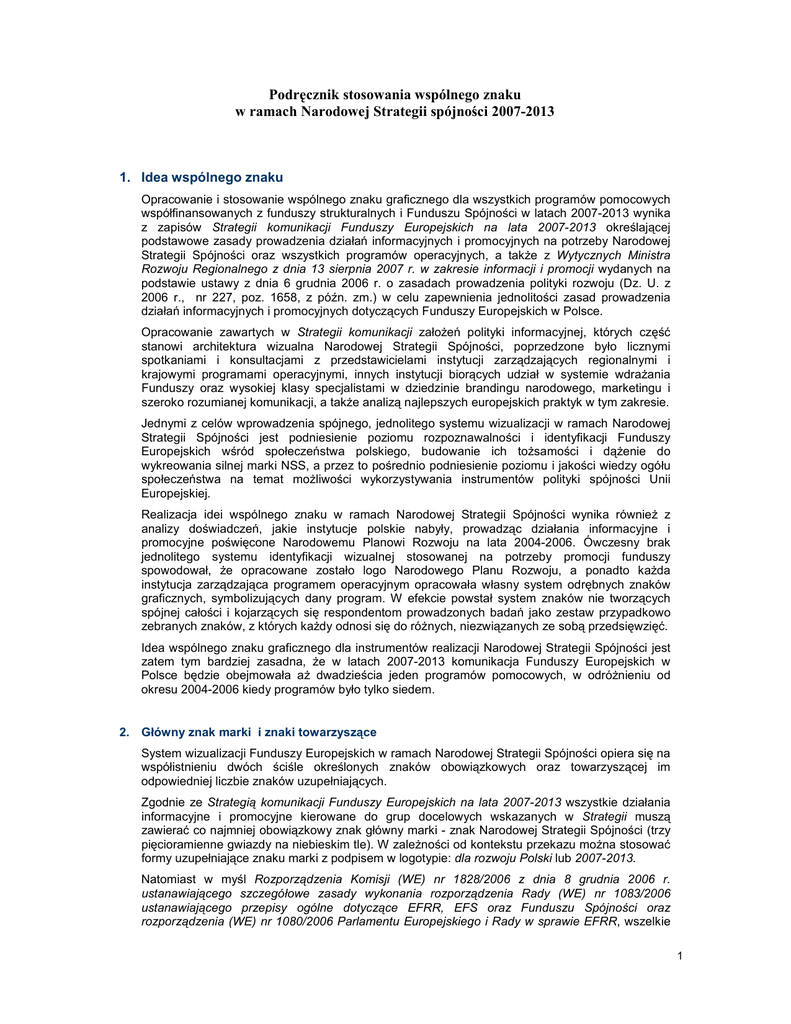Podręcznik stosowania wspólnego znaku w ramach Narodowej Strategii spójności 2007-2013 1. Idea wspólnego znaku Opracowanie i stosowanie wspólnego znaku graficznego dla wszystkich programów pomocowych współfinansowanych z funduszy strukturalnych i Funduszu Spójności w latach 2007-2013 wynika z zapisów Strategii komunikacji Funduszy Europejskich na lata 2007-2013 określającej podstawowe zasady prowadzenia działań informacyjnych i promocyjnych na potrzeby Narodowej Strategii Spójności oraz wszystkich programów operacyjnych, a takŜe z Wytycznych Ministra Rozwoju Regionalnego z dnia 13 sierpnia 2007 r. w zakresie informacji i promocji wydanych na podstawie ustawy z dnia 6 grudnia 2006 r. o zasadach prowadzenia polityki rozwoju (Dz. U. z 2006 r., nr 227, poz. 1658, z późn. zm.) w celu zapewnienia jednolitości zasad prowadzenia działań informacyjnych i promocyjnych dotyczących Funduszy Europejskich w Polsce. Opracowanie zawartych w Strategii komunikacji załoŜeń polityki informacyjnej, których część stanowi architektura wizualna Narodowej Strategii Spójności, poprzedzone było licznymi spotkaniami i konsultacjami z przedstawicielami instytucji zarządzających regionalnymi i krajowymi programami operacyjnymi, innych instytucji biorących udział w systemie wdraŜania Funduszy oraz wysokiej klasy specjalistami w dziedzinie brandingu narodowego, marketingu i szeroko rozumianej komunikacji, a takŜe analizą najlepszych europejskich praktyk w tym zakresie. Jednymi z celów wprowadzenia spójnego, jednolitego systemu wizualizacji w ramach Narodowej Strategii Spójności jest podniesienie poziomu rozpoznawalności i identyfikacji Funduszy Europejskich wśród społeczeństwa polskiego, budowanie ich toŜsamości i dąŜenie do wykreowania silnej marki NSS, a przez to pośrednio podniesienie poziomu i jakości wiedzy ogółu społeczeństwa na temat moŜliwości wykorzystywania instrumentów polityki spójności Unii Europejskiej. Realizacja idei wspólnego znaku w ramach Narodowej Strategii Spójności wynika równieŜ z analizy doświadczeń, jakie instytucje polskie nabyły, prowadząc działania informacyjne i promocyjne poświęcone Narodowemu Planowi Rozwoju na lata 2004-2006. Ówczesny brak jednolitego systemu identyfikacji wizualnej stosowanej na potrzeby promocji funduszy spowodował, Ŝe opracowane zostało logo Narodowego Planu Rozwoju, a ponadto kaŜda instytucja zarządzająca programem operacyjnym opracowała własny system odrębnych znaków graficznych, symbolizujących dany program. W efekcie powstał system znaków nie tworzących spójnej całości i kojarzących się respondentom prowadzonych badań jako zestaw przypadkowo zebranych znaków, z których kaŜdy odnosi się do róŜnych, niezwiązanych ze sobą przedsięwzięć. Idea wspólnego znaku graficznego dla instrumentów realizacji Narodowej Strategii Spójności jest zatem tym bardziej zasadna, Ŝe w latach 2007-2013 komunikacja Funduszy Europejskich w Polsce będzie obejmowała aŜ dwadzieścia jeden programów pomocowych, w odróŜnieniu od okresu 2004-2006 kiedy programów było tylko siedem. 2. Główny znak marki i znaki towarzyszące System wizualizacji Funduszy Europejskich w ramach Narodowej Strategii Spójności opiera się na współistnieniu dwóch ściśle określonych znaków obowiązkowych oraz towarzyszącej im odpowiedniej liczbie znaków uzupełniających. Zgodnie ze Strategią komunikacji Funduszy Europejskich na lata 2007-2013 wszystkie działania informacyjne i promocyjne kierowane do grup docelowych wskazanych w Strategii muszą zawierać co najmniej obowiązkowy znak główny marki - znak Narodowej Strategii Spójności (trzy pięcioramienne gwiazdy na niebieskim tle). W zaleŜności od kontekstu przekazu moŜna stosować formy uzupełniające znaku marki z podpisem w logotypie: dla rozwoju Polski lub 2007-2013. Natomiast w myśl Rozporządzenia Komisji (WE) nr 1828/2006 z dnia 8 grudnia 2006 r. ustanawiającego szczegółowe zasady wykonania rozporządzenia Rady (WE) nr 1083/2006 ustanawiającego przepisy ogólne dotyczące EFRR, EFS oraz Funduszu Spójności oraz rozporządzenia (WE) nr 1080/2006 Parlamentu Europejskiego i Rady w sprawie EFRR, wszelkie 1 działania komunikacyjne kierowane do grup docelowych muszą być obowiązkowo oznaczone co najmniej emblematem Unii Europejskiej (dwanaście złotych pięcioramiennych gwiazd na błękitnym tle). Ponadto, dwóm znakom obowiązkowym towarzyszą znaki uzupełniające symbolizujące odpowiedni region, instytucję zarządzającą, pośredniczącą lub wdraŜającą. 3. Opis symboliczny głównego znaku graficznego Niebieskie tło symbolizujące uchylone okno z widokiem na niebo tworzy kadr przestrzeni, świata, w którym lecą, wchodzą połączone gwiazdy. Symbolika gwiazd nawiązuje do flagi Unii Europejskiej poprzez Ŝółty kolor jednej z nich oraz niebieski kolor tła. Nawiązuje równieŜ do flagi Polski – poprzez kolor biały i czerwony pozostałych dwóch gwiazd. Charakter graficzny gwiazd nasuwa skojarzenia z postaciami ludzi, wprowadzając tym samym w symbolikę aspekt ludzki. Połączenie gwiazd symbolizuje zjawisko synergii, współpracy róŜnych czynników, których efekt jest większy niŜ suma ich oddzielnego działania. Symbolika gwiazd poprzez kolor mówi równieŜ o wspólnocie Unii Europejskiej, jej sile i trwałości. 4. Opis heraldyczny głównego znaku graficznego Na niebieskim tle trzy pięcioramienne gwiazdy dotykające się ramionami. U góry gwiazda w kolorze białym, u dołu z lewej strony gwiazda w kolorze Ŝółtym, u dołu z prawej strony gwiazda w kolorze czerwonym. Górne i dolne lewe ramiona gwiazdy Ŝółtej wykraczają poza niebieskie tło. Górne i dolne prawe ramiona gwiazdy czerwonej są niewidoczne. 5. Oryginalność regionów Spójny system wizualizacji programów operacyjnych w ramach Funduszy Europejskich na lata 2007-2013 został skonstruowany w taki sposób, aby z jednej st
