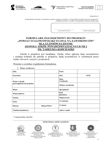 Załącznik nr 2 do Regulaminu rekrutacji i uczestnictwa uczniów/ uczennic w projekcie „ Powiat Stalowowolski stawia na zawodowców” współfinansowanym ze środków Europejskiego Funduszu Społecznego ………………………….. …………………….. ( data i godzina złożenia ) (podpis przyjmującego) FORMULARZ ZGŁOSZENIOWY DO PROJEKTU „POWIAT STALOWOWOLSKI STAWIA NA ZAWODOWCÓW” DLA UCZNIÓW/UCZENNIC ZESPOŁU SZKÓŁ PONADGIMNAZJALNYCH NR 2 IM. TADEUSZA KOŚCIUSZKI Udział w projekcie jest bezpłatny. Osoby, które zgłoszą chęć uczestnictwa i zostaną wybrane do udziału w projekcie, będą uczestniczyć w wybranych przez siebie: kursach, stażach i praktykach. Prosimy o czytelne wypełnienie formularza. I. Dane osobowe: Imię Pesel Nazwisko Płeć K/M* Data Urodzenia Wiek w chwili przystąpienia do projektu Miejsce urodzenia Klasa Specjalność Województwo Kod pocztowy Gmina Miejscowość Ulica Nr budynku Obszar Miasto/Wieś* Telefon kontaktowy Nr lokalu Adres e-mail * niepotrzebne skreślić Szkoły biorące udział w projekcie: Centrum Edukacji Zawodowej w Stalowej Woli Centrum Kształcenia Ustawicznego i Ośrodek Dokształcania i Doskonalenia Zawodowego w Stalowej Woli Zespół Szkół Ponadgimnazjalnych Nr 1 im. Władysława Sikorskiego w Stalowej Woli Zespół Szkół Ponadgimnazjalnych Nr 2 im. Tadeusza Kościuszki w Stalowej Woli Zespół Szkół Ponadgimnazjalnych Nr 3 im. Króla Jana III Sobieskiego w Stalowej Woli 1 II. Dane uczestników: uczestnik indywidualny/pracownik lub przedstawiciel instytucji lub podmiotu* Kraj Imię Nazwisko PESEL KOBIETA/MĘŻCZYZNA* Płeć Wiek w chwili przystępowania do projektu Wykształcenie Województwo Powiat Gmina Miejscowość Ulica Nr budynku Nr lokalu Miasto/ Wieś* Obszar Kod pocztowy Telefon kontaktowy Adres poczty elektronicznej ( e-mail) Osoba należąca do mniejszości narodowej lub etnicznej, migrant, osoba obcego pochodzenia TAK/NIE* Osoba bezdomna lub dotknięta wykluczeniem z dostępu do mieszkań TAK/NIE* Osoba z niepełnosprawnościami TAK/NIE* Szkoły biorące udział w projekcie: Centrum Edukacji Zawodowej w Stalowej Woli Centrum Kształcenia Ustawicznego i Ośrodek Dokształcania i Doskonalenia Zawodowego w Stalowej Woli Zespół Szkół Ponadgimnazjalnych Nr 1 im. Władysława Sikorskiego w Stalowej Woli Zespół Szkół Ponadgimnazjalnych Nr 2 im. Tadeusza Kościuszki w Stalowej Woli Zespół Szkół Ponadgimnazjalnych Nr 3 im. Króla Jana III Sobieskiego w Stalowej Woli 2 Osoba przebywająca w gospodarstwie domowym bez osób pracujących W tym w gospodarstwie domowym z dziećmi na utrzymaniu TAK/NIE* TAK/NIE* Osoba żyjąca w gospodarstwie składającym się z jednej osoby dorosłej i dzieci pozostających na utrzymaniu TAK/NIE* Osoba w innej niekorzystnej sytuacji społecznej ( innej niż w wymienione powyżej) TAK/NIE* Przynależność do grupy docelowej TAK/NIE* * niepotrzebne skreślić III. Wybór formy wsparcia: WYBÓR FORMY WSPARCIA LP. NAZWA ZAJĘĆ 1. 2. 3. 4. 5. 6. 7. 8. 9. 10. 11. 12. 13. Staż u pracodawcy/Technikum Praktyka u pracodawcy/Zasadnicza Szkoła Zawodowa Kurs kreatywnego projektowania kroju i szycia Kurs obsługi kas fiskalnych Kurs operatora zagęszczarek i ubijaków wibracyjnych Kurs termomodernizacji budynków Kurs tynkowania z agregatem tynkarskim Nowe techniki dekoracji i wykańczania wnętrz Kurs zaawansowanej obsługi pakietu biurowego i formularzy Google Kurs obsługi elektronicznych terminali ładunkowych Kurs Uczymy się działania mikro firmy transportowej i przewozu osób Kurs obsługi systemu ISCALA Szkolenie zawodowe SEP Kurs kosztorysowania robót budowlanych w programie komputerowym RODOS Kurs kosztorysowania robót budowlanych w programie komputerowym dla branży sanitarnej Kurs grafiki 3D Kurs fotografii cyfrowej Kurs grafiki cyfrowej w poligrafii Kurs projektowania w programie AutoCAD z egzaminem zewnętrznym 14. 15. 16. 17. 18. 19. Szkoły biorące udział w projekcie: Centrum Edukacji Zawodowej w Stalowej Woli Centrum Kształcenia Ustawicznego i Ośrodek Dokształcania i Doskonalenia Zawodowego w Stalowej Woli Zespół Szkół Ponadgimnazjalnych Nr 1 im. Władysława Sikorskiego w Stalowej Woli Zespół Szkół Ponadgimnazjalnych Nr 2 im. Tadeusza Kościuszki w Stalowej Woli Zespół Szkół Ponadgimnazjalnych Nr 3 im. Króla Jana III Sobieskiego w Stalowej Woli 3 20. 21. 22. Kurs obsługi sprzętu geodezyjnego Kurs eksperymenty z energią odnawialną Kurs operatora wózków jezdniowych z napędem silnikowym zakończonym egzaminem UDT …………………... Miejscowość i data …………………………………………………… Czytelny podpis uczestnika/uczestniczki projektu ………………………….………………………… Czytelny podpis rodzica/opiekuna prawnego (Wymagany jeżeli uczeń/uczennica w momencie rekrutacji nie ma ukończonych 18-tu lat) IV. Kryteria rekrutacyjne Informacje o uczniu/uczennicy:1 1. Lp. Nazwa kryterium Informacja 1. Opinia wychowawcy klasy, dotycząca przydatności wsparcia dla danego ucznia/uczennicy (TAK/NIE) 2. Ocena wychowawcy z zachowania (skala: wzorowe, bardzo dobre, dobre, poprawne, nieodpowiednie, naganne) 3. Średnia ocen z przedmiotów zawodowych za ostatni rok nauki 2. Informacja ucznia/uczennicy:2 a) Uzasadnienie uczestnictwa „list motywacyjny” ucznia/uczennicy ………………………………………………………………………………………………………….... ………………………………………………………………………………………………………….... ………………………………………………………………………………………………………….... …………………………………………………………………………………………………………... …………………………………………………………………………………………………………... ………
