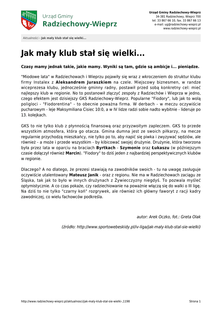 Urząd Gminy Radziechowy-Wieprz 34-381 Radziechowy, Wieprz 700 tel. 33 867 66 10, fax. 33 867 66 13 e-mail: [email protected] www.radziechowy-wieprz.pl Aktualności › Jak mały klub stał się wielki... Jak mały klub stał się wielki... Czasy mamy jednak takie, jakie mamy. Wyniki są tam, gdzie są ambicje i... pieniądze. "Miodowe lata" w Radziechowach i Wieprzu pojawiły się wraz z wkroczeniem do struktur klubu firmy Instalex z Aleksandrem Juraszkiem na czele. Miejscowy biznesmen, w randze wiceprezesa klubu, jednocześnie gminny radny, postawił przed sobą konkretny cel: mieć najlepszy klub w regionie. No to postanowił złączyć zespoły z Radziechów i Wieprza w jedno, czego efektem jest dzisiejszy GKS Radziechowy-Wieprz. Popularne "Fiodory", lub jak to wolą poligloci - "Fiodorentina" - to obecnie poważna firma. W derbach - w meczu oczywiście pucharowym - leje Maksymiliana Cisiec 10:0, a w IV lidze radzi sobie nadto wybitnie - lideruje po 13. kolejkach. GKS to nie tylko klub z płynnością finansową oraz przyzwoitym zapleczem. GKS to przede wszystkim atmosfera, która go otacza. Gmina dumna jest ze swoich piłkarzy, na mecze regularnie przychodzą mieszkańcy, nie tylko po to, aby napić się piwka i zwyzywać sędziów, ale również - a może i przede wszystkim - by kibicować swojej drużynie. Drużynie, która tworzona była przez lata w oparciu na braciach Byrtkach - Szymonie oraz Łukaszu (w późniejszym czasie dołączył również Marcin). "Fiodory" to dziś jeden z najbardziej perspektywicznych klubów w regionie. Dlaczego? A no dlatego, że prezesi stawiają na zawodników swoich - tu na uwagę zasługuje oczywiście utalentowany Mateusz Janik - oraz z regionu. Nie ma w Radziechowach zaciągu ze Śląska, tak jak to było w innych drużynach z Żywiecczyzny niegdyś. To pozwala myśleć optymistycznie. A co czas pokaże, czy radziechiowanie na poważnie włączą się do walki o III ligę. Na dziś to nie tylko "czarny koń" rozgrywek, ale również ich główny faworyt z racji kadry zawodniczej, co wielu fachowców podkreśla. autor: Arek Oczko, fot.: Greta Olak (źródło: http://www.sportowebeskidy.pl/iv-liga/jak-maly-klub-stal-sie-wielki) http://www.radziechowy-wieprz.pl/aktualnosci/jak-maly-klub-stal-sie-wielki-,1198 Strona 1