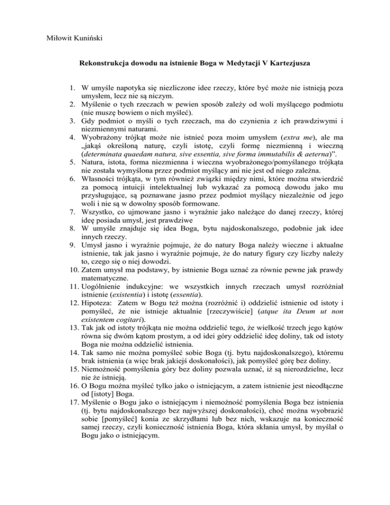 Miłowit Kuniński Rekonstrukcja dowodu na istnienie Boga w Medytacji V Kartezjusza 1. W umyśle napotyka się niezliczone idee rzeczy, które być może nie istnieją poza umysłem, lecz nie są niczym. 2. Myślenie o tych rzeczach w pewien sposób zależy od woli myślącego podmiotu (nie muszę bowiem o nich myśleć). 3. Gdy podmiot o myśli o tych rzeczach, ma do czynienia z ich prawdziwymi i niezmiennymi naturami. 4. Wyobrażony trójkąt może nie istnieć poza moim umysłem (extra me), ale ma „jakąś określoną naturę, czyli istotę, czyli formę niezmienną i wieczną (determinata quaedam natura, sive essentia, sive forma immutabilis & aeterna)”. 5. Natura, istota, forma niezmienna i wieczna wyobrażonego/pomyślanego trójkąta nie została wymyślona przez podmiot myślący ani nie jest od niego zależna. 6. Własności trójkąta, w tym również związki między nimi, które można stwierdzić za pomocą intuicji intelektualnej lub wykazać za pomocą dowodu jako mu przysługujące, są poznawane jasno przez podmiot myślący niezależnie od jego woli i nie są w dowolny sposób formowane. 7. Wszystko, co ujmowane jasno i wyraźnie jako należące do danej rzeczy, której ideę posiada umysł, jest prawdziwe 8. W umyśle znajduje się idea Boga, bytu najdoskonalszego, podobnie jak idee innych rzeczy. 9. Umysł jasno i wyraźnie pojmuje, że do natury Boga należy wieczne i aktualne istnienie, tak jak jasno i wyraźnie pojmuje, że do natury figury czy liczby należy to, czego się o niej dowodzi. 10. Zatem umysł ma podstawy, by istnienie Boga uznać za równie pewne jak prawdy matematyczne. 11. Uogólnienie indukcyjne: we wszystkich innych rzeczach umysł rozróżniał istnienie (existentia) i istotę (essentia). 12. Hipoteza: Zatem w Bogu też można (rozróżnić i) oddzielić istnienie od istoty i pomyśleć, że nie istnieje aktualnie [rzeczywiście] (atque ita Deum ut non existentem cogitari). 13. Tak jak od istoty trójkąta nie można oddzielić tego, że wielkość trzech jego kątów równa się dwóm kątom prostym, a od idei góry oddzielić ideę doliny, tak od istoty Boga nie można oddzielić istnienia. 14. Tak samo nie można pomyśleć sobie Boga (tj. bytu najdoskonalszego), któremu brak istnienia (a więc brak jakiejś doskonałości), jak pomyśleć górę bez doliny. 15. Niemożność pomyślenia góry bez doliny pozwala uznać, iż są nierozdzielne, lecz nie że istnieją. 16. O Bogu można myśleć tylko jako o istniejącym, a zatem istnienie jest nieodłączne od [istoty] Boga. 17. Myślenie o Bogu jako o istniejącym i niemożność pomyślenia Boga bez istnienia (tj. bytu najdoskonalszego bez najwyższej doskonałości), choć można wyobrazić sobie [pomyśleć] konia ze skrzydłami lub bez nich, wskazuje na konieczność samej rzeczy, czyli konieczność istnienia Boga, która skłania umysł, by myślał o Bogu jako o istniejącym.