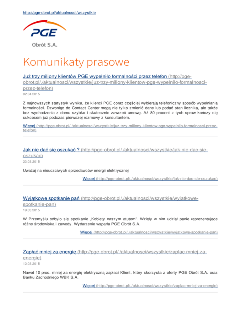 http://pge-obrot.pl/aktualnosci/wszystkie Komunikaty prasowe Już trzy miliony klientów PGE wypełniło formalności przez telefon (http://pgeobrot.pl/./aktualnosci/wszystkie/juz-trzy-miliony-klientow-pge-wypelnilo-formalnosciprzez-telefon) 02.04.2015 Z najnowszych statystyk wynika, że klienci PGE coraz częściej wybierają telefoniczny sposób wypełniania formalności. Dzwoniąc do Contact Center mogą nie tylko zmienić dane lub podać stan licznika, ale także bez wychodzenia z domu szybko i skutecznie zawrzeć umowę. Aż 80 procent z tych spraw kończy się sukcesem już podczas pierwszej rozmowy z konsultantem. Więcej (http://pge-obrot.pl/./aktualnosci/wszystkie/juz-trzy-miliony-klientow-pge-wypelnilo-formalnosci-przeztelefon) Jak nie dać się oszukać ? (http://pge-obrot.pl/./aktualnosci/wszystkie/jak-nie-dac-sieoszukac) 23.03.2015 Uważaj na nieuczciwych sprzedawców energii elektrycznej Więcej (http://pge-obrot.pl/./aktualnosci/wszystkie/jak-nie-dac-sie-oszukac) Wyjątkowe spotkanie pań (http://pge-obrot.pl/./aktualnosci/wszystkie/wyjatkowespotkanie-pan) 19.03.2015 W Przemyślu odbyło się spotkanie „Kobiety naszym atutem”. Wzięły w nim udział panie reprezentujące różne środowiska i zawody. Wydarzenie wsparła PGE Obrót S.A. Więcej (http://pge-obrot.pl/./aktualnosci/wszystkie/wyjatkowe-spotkanie-pan) Zapłać mniej za energię (http://pge-obrot.pl/./aktualnosci/wszystkie/zaplac-mniej-zaenergie) 12.03.2015 Nawet 10 proc. mniej za energię elektryczną zapłaci Klient, który skorzysta z oferty PGE Obrót S.A. oraz Banku Zachodniego WBK S.A. Więcej (http://pge-obrot.pl/./aktualnosci/wszystkie/zaplac-mniej-za-energie) Królewskie światło (http://pge-obrot.pl/./aktualnosci/wszystkie/krolewskie-swiatlo) 13.02.2015 Już w najbliższy weekend w warszawskim Wilanowie odbędzie się Królewski Festiwal Światła. Organizatorzy przygotowali mnóstwo atrakcji m.in. niezwykłe spektakle świetlne oraz show laserowe i taneczne. Więcej (http://pge-obrot.pl/./aktualnosci/wszystkie/krolewskie-swiatlo)