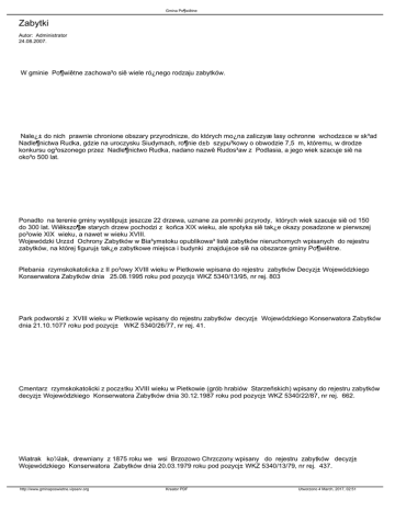 Gmina Po¶wiêtne Zabytki Autor: Administrator 24.08.2007. W gminie Po¶wiêtne zachowa³o siê wiele ró¿nego rodzaju zabytków. Nale¿± do nich prawnie chronione obszary przyrodnicze, do których mo¿na zaliczyæ lasy ochronne wchodz±ce w sk³ad Nadle¶nictwa Rudka, gdzie na uroczysku Siudymach, ro¶nie d±b szypu³kowy o obwodzie 7,5 m, któremu, w drodze konkursu og³oszonego przez Nadle¶nictwo Rudka, nadano nazwê Rudos³aw z Podlasia, a jego wiek szacuje siê na oko³o 500 lat. Ponadto na terenie gminy wystêpuj± jeszcze 22 drzewa, uznane za pomniki przyrody, których wiek szacuje siê od 150 do 300 lat. Wiêkszo¶æ starych drzew pochodzi z koñca XIX wieku, ale spotyka siê tak¿e okazy posadzone w pierwszej po³owie XIX wieku, a nawet w wieku XVIII. Wojewódzki Urz±d Ochrony Zabytków w Bia³ymstoku opublikowa³ listê zabytków nieruchomych wpisanych do rejestru zabytków, na której figuruj± tak¿e zabytkowe miejsca i budynki znajduj±ce siê na obszarze gminy Po¶wiêtne. Plebania rzymskokatolicka z II po³owy XVIII wieku w Pietkowie wpisana do rejestru zabytków Decyzj± Wojewódzkiego Konserwatora Zabytków dnia 25.08.1995 roku pod pozycj± WKZ 5340/13/95, nr rej. 803 Park podworski z XVIII wieku w Pietkowie wpisany do rejestru zabytków decyzj± Wojewódzkiego Konserwatora Zabytków dnia 21.10.1077 roku pod pozycj± WKZ 5340/26/77, nr rej. 41. Cmentarz rzymskokatolicki z pocz±tku XVIII wieku w Pietkowie (grób hrabiów Starzeñskich) wpisany do rejestru zabytków decyzj± Wojewódzkiego Konserwatora Zabytków dnia 30.12.1987 roku pod pozycj± WKZ 5340/22/87, nr rej. 662. Wiatrak ko¼lak, drewniany z 1875 roku we wsi Brzozowo Chrzczony wpisany do rejestru zabytków decyzj± Wojewódzkiego Konserwatora Zabytków dnia 20.03.1979 roku pod pozycj± WKZ 5340/13/79, nr rej. 437. http://www.gminaposwietne.vipserv.org Kreator PDF Utworzono 4 March, 2017, 02:51 Gmina Po¶wiêtne Na terenie gminy Po¶wiêtne znajduje siê tak¿e wiele obiektów o charakterze zabytkowym, które nie zosta³y wpisane do rejestru zabytków, ale uwzglêdniono je w publikacji z 1992 roku dotycz±cej zabytków i budownictwa w województwie bia³ostockim. Ceglany neogotycki ko¶ció³ z pocz±tków XX wieku (1906 - 1907r) w Po¶wiêtnem, wpisany do rejestru zabytków decyzj± Wojewódzkiego Konserwatora Zabytków dnia 11.03.2009 roku pod nr: A -226. Przy ko¶ciele znajduje siê równie¼ ogrodzenie z pocz±tku XX w. wpisane do rejestru zabytków pod nr. A - 226 z dnia 11.03.2009 r. Lp. Lokalizacja Opis 1. Marynki Obora dworska z pocz±tku XX wieku, murowana z kamienia 2. Pietkowo Ko¶ció³ murowany z lat 20 XX wieku 3. Pietkowo Obora drewniano murowana z koñca XIX wieku http://www.gminaposwietne.vipserv.org Kreator PDF Utworzono 4 March, 2017, 02:51 Gmina Po¶wiêtne 4. Pietkowo Stodo³a drewniano murowana z koñca XIX wieku 5. Pietkowo Grobowiec rodziny Starzeñskich na cmentarzu grzebalnym, z II po³owy XIX wieku 6. Pietkowo Dom ogrodnika, murowany z pocz±tku XX wieku 7. Pietkowo Stajnia z obor±, murowana z XIX wieku 8. Pietkowo Gorzelnia, murowana z pocz±tku XX wieku 9. Pietkowo Dom mieszkalny przy gorzelni, murowany, z 1901 roku http://www.gminaposwietne.vipserv.org Kreator PDF Utworzono 4 March, 2017, 02:51 Gmina Po¶wiêtne 10. Pietkowo Budynek gospodarczy przy gorzelni, murowany, z pocz±tku XX wieku 11. Pietkowo Magazyn dworski, murowany z 1904 roku 12. Pietkowo Budynki mieszkalne, drewniane z koñca XIX wieku 13. Po¶wiêtne Ko¶ció³ parafialny, murowany z 1906 roku 14. Po¶wiêtne Ogrodzenie murowane z 1906 roku 15. Liza Stara Lamus z pocz±tku XX wieku http://www.gminaposwietne.vipserv.org Kreator PDF Utworzono 4 March, 2017, 02:51 Gmina Po¶wiêtne 17. Grochy Cmentarzyska kurhanowe z okresu rzymskiego- pozosta³o¶æ kultury wielborskiej Na obszarze omawianej gminy zlokalizowano równie¿ 122 stanowiska archeologiczne, które s± ¶wiadectwem kszta³towania siê na tych terenach osadnictwa pradziejowego, koncentruj±cego siê g³ównie na stokach i w dolinie rzeki Lizy oraz w bezpo¶rednim s±siedztwie doliny zalewowej. Najwiêksz± liczbê stanowisk archeologicznych odkryto we wsiach: Pietkowo (19), Liza Stara (16), Go³êbie (9), Grochy (8), Zdrody Stare (7), £ukawica (6), które pochodz± z okresu staro¿ytnego, epoki kamienia i br±zu, epoki ¿elaza, a tak¿e z epoki wp³ywów rzymskich, ¶redniowiecza i okresu nowo¿ytnego. Cennymi obiektami sztuki ludowej s± te¿ krzy¿e i kapliczki przydro¿ne, np. murowana kapliczka z XVIII wieku zwana Latarni± Zmar³ych usytuowana przy drodze z Pietkowa do Kamiennego Dworu. http://www.gminaposwietne.vipserv.org Kreator PDF Utworzono 4 March, 2017, 02:51