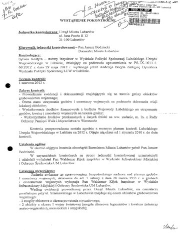 言一一年ヶ aSta Lubart帥 PauIarrl?二つ1_ 多′ ∠「レ瑠 戯㌢ PrZyJeto prZeZ. WSTAPIENIEPOKON Illlll州州IlllllllIIIllI州 のeFの02cI3 Jednostkakontrolowana: Urz社MiastaLubartdw ul.JanaPawIaII12 21−100LubaHew Kierownikiednostkikontrolowanej−PanJanuszBodziacki BumistrzMiastaLubartdw Kontroluiacy; SylwiaKostyra−StarSZyinspektorwWydzialePolitykiSpoIeczneiLubelskiego Urzedu Wqjewddzkiego w Lublinie,dzia袖acy na podstavlrie upowaZnienia nr PS−IX・1611工 60.2012z dnia29maja2012r・VVdanego przez AndrzC担Borysa ZastepcQ Dyrektora WydziahPolitykiSpolecznqjLUWwLublinie・ Terminkontroli: 1czerwca2012r. Zakreskontroli: 一Prov,radzenie ewidenqjii dokumentaqii zn勾d可acych sie na terenie gmlny Obiekt6W grobownictwawqemego; 一〇Cena stanu utrzymania grobdwi cmentarzy wcuemych napodstawie dokonania wlZIl lokalneiobiektdw; −Wydatkowanie Srodkdw魚nansoWyCh z budZetu W勺ewody Lubelskiego na utrzymaJhe grobdw,kwatericmentarzyw(りemyChnatereniegmmy; −Wykorzystanie SrodkdwprzekazanychzimychZr6deInaww・Zadanie,m言n・ZRady OchronyPamieciWalkiMeczehstwawWarszawie KontrolaprzeprowadzonazostaあzgodniezrocznymplanemkontroliLubelskiego UrzQduWqiew6dzkiegowLubliniena2012r・Ot衰tonia_OkresodlstyCZnia2010r・dodnia kon血0li. Ustaleniaoがlne: ● WokresieobjetymkontrolaobowiazkiBumistrzaMiastaLubartdwpeIni士PanJanusz Bodziacki. W czymoSciach kontrolnych ze strony jednostki kontrolowanq uczestniczyli iudzielaliwy]aSniehPanWaldemarK恥kinspektorwWydzialeInfrastrukturyMi匂Skiej iOchronySrodowiskaUMLubartdw・ Ustaleniaszczeがlowe; Zadania zwlaZane Ze SPraWOWaniem bezpoSredniego nadzoru nad stanem grob6w i cmentarzy wqJemyCh,StOSOWnie do art・7ustawy z dnia28marca1933r・O grObach i cmentarzach wqIennyCh wykon可e Pan Waldemar Kiiekinspektor w Wydziale InfrastnkturyMiejskieiiOchonySrodowiskaUMLubart6W・ Wedhg ewidencji prowadzonや1PrZeZ Urz軸 Miasta Lubartdw,na CmentarZu para五alnymprzyuLSzaniawskiegowLubartowieznajd可esleOSiemobiektdwgrobownictwa WqemegO: −2mogityzbiorowezokresupowstaniastyczniowego; −20biektyzokresuIw(うny Swiatowej(mogiIazbiorowalegionistdwikwaterazohierzy austro−Wegierskich,niemieckichirosyiskich); レ勿4㌃ \\\ 一mOgiIazbiorowazw(りnyPOIsko−boIszewicki諒 −3mogi王yzbiorowezokresuIIwqJnySWiatowq. WedhIg eWidenqlPrOWadzonq przezLUWwLublinie,naCmentarZuPara五alnym Znajd可eslerbwnieZgr6bindywidualnyz01nierzaAKStanisIawaStaropiQtkaps.Stahczyk, ZamOrdowanegoprzezUB30.06.1946r. Nautrzymanie grobdwicmentarzywq,emyCh znaidLtiapych sie naterenie gmlny, W201lr.zbudzetuW〔蒔WOdyLubelskiegozostabrPrZyZnaneSrodkiWWSOkoSci10000zt (sbwnie:dziesieCtysiecyzねtych). W dniu 28 marca 201l r.Rada Miasta Lubartdw przyjda uchwalQ Nr V/29/ll wやra−Wiel砂raZenia zgoみ・na zaWarCieporozumieniapomiet吻)W匂eTV06弛 LlhelskimaGmintをMiastoLubart6TlJ. Na podstawie Porozumienia nrl13,2aWartegO POmiedzy Wqiewoda Lubelskim aBumistrzemMiastaLubartdwwdniullkwietnia2011rokuwsprawieutrzymaniagrob6w icmentarzyWq】emyChnatereniegminy,WQjewodaLubelskiprzekazatkwotelOOOOzL WramachprzyznanychSrodkdvlrWykonanoremontkompleksowymogiIyzbiorowq ludnoSci cywilnq,rOZStrZelanq przezNiemc6w w1939rっzn勾dLjqc碕Sle na CmentarZu Para丘alnym.Remont zosta土Ⅵykonany zgodnie z prqjektem pozytywnie zaopiniowanym PrZeZWqiewGdzkiKomitetOchronyPamieciWalkiMeczehstwaWrLublinie. Wydatki udokumentowane zostaIy faktura VAT1845/MAG/2011z dnia 5 paZdziemika 201l r.na kwote15 698 zt(sIowIlie:PietnaScie tySiecy szeSdset dziewieCdziesi*osiemz壬oti′Ch)・R62nicapomiQdzyprzyznana_PrZeZW勺ewodQLubelskiego dota壷akosztemwyko竺niazadaniazostahpokrytazbud摘ugminJr・ Nieprawid士owoSciwwkorzystaniudota(りlniestwierdzono. Nautrzyman19gT〕b6wicmentarzywcU平yChznajdt彊ychsiQnatereniegmmy, W2010r.i2012r.gmin云 ̄ni言otr両前k示電話an而重度丁  ̄budZetlrWOieWOdy二 Lubelskiego. W okresie ot)fetymkontrola_gminamnieuzyskaね瓦odkdw五nansoWyChzimych ZrddeZ,WtymZRadyOchronyPamieciWaLkiMeczehstwa. Podczas kontroli przeprowadzono wIZJe lokalna.nastQP即aCyCh obiektdw grobownictwawqIennegOZnajdujacychsienatereniegmlny: 1)嵩謹器詰器諾詩宗誓諸悪書誌嵩 e kraweZrhkami zn勾dLje sle POmnik z krzyzem・Na pomniku umieszczono napIS: BOHATEROMPOLEGLYMWWALCEONIEPODLEGLOSCWLATACH1831 I1863. WczasiekontrolistWierdzono,乞eobiektw1magaPrZePrOWadzeniakonserwaql・ 2)Mogikzbiorowazokresup叩StaniastyczniowegormogiIaziemaogrodzopa, WCZeScicentralnqznajdl*slePOmnik,naktdrymumleSZCZOnOtablice:TULEZA PROCHY POWSTANCOW Z 1863 ROKU Z ODDZIALOW LEWANDOWSKIEGOIBOGDANOWICZA ObiektⅥγmagaremOntu−POImikorazogrodzeniezapad勾往SleZjedn句StrOny. 3)MogiIazbioroyalegionistdwpoIskich−WgM・D祉〉rOVrSkiegoCmentarzewqTenne ZlatfwqTjv′SWiatol均Wddwym wdew dztwielubelskim,TNKUL2004S.119, WmOgilepochowano szcz車ki221eg10nistdwpoIskichekshumowanychw1934r. %ん_ z cmentarza wQJemegO W Koztdwce・Na pomiku znid函Sle 3 tablice memoratywne.NatablicySrodkowqzwylmtymOr士emznajdujeslenaPIS: LEGIONISTOM POLEGLYM NA TERENIE POWIATU LUBARTOWSKIEGO W1915R. Tablicazleweistrony: 1918−1988W70.ROCZNICEODZYSKANIANIEPODLEGLOScIZoLNIERZOM LEGIONISTOMZMARLYMPOIIIIWOJNIESWIATOWEJ BUDZYNsKILEONUR.1896ZM.2V1936R・LUBARTOW MALISZEWSKICZESLAWUR・1896R・ZM・25VII1944R・LUBARTOW cHAREZINsKIALEKSANDERUR・1887R・ZM・4III1947R・LUBARTOw MIDUCHJANUR.1896R・ZM・6XII1947R・LUBARTOW CZESCICHPAMIECI spoLECZENsTWOTETABLICEFUNDUJE1988LUBARTOw Tablicazpraw匂StrOny: 1918−1988W70.ROCZNICEODZYSKANIANIEPODLEGLOScIZoLNIERZOM LEGIONISTOMZMARLYMPOIIIIWOJNIESWIATOWEJ JANKOWSKIMIECZYSLAWUR.1898R・ZM・26VII1950R・LUBARTOw BUDZYNSKIJERZYUR・1880ZM・12V1952R・ JEZIOREDWARDUR工896R・ZM・9VII1957R・LUBARTOW CZESCICHPAMIECI spoLECZENsTWOTETABLICEFUNDUJELUBARTOwllXI1988R・ Obiektjestwstaniedobrym・ 4)Mogirazbiorowazokresuv南nypoIsko−boIszewicki5−namOgile空mneiz betonovrymikrawQZnikamiznajdlかS聖POmnikzkrzyzepl・NapomnikuumleSZCZOnO napis:POLEGLYMNAPOLUCHWALYPRZYODPIERANIUPODWODZA JOZEFAPILSUD